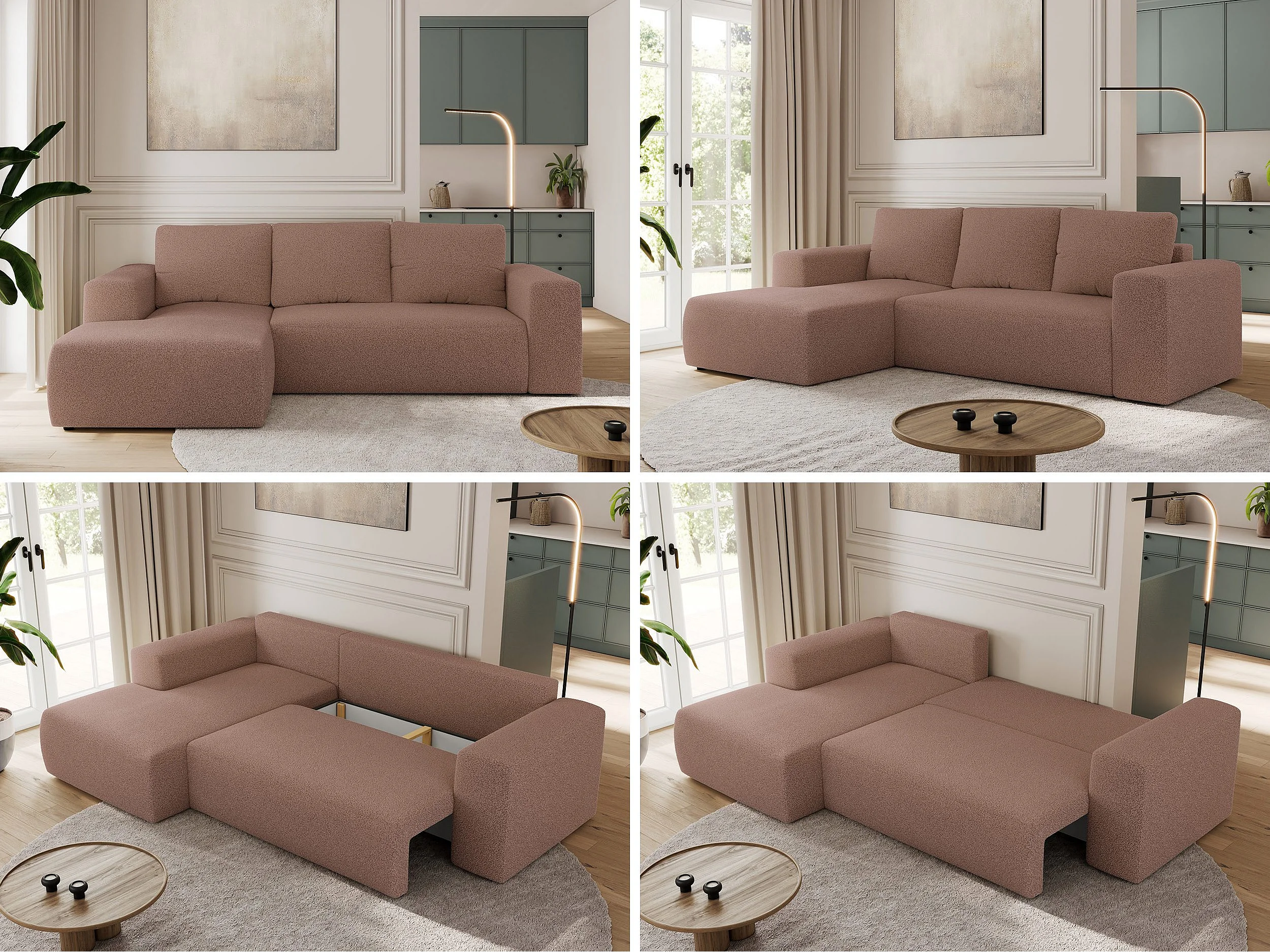 Ecksofa TRENTINO - mit Schlaffunktion und Bettkasten, L-form Couch, lose Kissen und Armlehnen - Rosa Boucle - Ecke Links