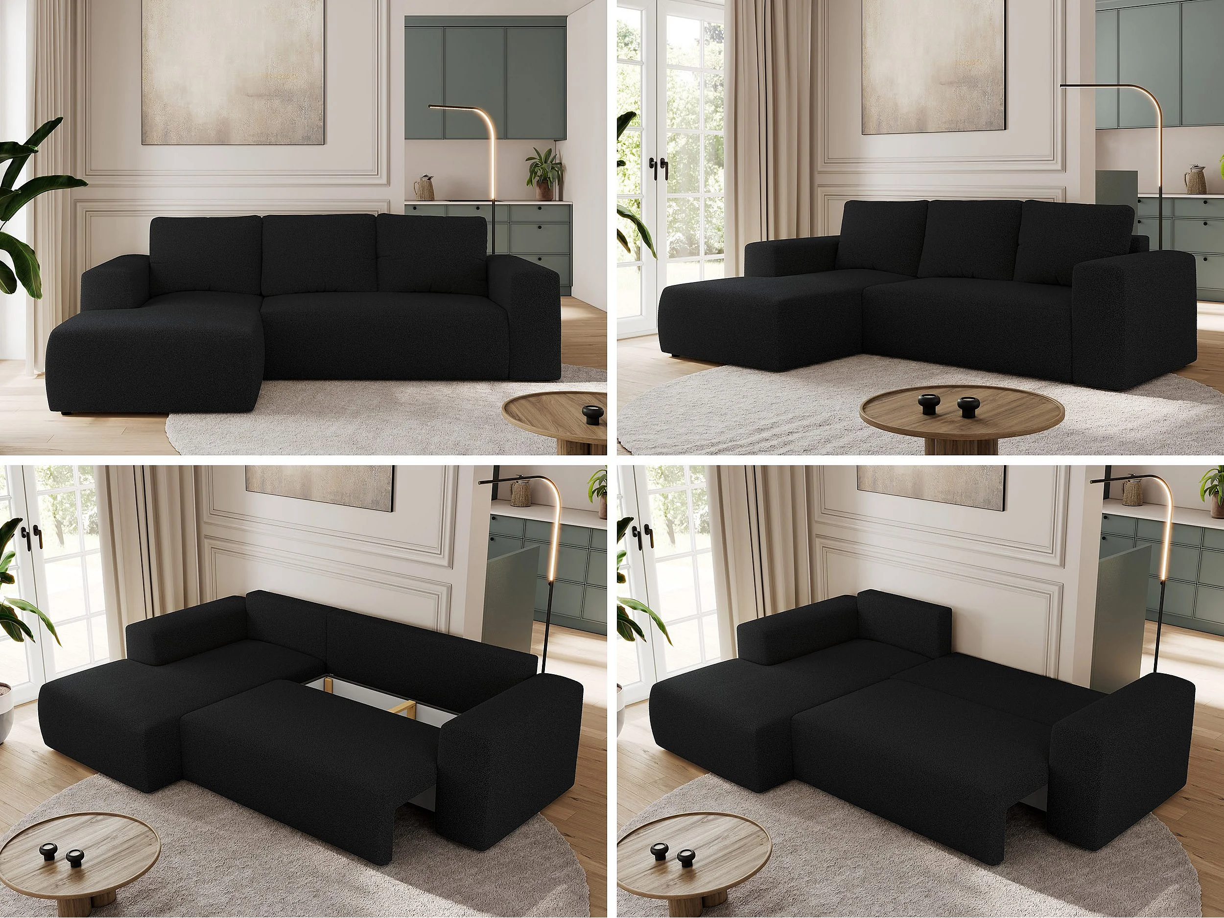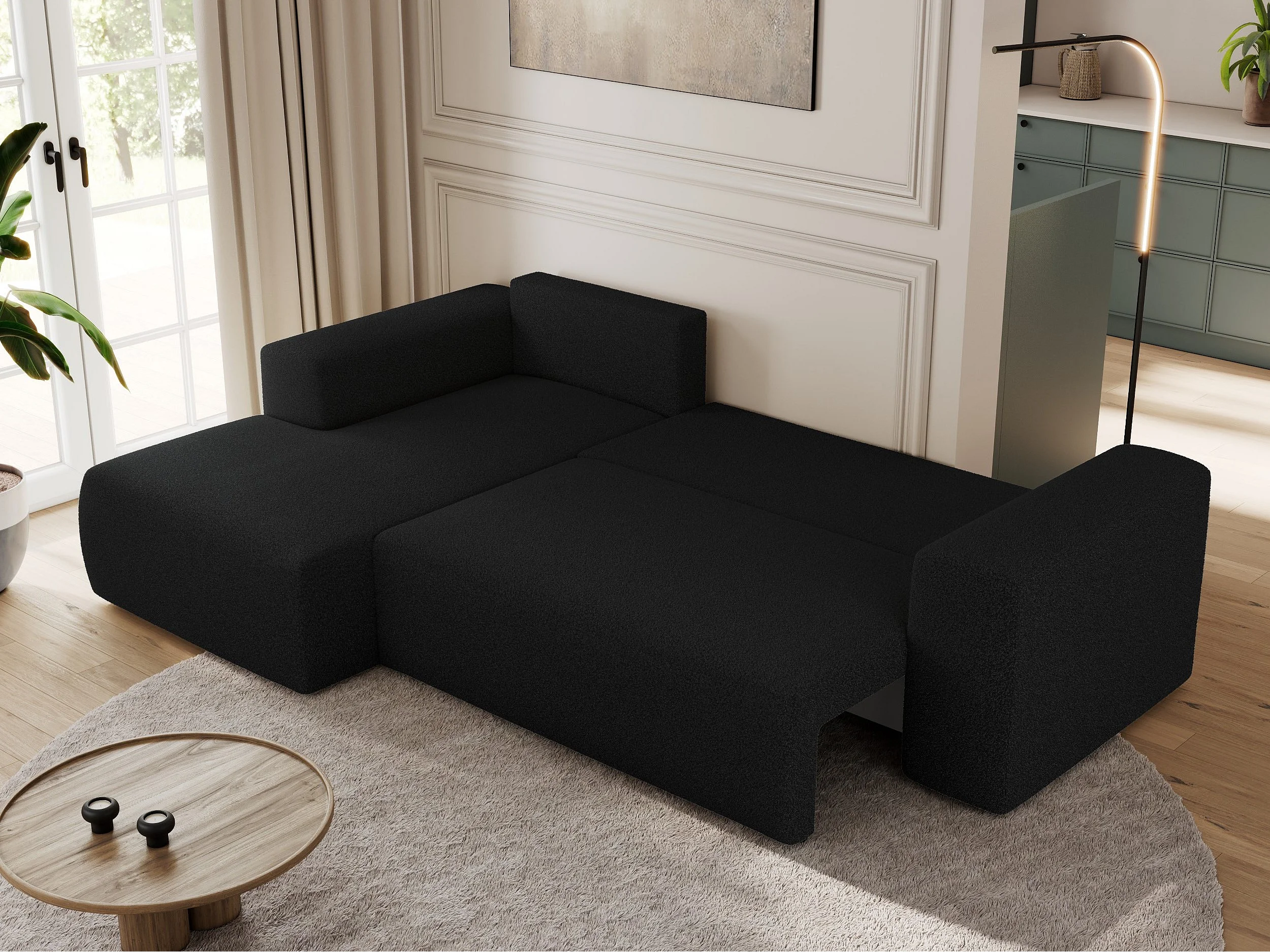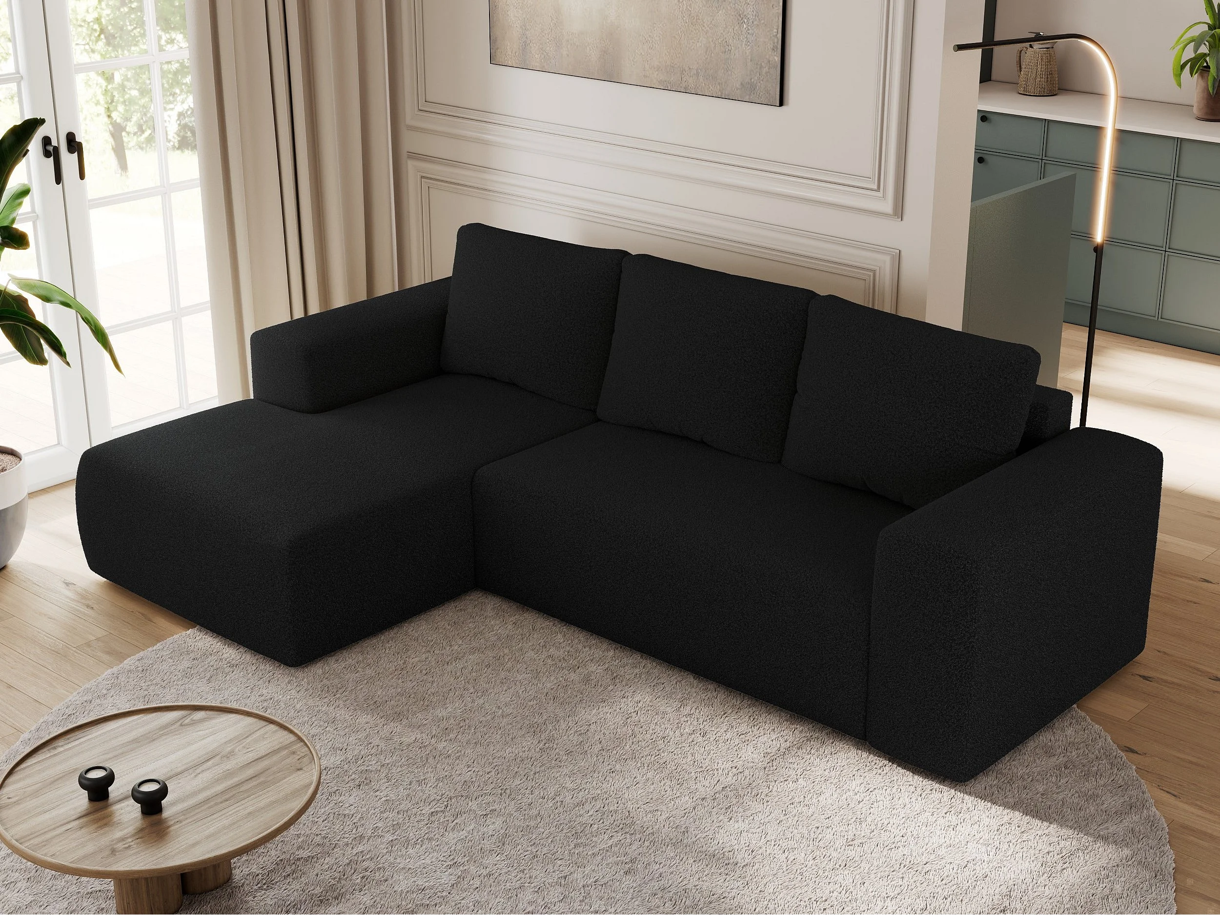Ecksofa TRENTINO - mit Schlaffunktion und Bettkasten, L-form Couch, lose Kissen und Armlehnen - Schwarz Boucle - Ecke Links
