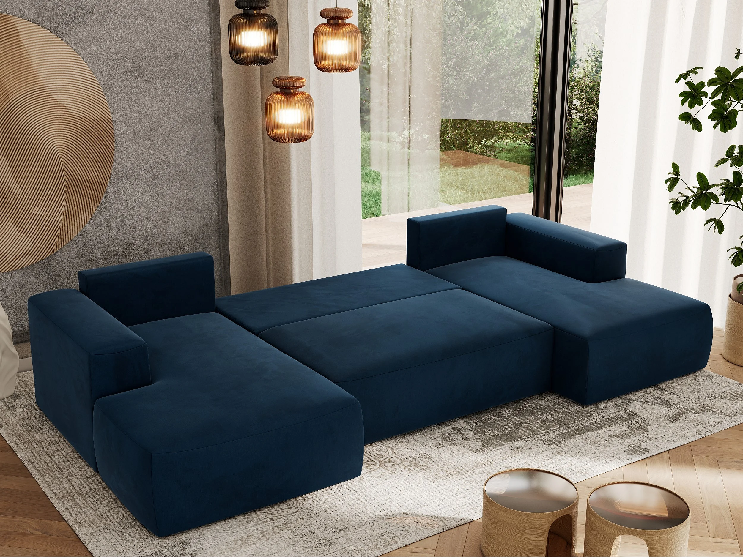 Ecksofa TRENTINO U - mit Schlaffunktion und Bettkasten, U-förmiges Wohnlandschaft, Armlehnen - Dunkelblau Velvet