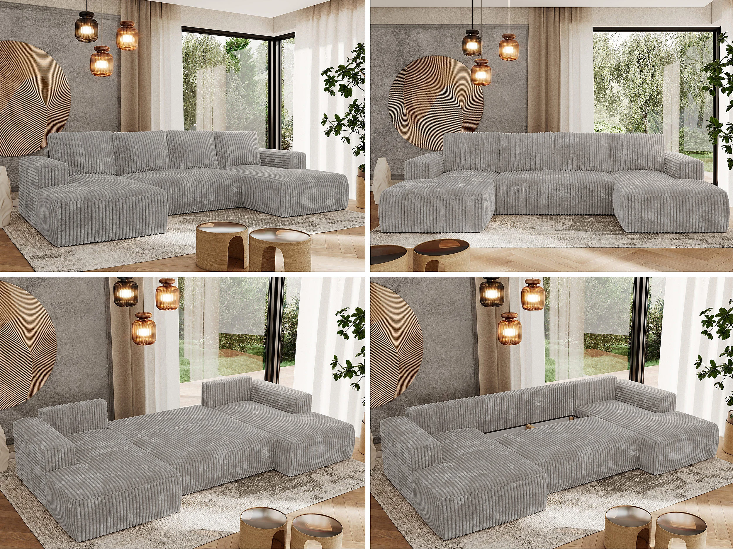 Ecksofa TRENTINO U - mit Schlaffunktion und Bettkasten, U-förmiges Wohnlandschaft, Armlehnen - Hellgrau Cord