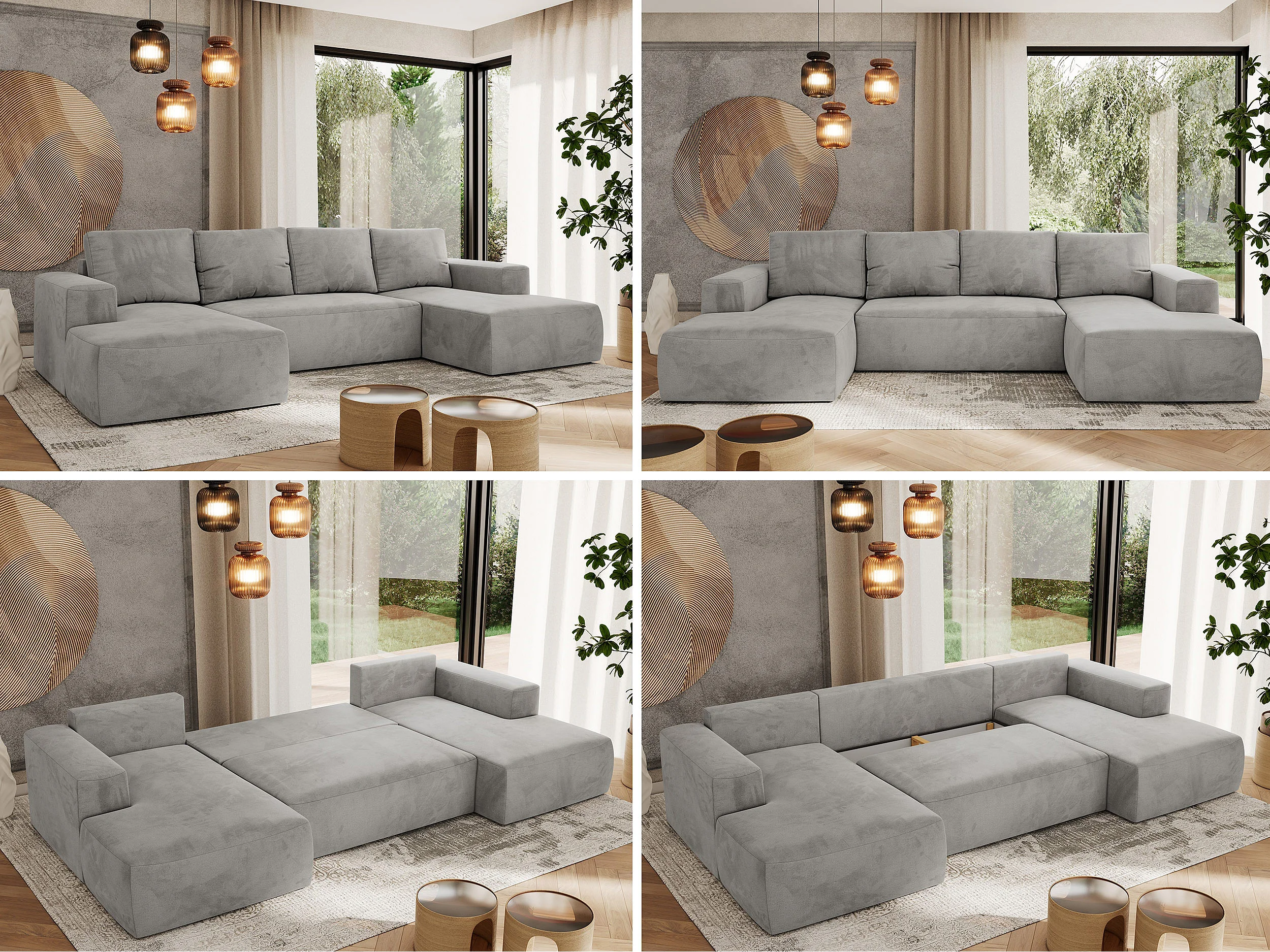 Ecksofa TRENTINO U - mit Schlaffunktion und Bettkasten, U-förmiges Wohnlandschaft, Armlehnen - Hellgrau Velvet