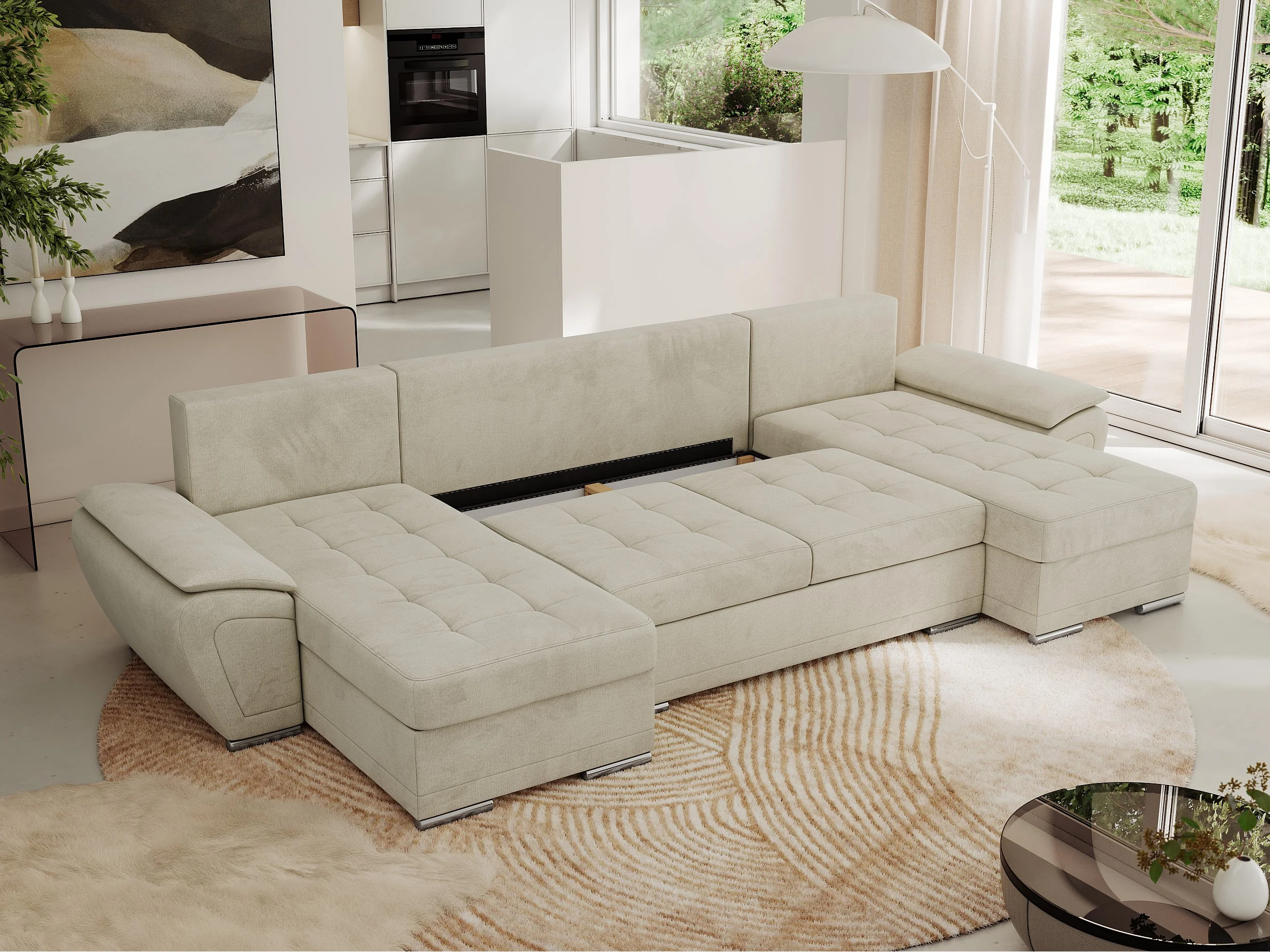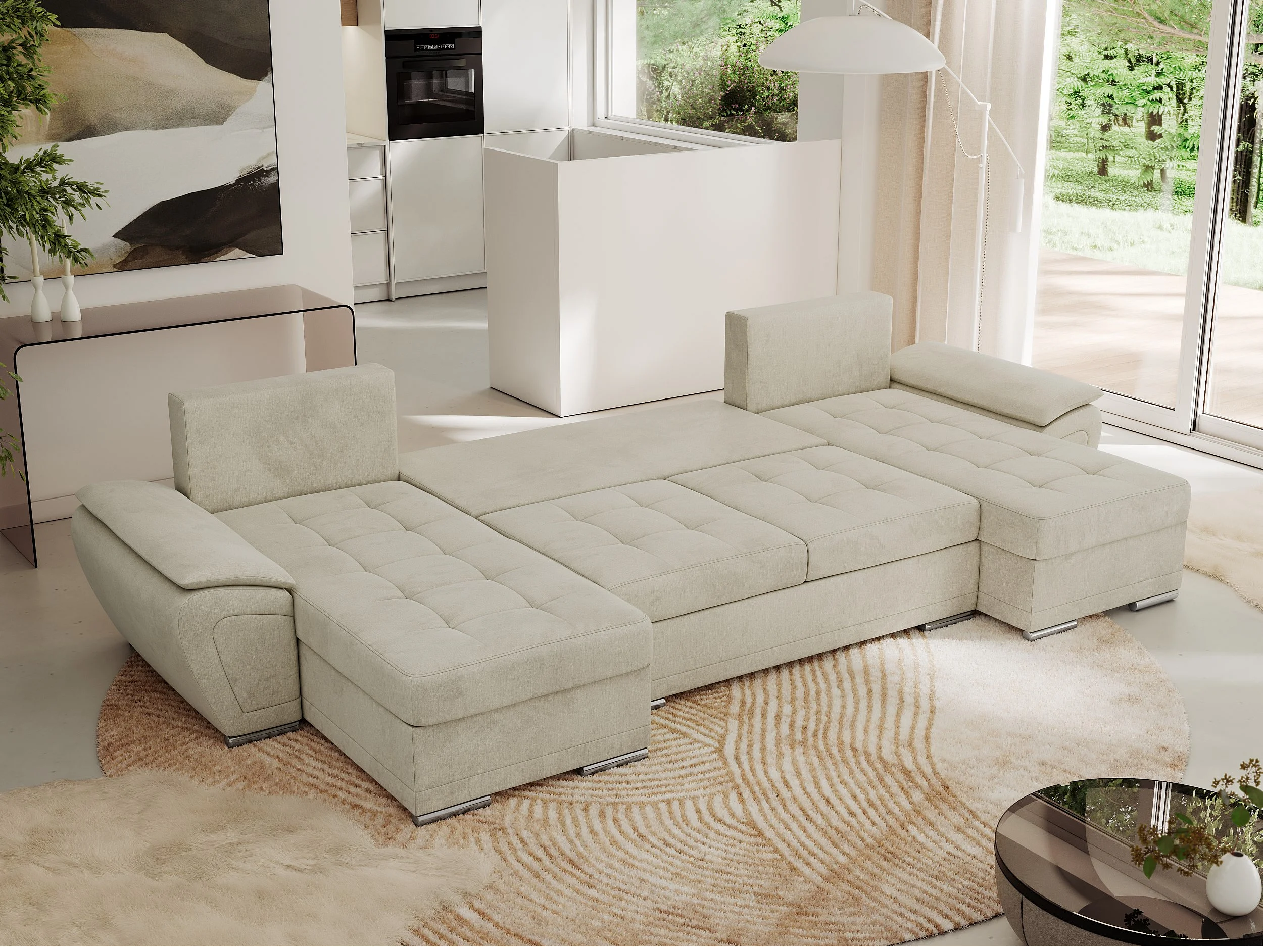 Ecksofa UMBRIA U - XXL Wohnlandschaft, mit Schlaffunktion und Bettkasten, genähte Ecke - Beige Velvet