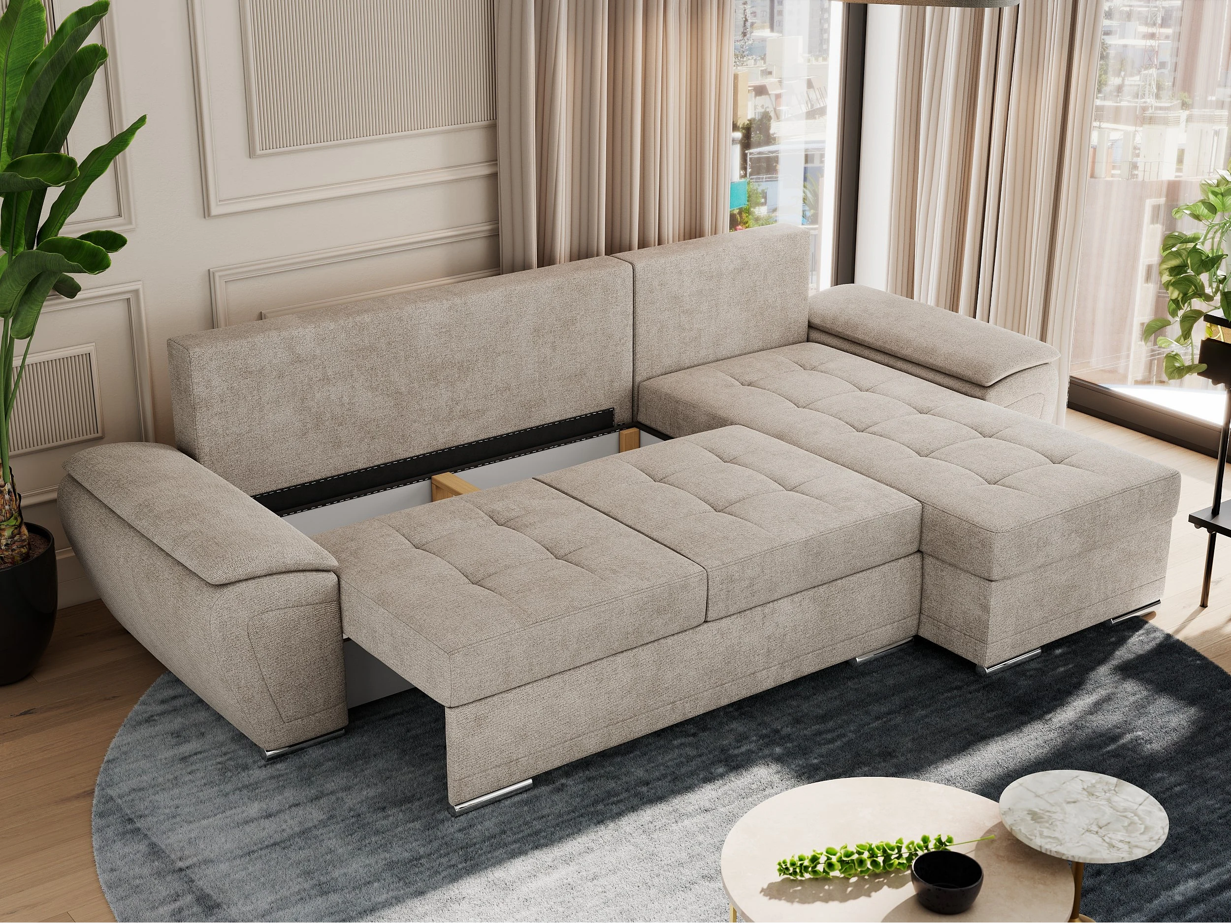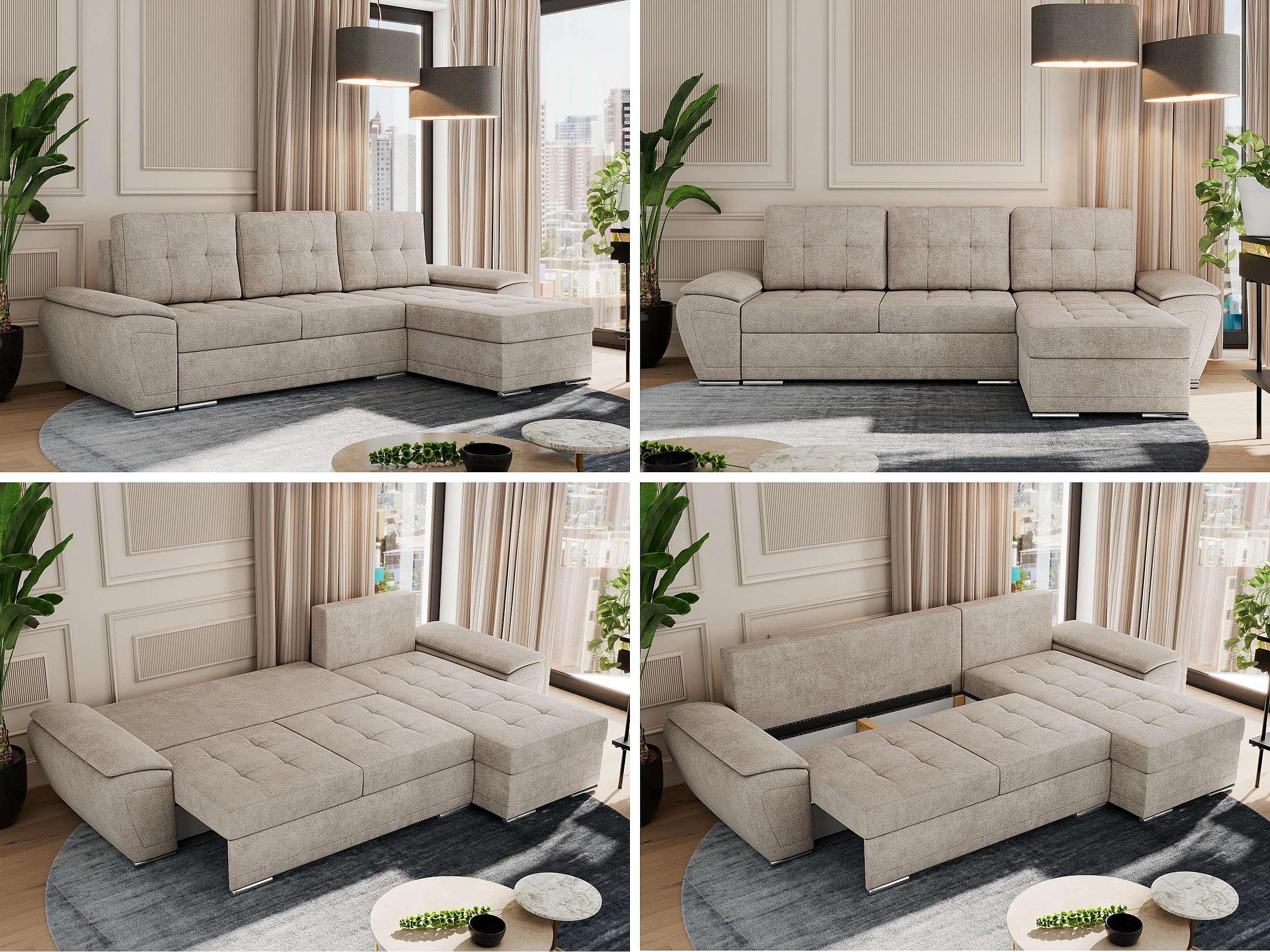 Ecksofa UMBRIA - universell L-form Couch, Schlaffunktion und Bettkasten, gesteppte Ecke - Beige Stukture