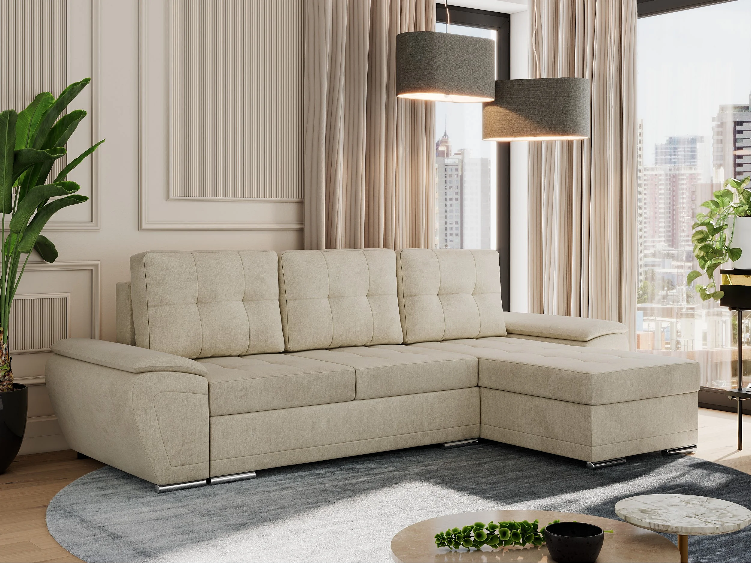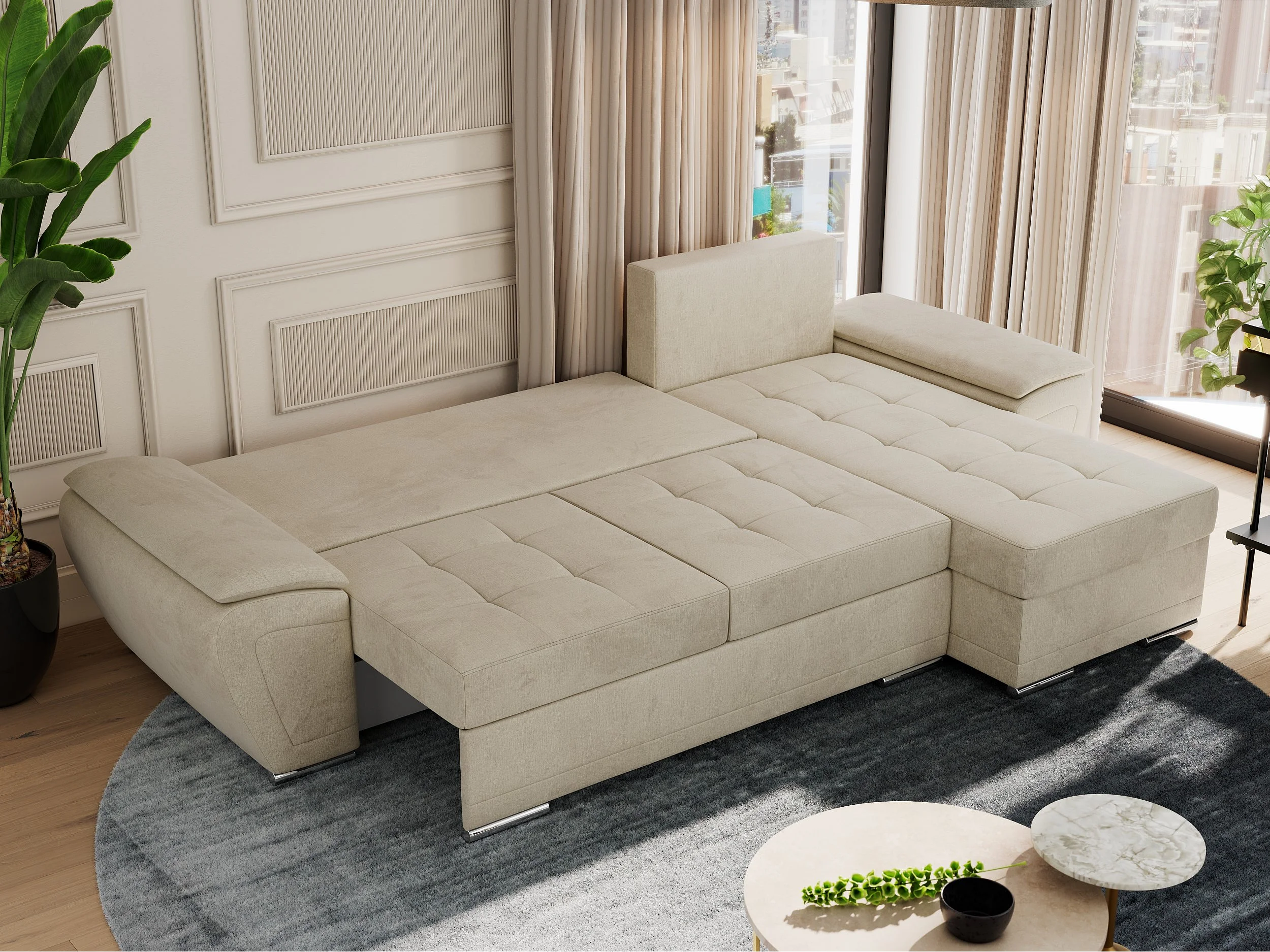 Ecksofa UMBRIA - universell L-form Couch, Schlaffunktion und Bettkasten, gesteppte Ecke - Beige Velvet
