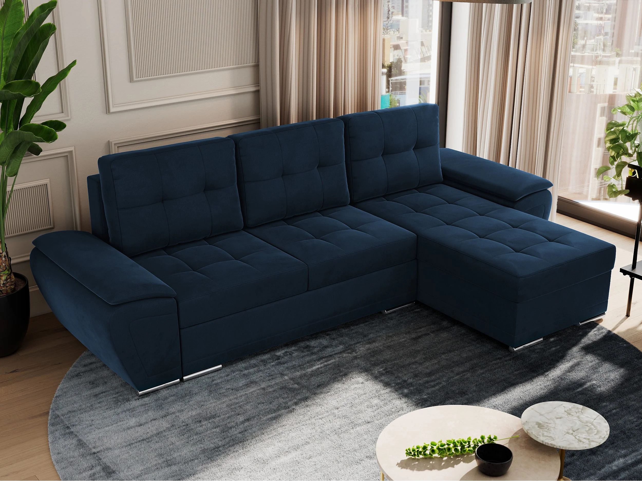 Ecksofa UMBRIA - universell L-form Couch, Schlaffunktion und Bettkasten, gesteppte Ecke - Dunkelblau Velvet