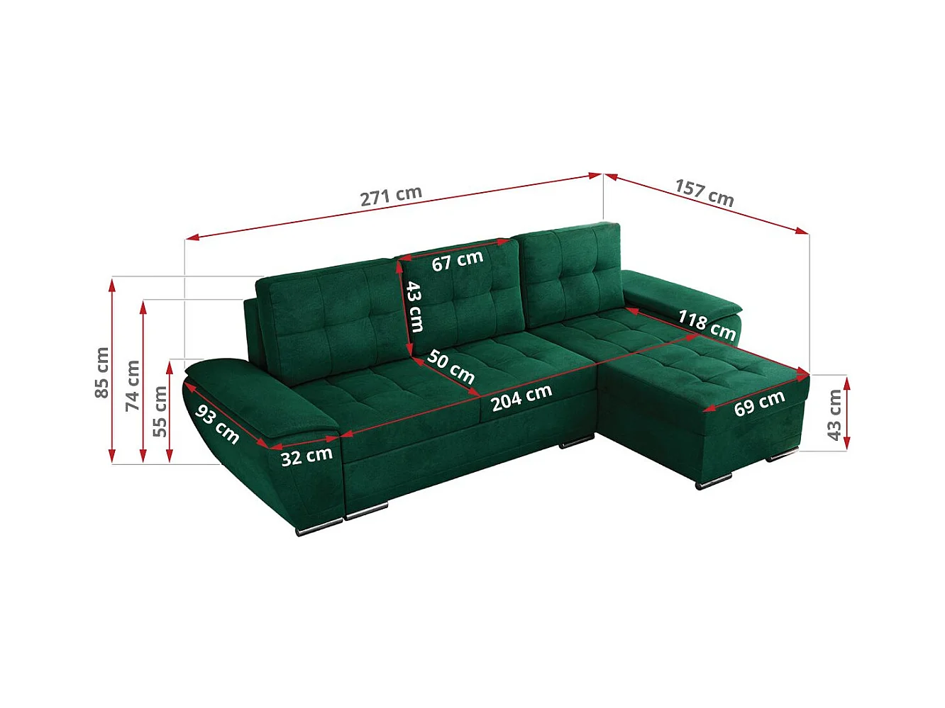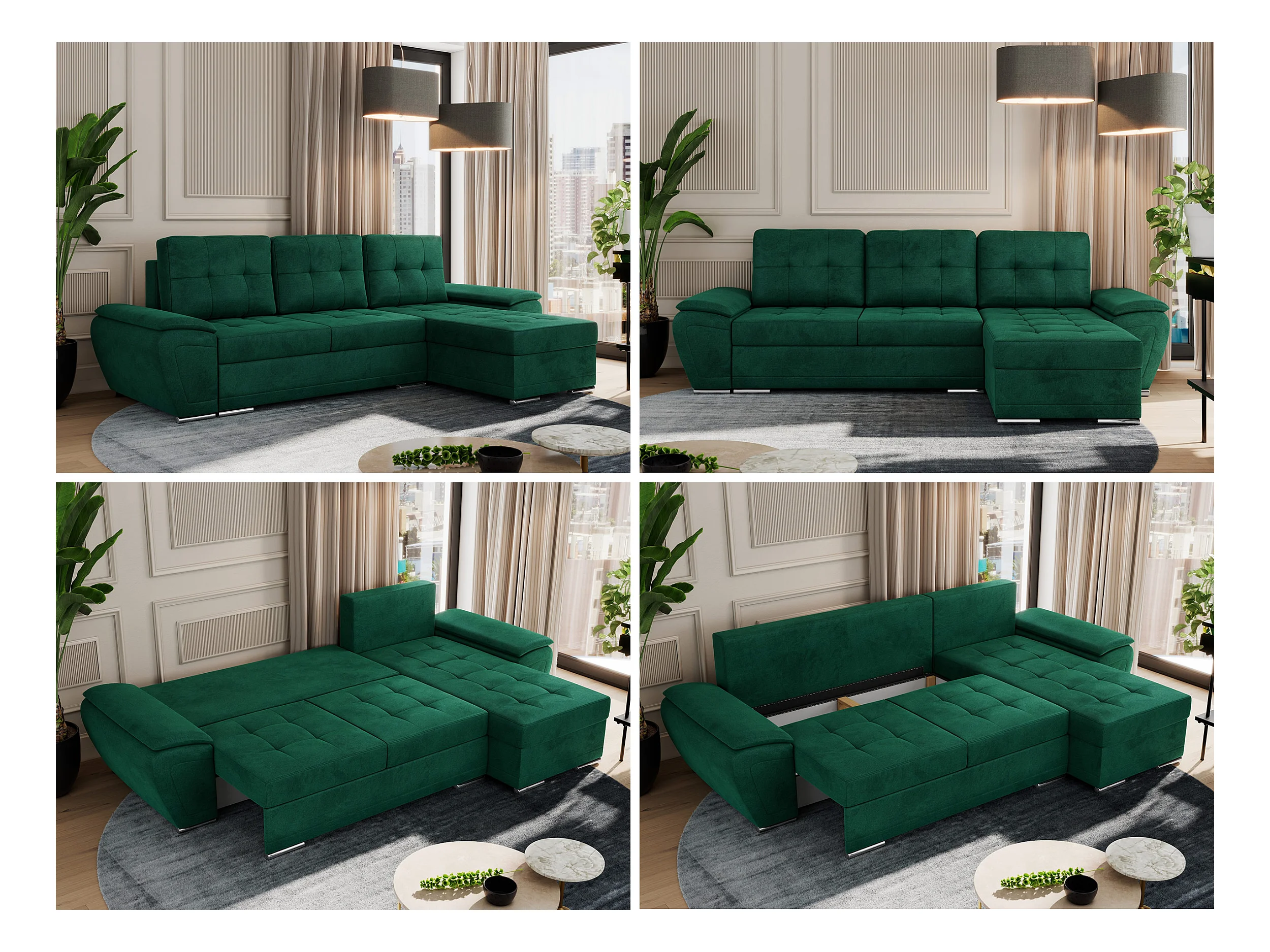 Ecksofa UMBRIA - universell L-form Couch, Schlaffunktion und Bettkasten, gesteppte Ecke - Dunkelgrün Velvet