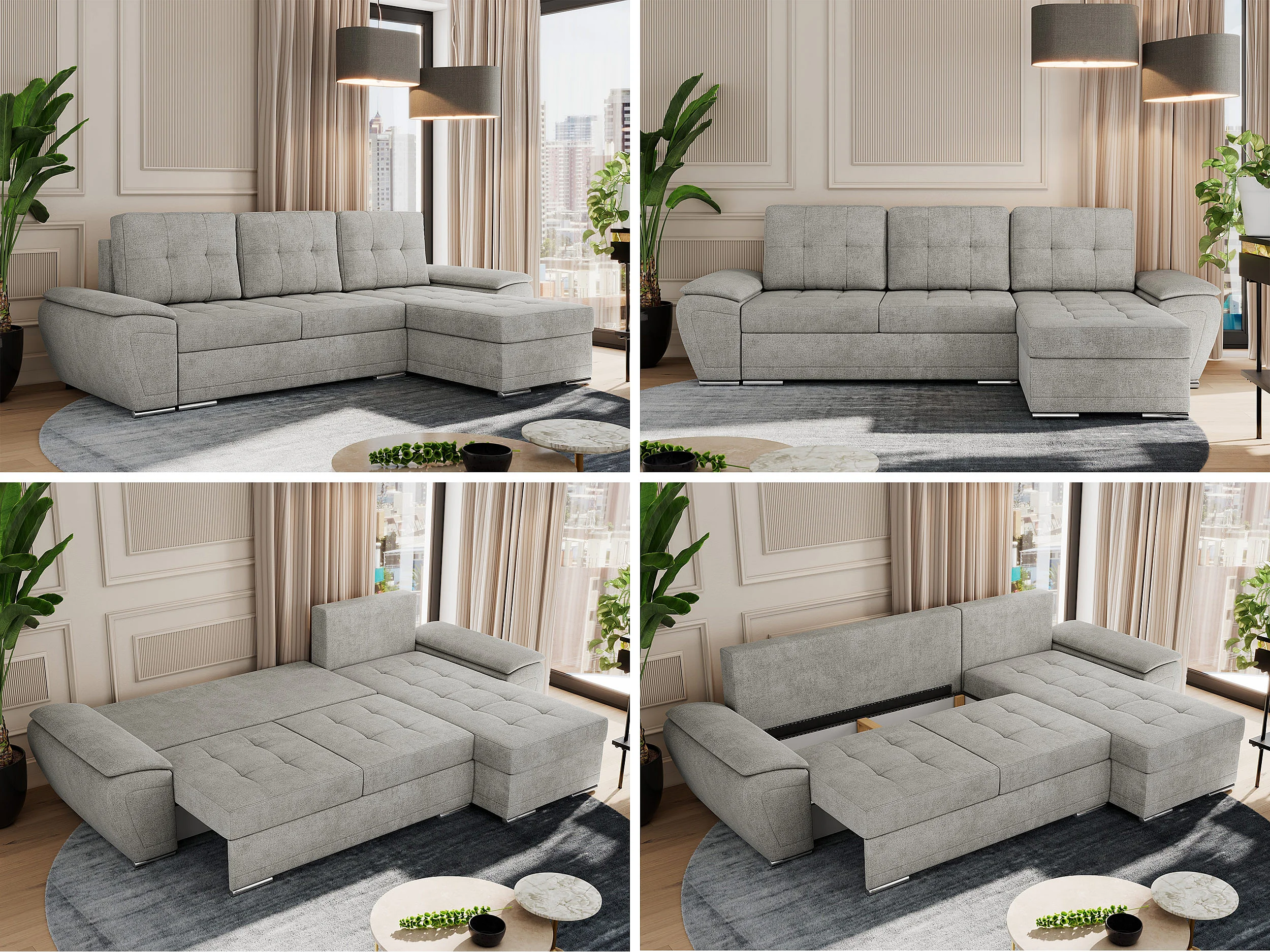 Ecksofa UMBRIA - universell L-form Couch, Schlaffunktion und Bettkasten, gesteppte Ecke - Hellgrau Stukture