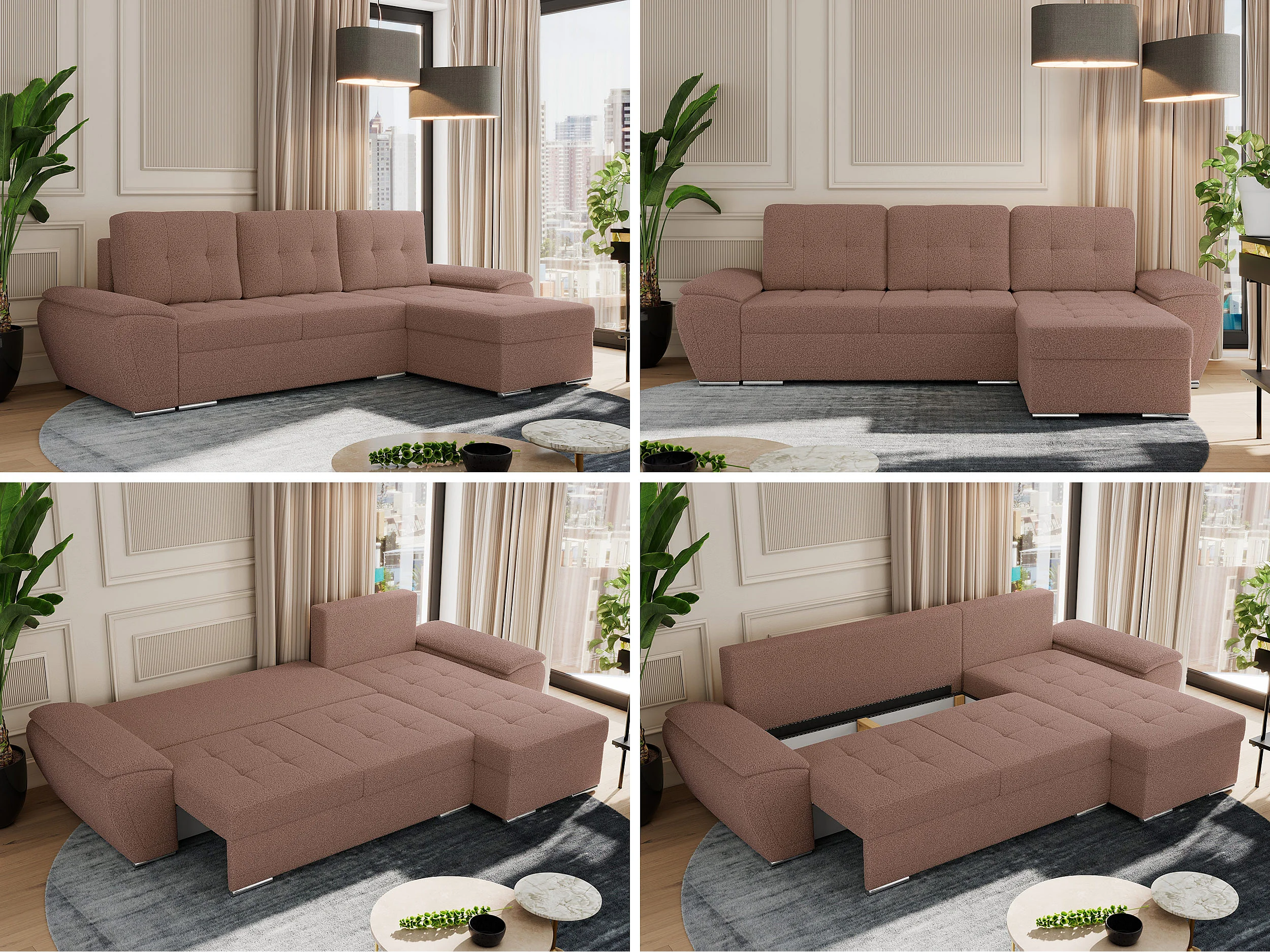 Ecksofa UMBRIA - universell L-form Couch, Schlaffunktion und Bettkasten, gesteppte Ecke - Rosa Boucle