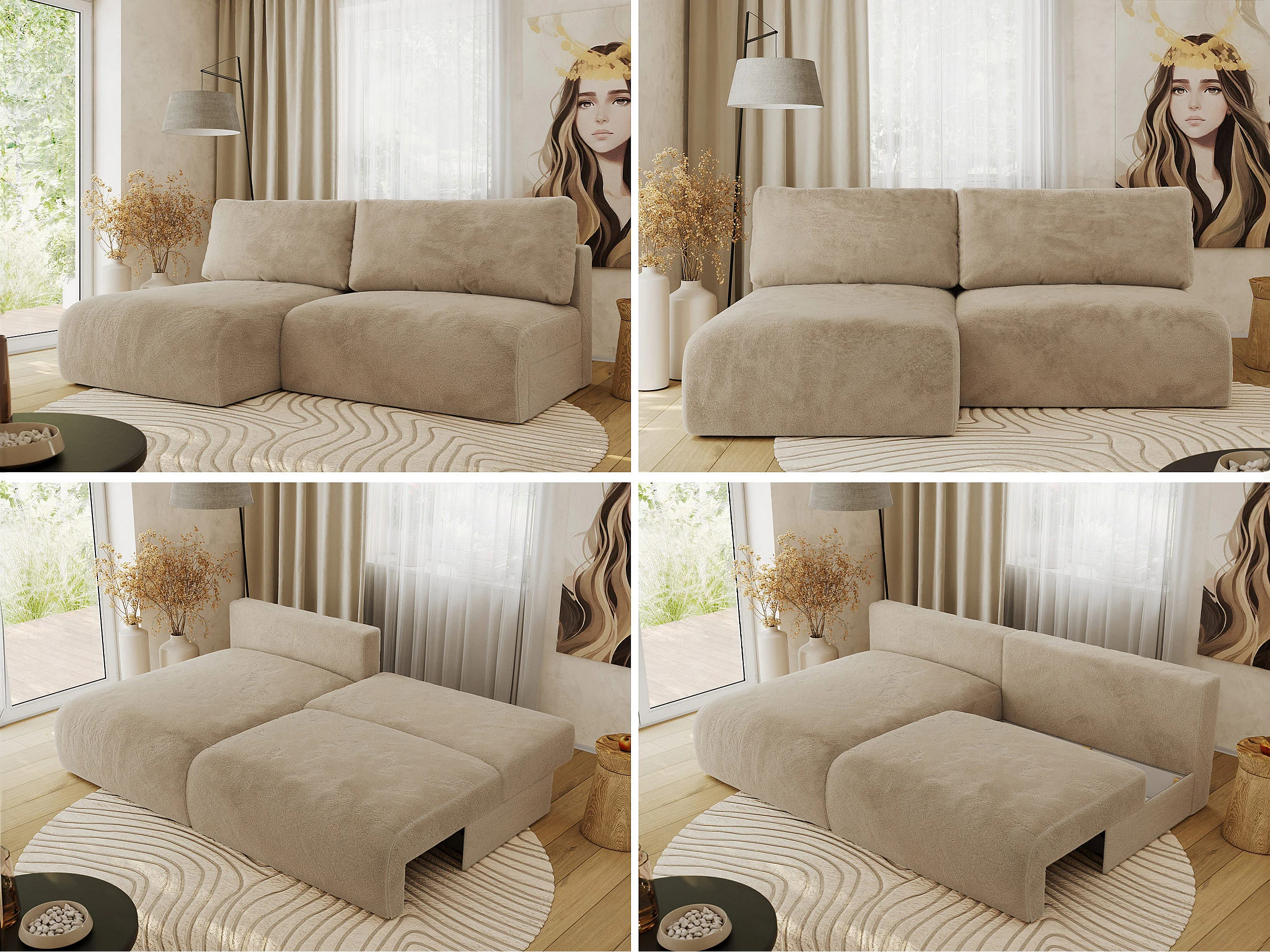 Ecksofa VIVO - L-form Couch mit Schlaffunktion und Bettkasten, Wellenfeder - Beige Plüsch - Ecke Links