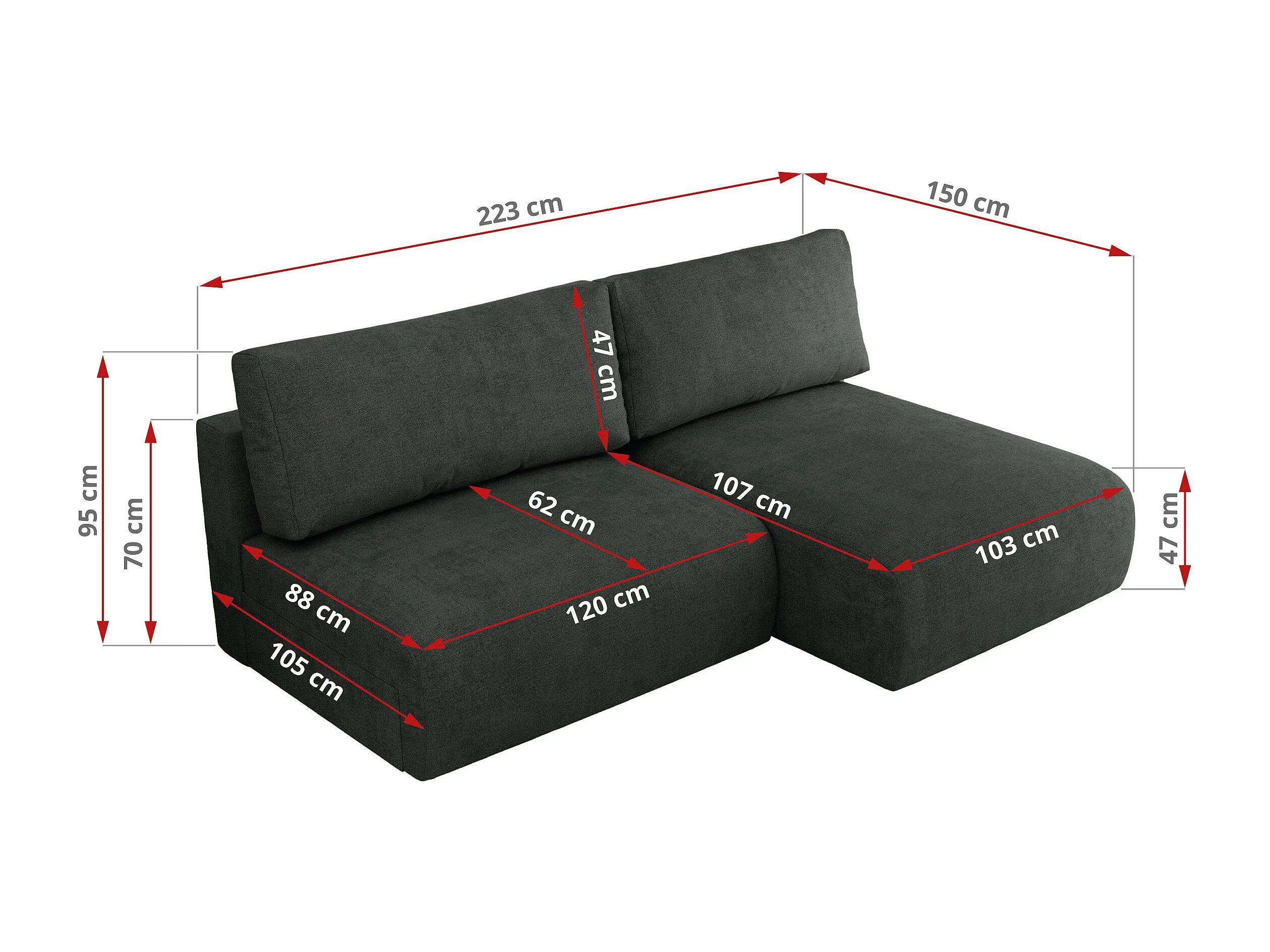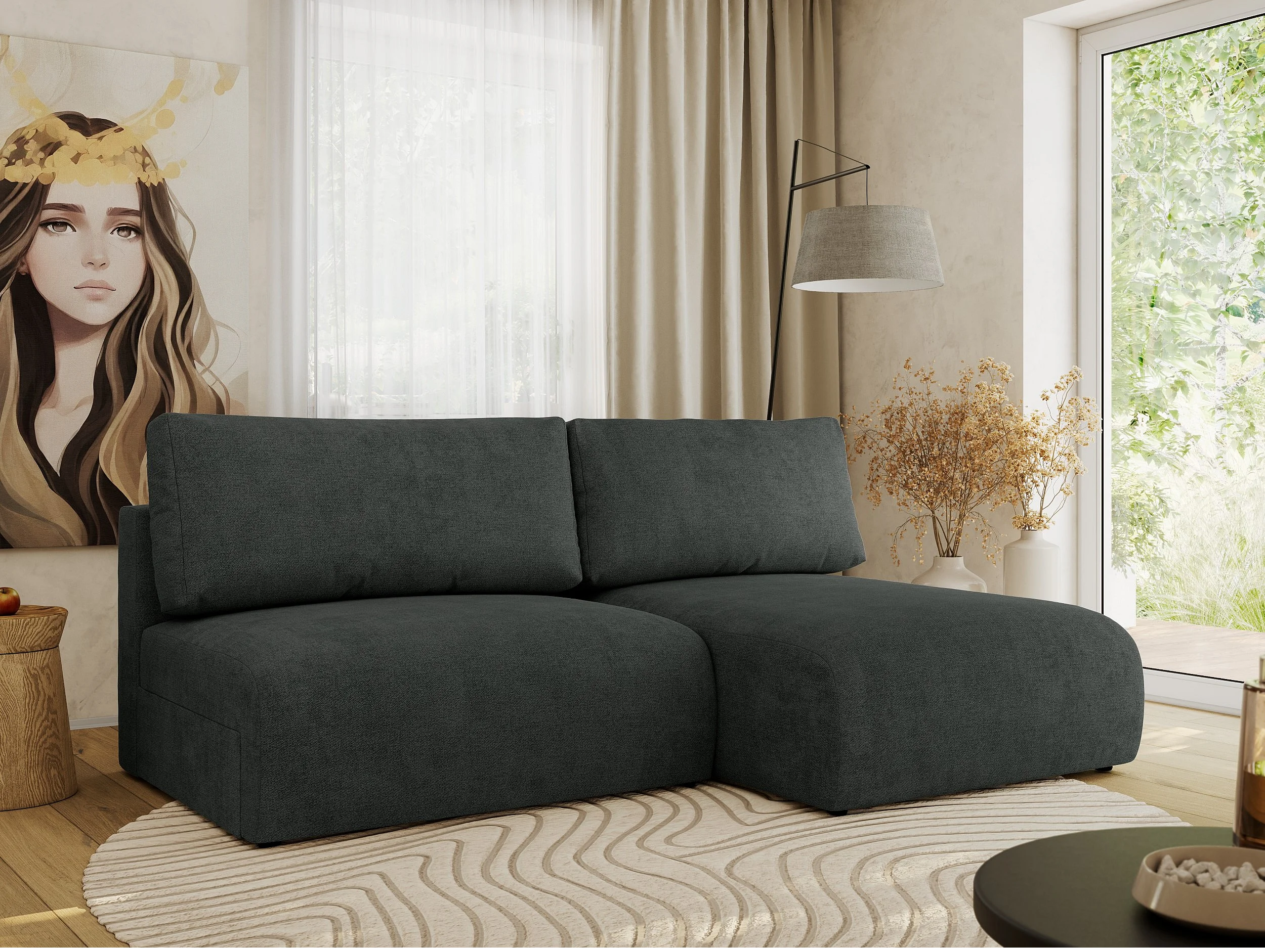 Ecksofa VIVO - L-form Couch mit Schlaffunktion und Bettkasten, Wellenfeder - Dunkelgrau Struktur - Ecke Rechts