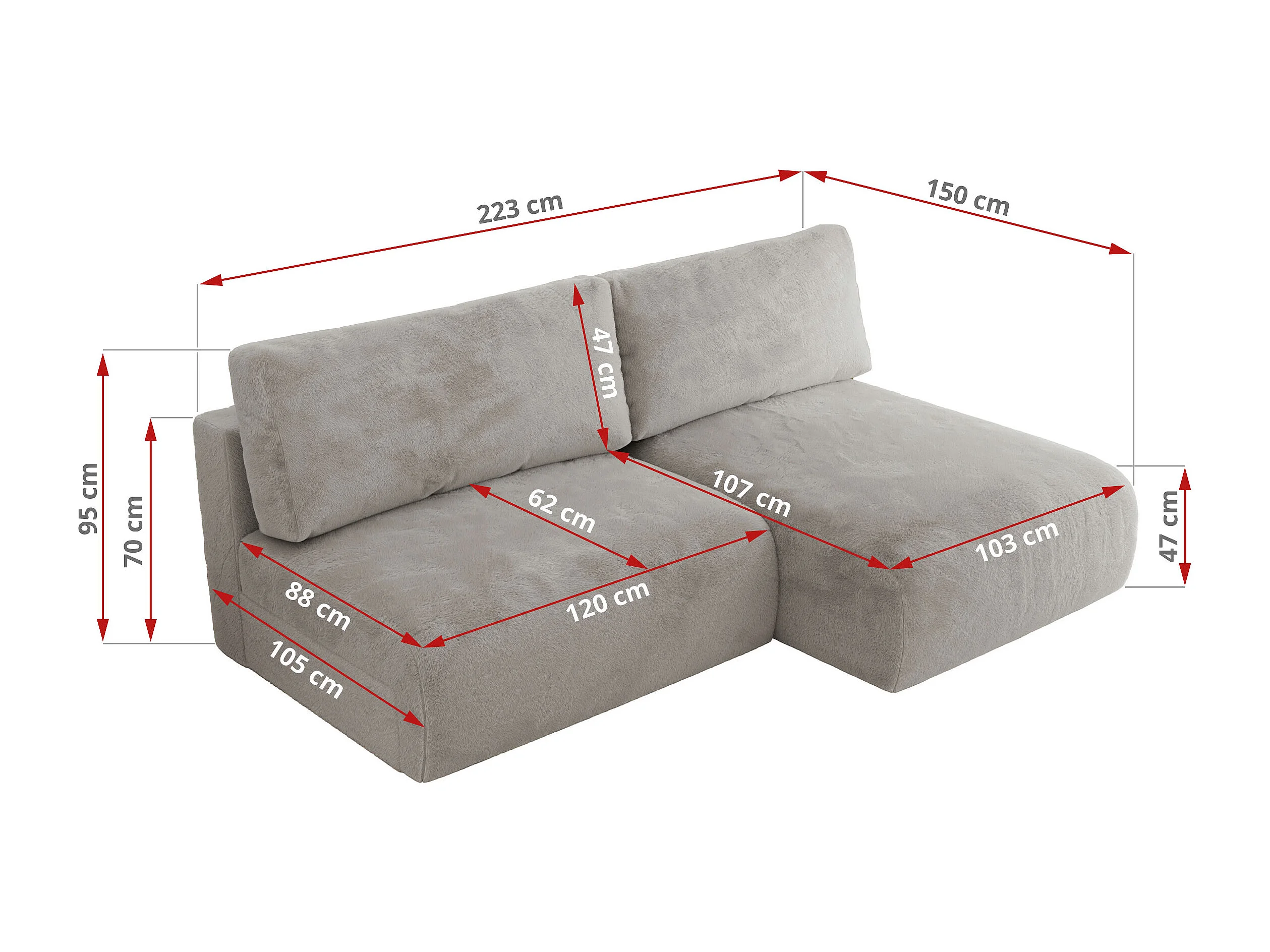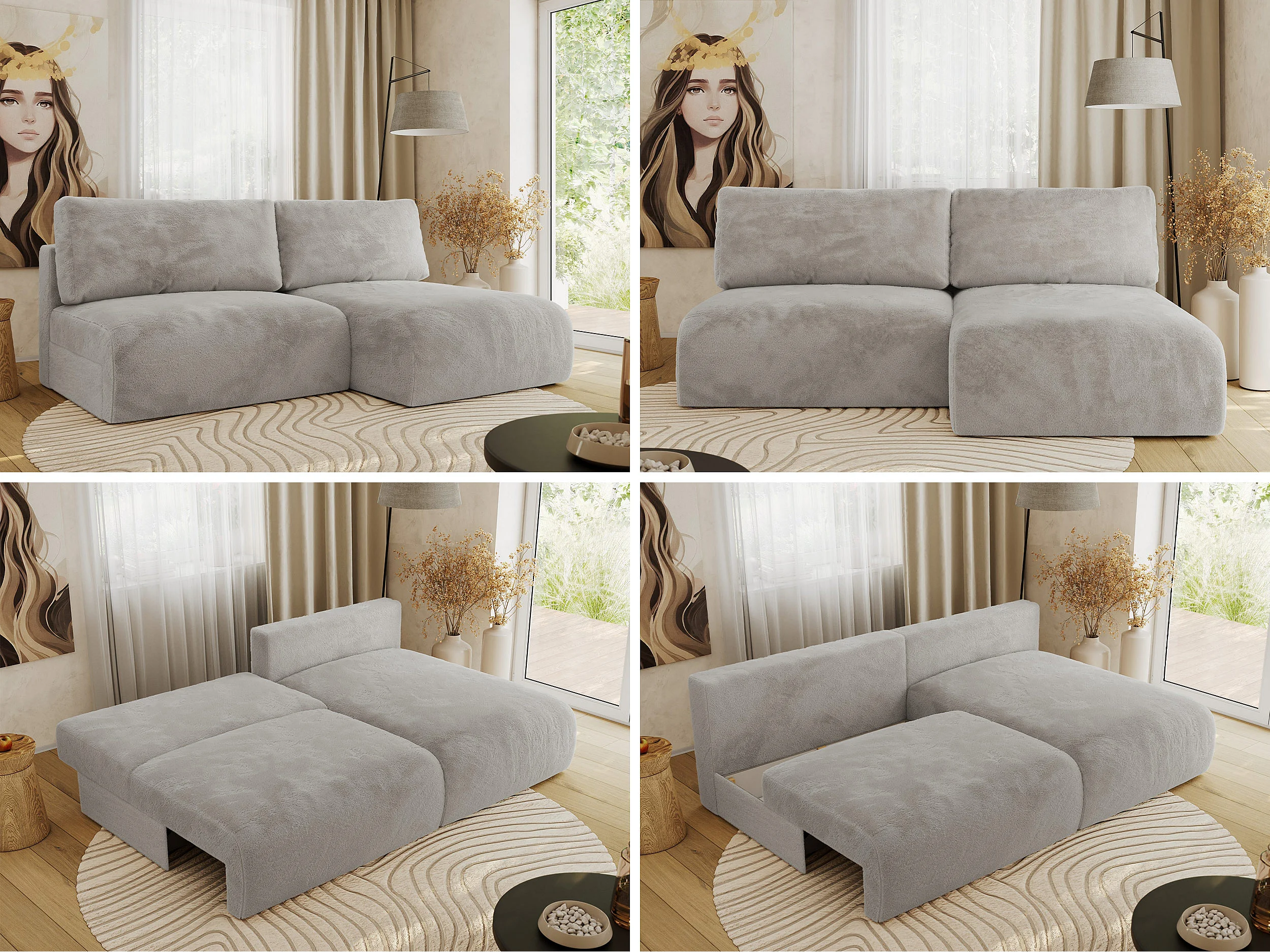 Ecksofa VIVO - L-form Couch mit Schlaffunktion und Bettkasten, Wellenfeder - Hellgrau Plüsch - Ecke Rechts