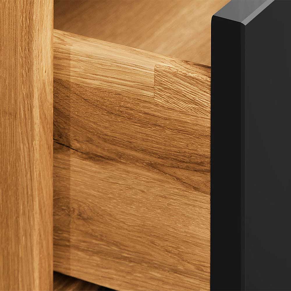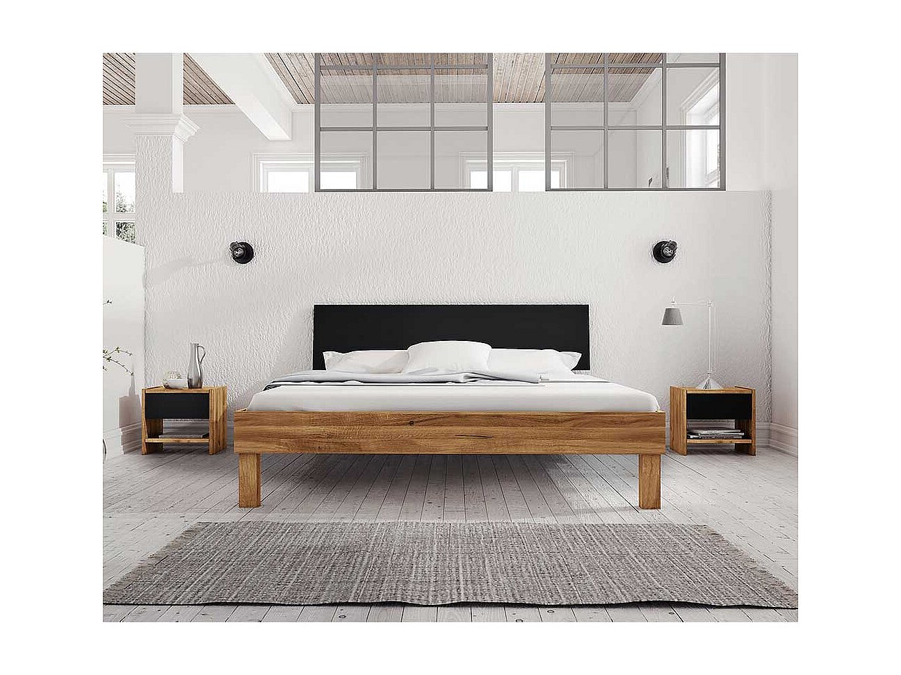Ehebett aus Wildeiche teilmassiv Webstoff Kopfteil (dreiteilig)