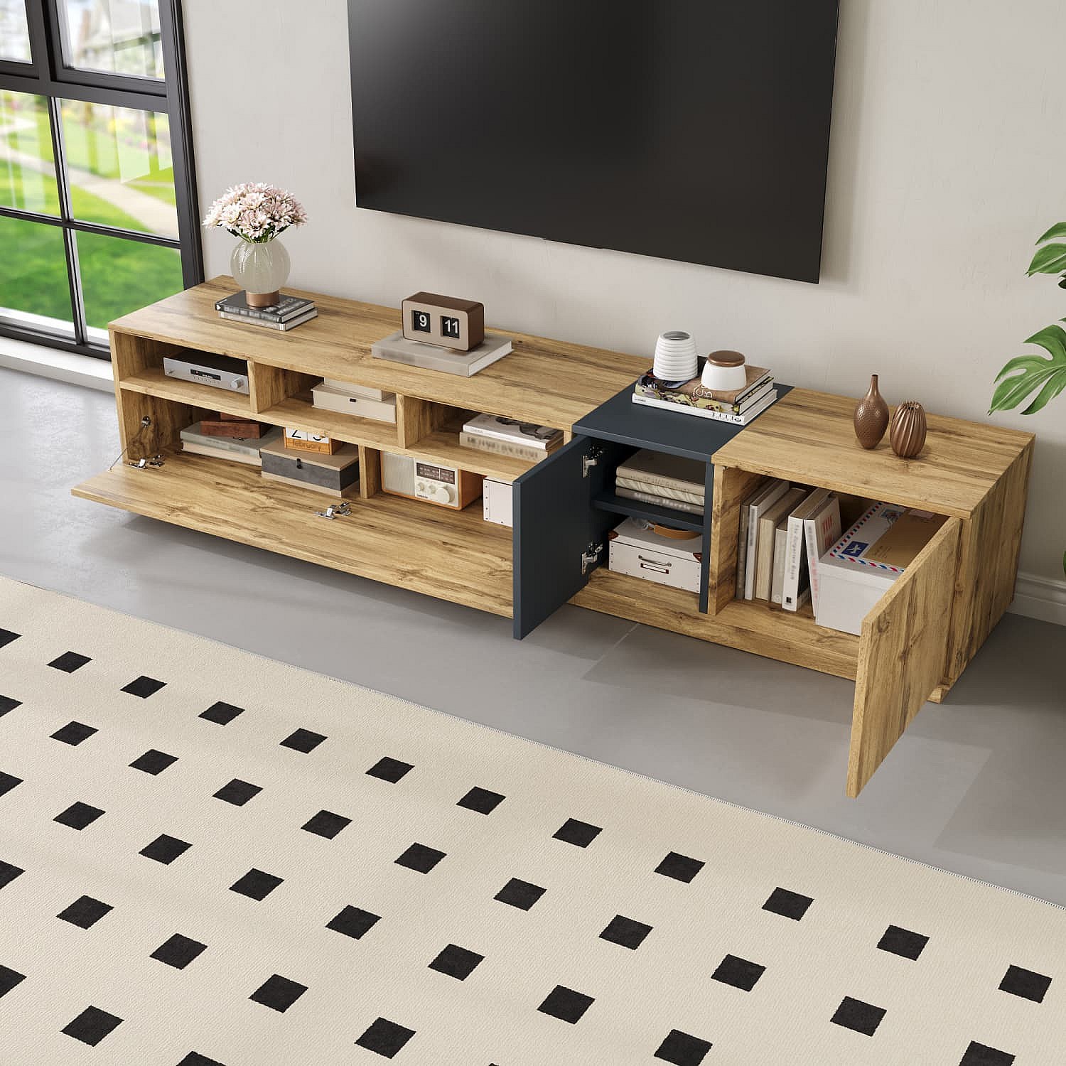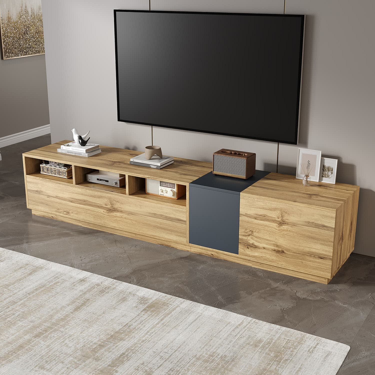 Ein moderner TV-Ständer in Kontrastfarben. Mit schlichtem, kontrastreichem Design,mit offenen Fächern und Kabelöffnungen,200 cm