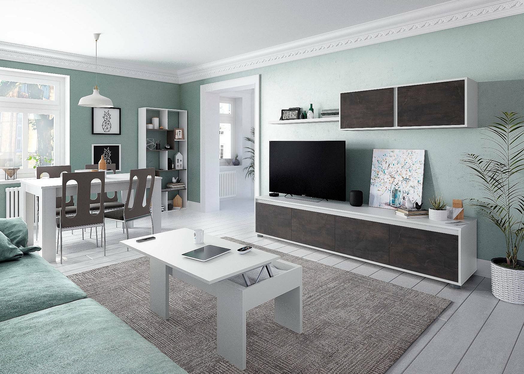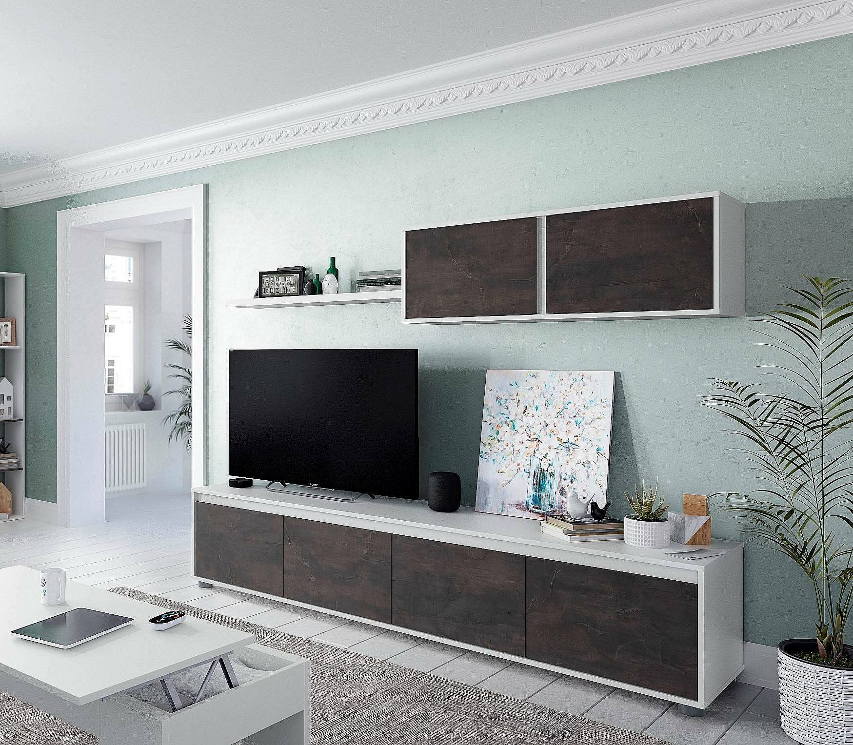 STRUKTUR UND VERWENDUNG - TV-Schrank für Wohnzimmer bestehend aus einem TV-Ständer mit vier Flügeltüren, einer hängenden Wandeinheit und einem Regal, innen befestigten Regalen - Die Auswahl an verschiedenen Möbelstücken, aus denen diese Wohnzimmerkomposition besteht, bestimmt das Design modernes, funktionales und platzsparendes Möbelstück - Neben der Positionierung des Fernsehers können Sie die Wand mit Ihrem Lieblings-Schnickschnack individuell gestalten, der in den Regalen ausgestellt bleibt - Der Raum innerhalb der Türen ist perfekt, um Ihre Bücher ordentlich aufzubewahren , Dokumente, Dekorationsgegenstände oder Geschirr auf geordnete und diskrete Weiße - Perfektes Wohnzimmerset zum Dekorieren eines Wohnzimmers, Esszimmers oder eines offenen Raums.