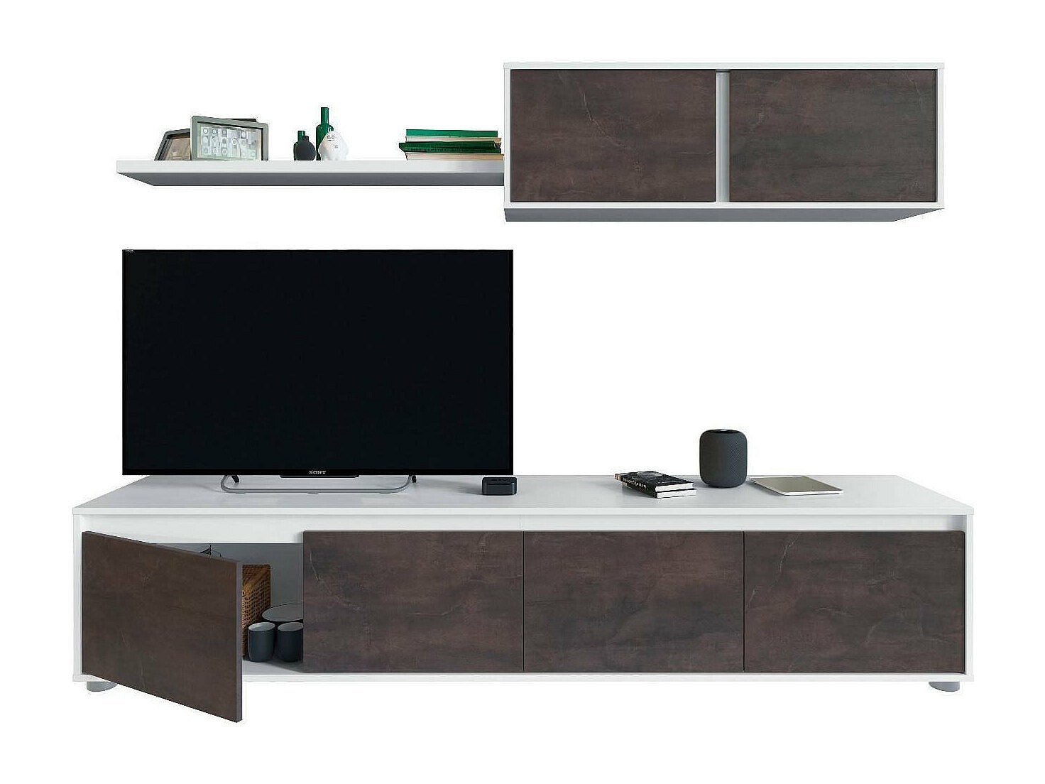 Einbaufertige Wand Damatte, TV-Ständer für Wohnzimmer, Zusammensetzung des Wohnzimmersets, Wohnzimmergarnitur mit Schrankwand, 200x41h43 cm, Weiß und Oxid