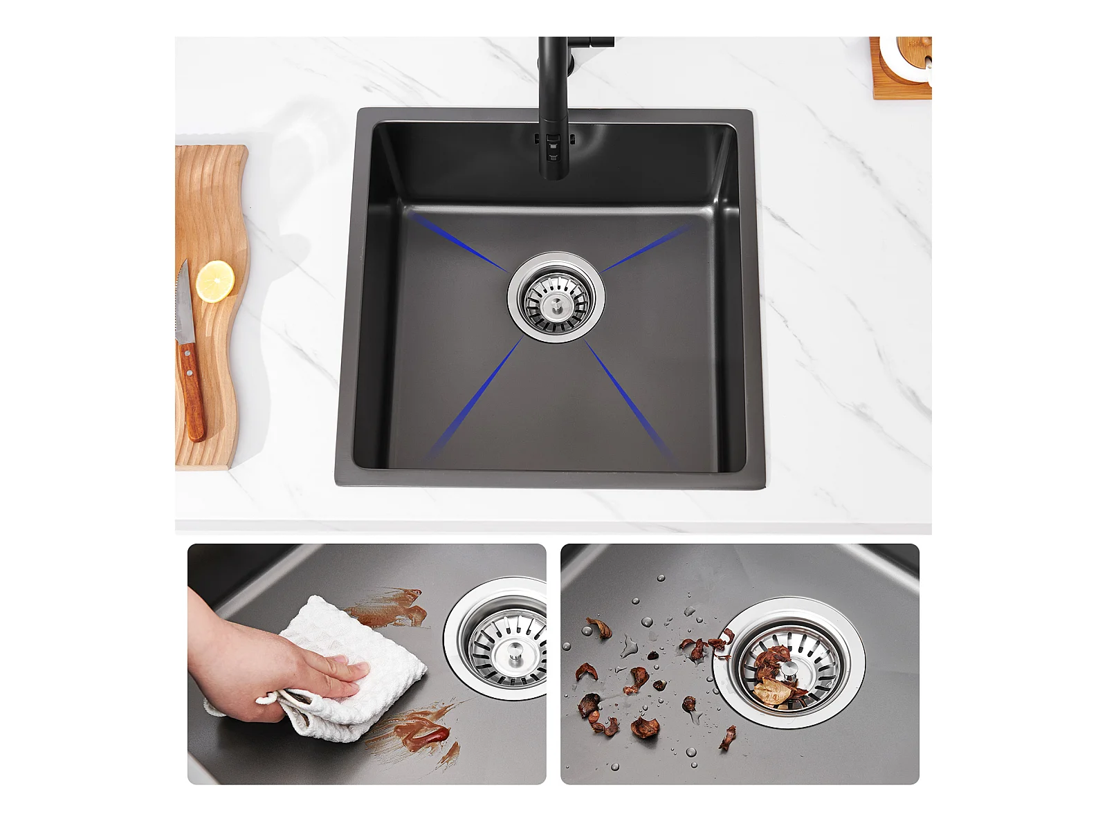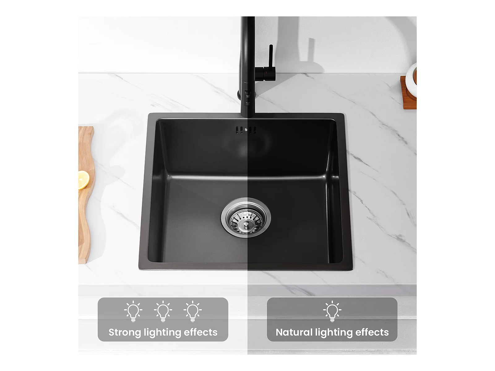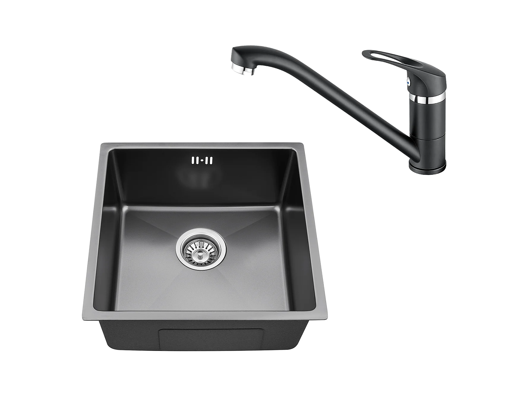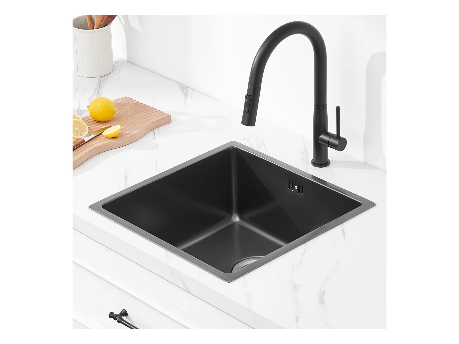 Einbauspüle 44x44x20CMcm Einzelbecken Edelstahl-Küchenspüle, Schwarz + Küchenarmatur, 360° schwenkbar, Warm-/Kaltwasser, Schwarz