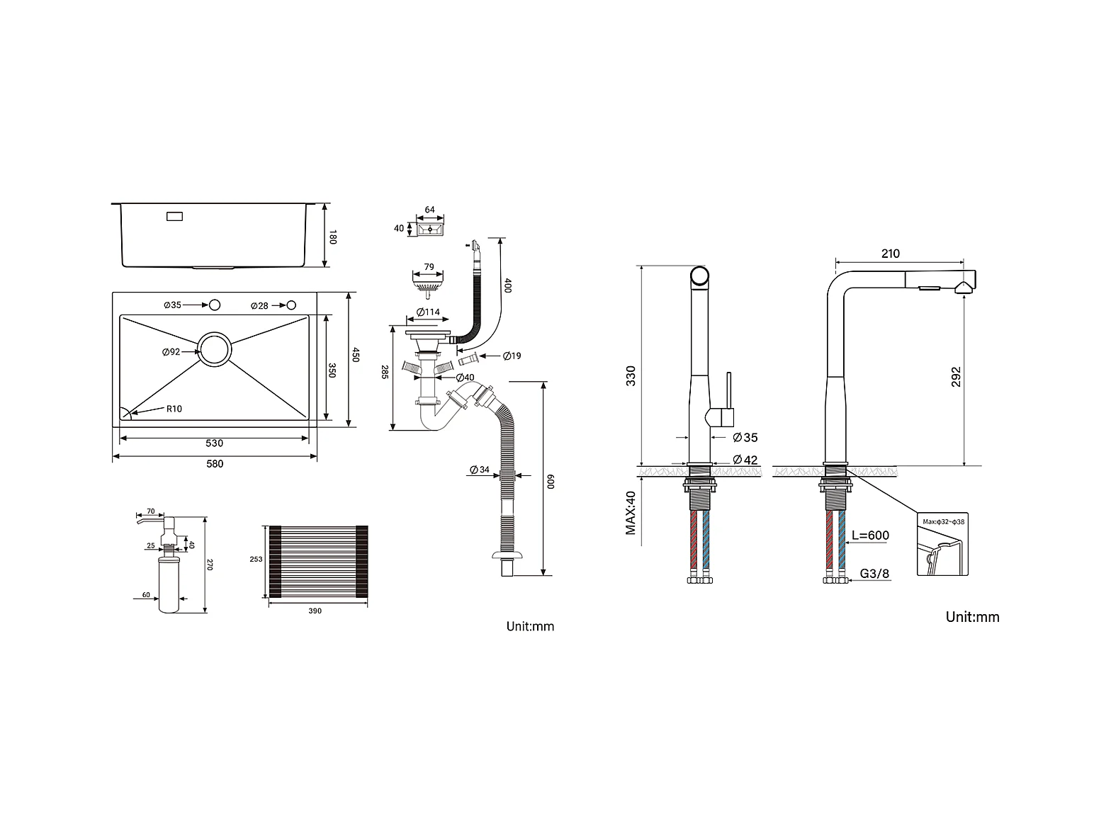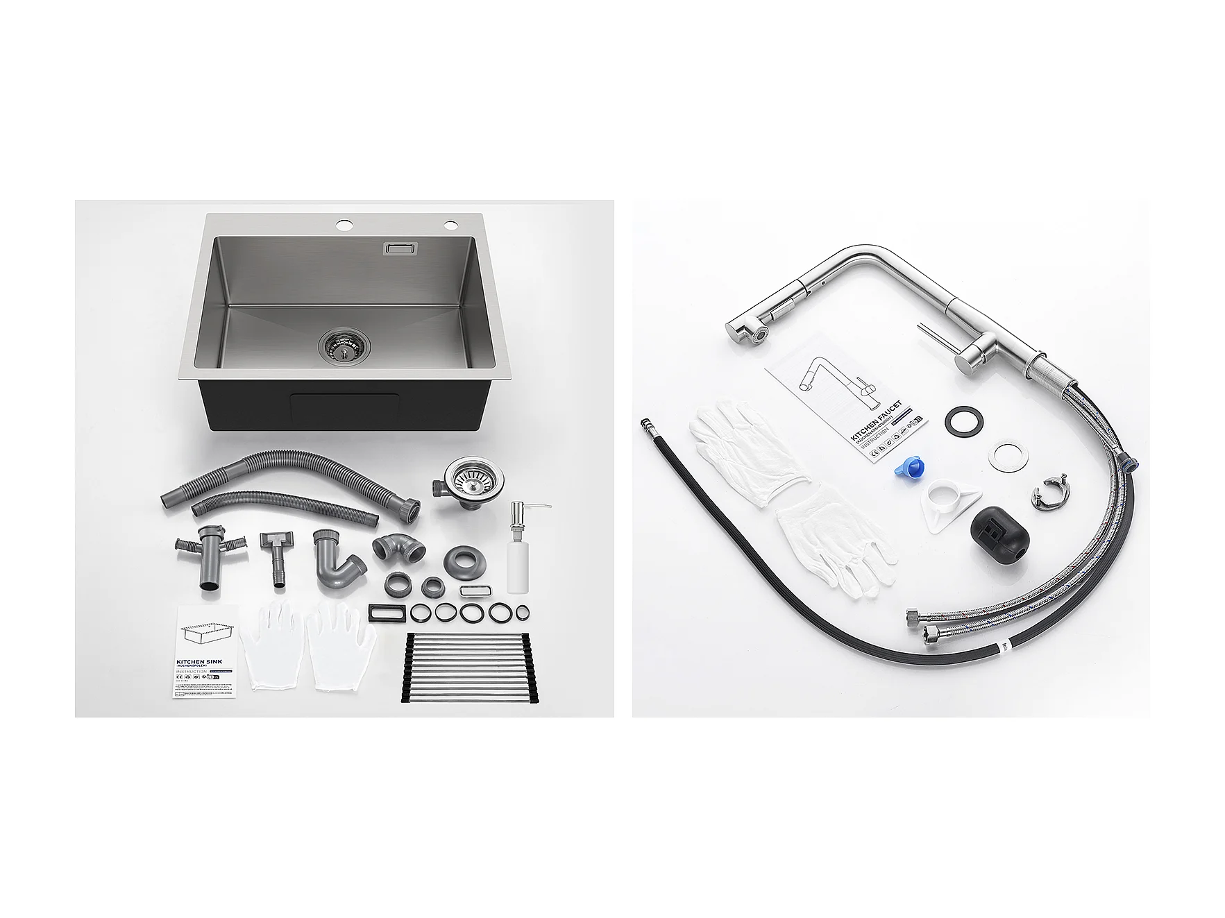 Einzelbecken-Küchenspüle, 58*45*18CM, aufrollbare Abtropffläche, Seifenspender + Küchenmischbatterie mit 360° drehbarer Ausziehbrause, gebürstet