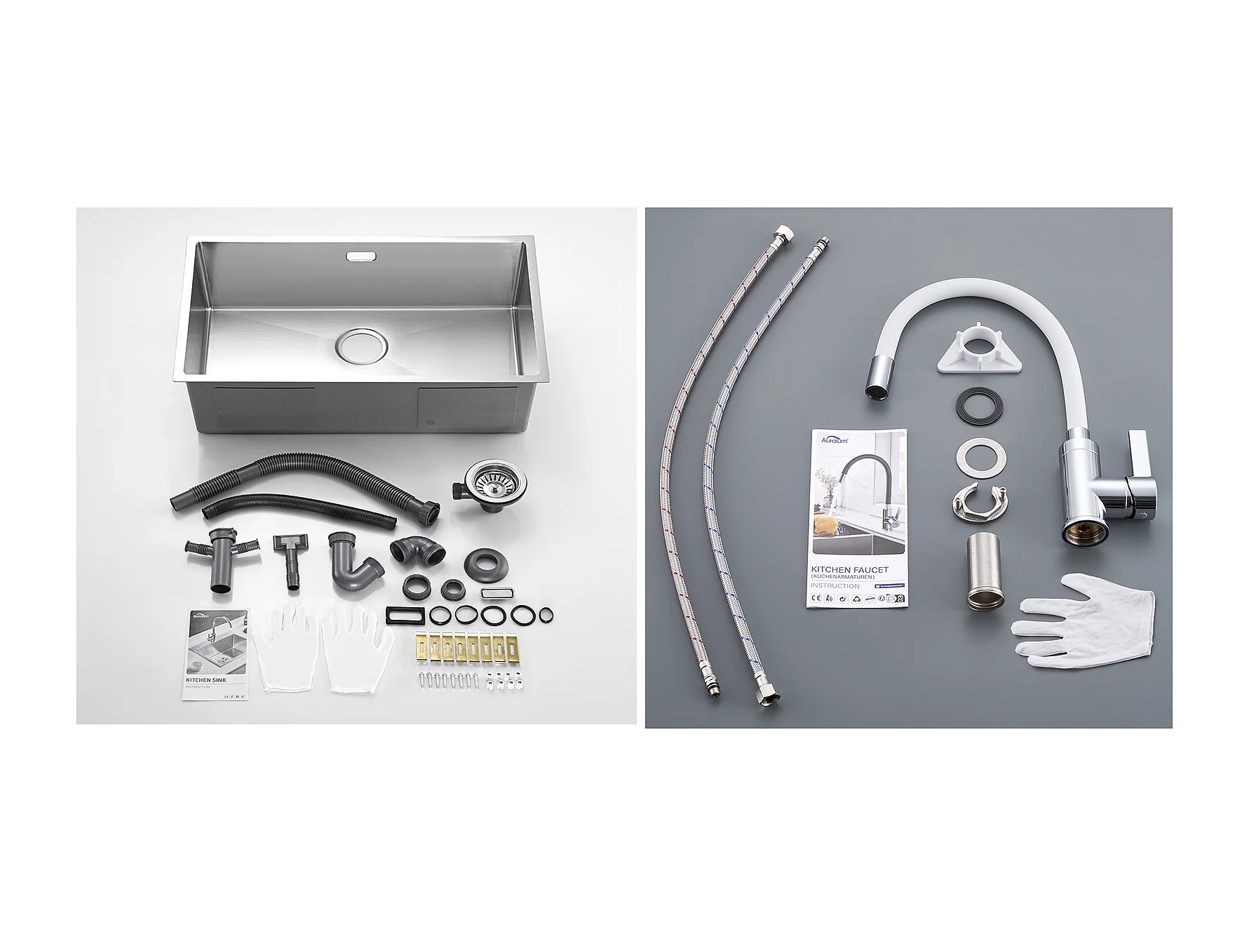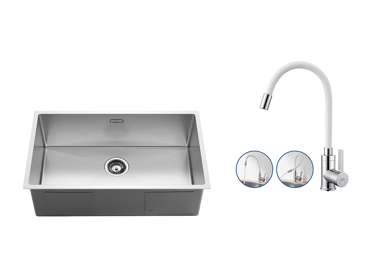 Einzelbecken-Küchenspüle 74*44*20CM 304 Edelstahl gebürstet Spüle mit Siphon und Überlauf + flexiblem Küchenhahn frei schwenkbarem hohen Auslauf, weiß
