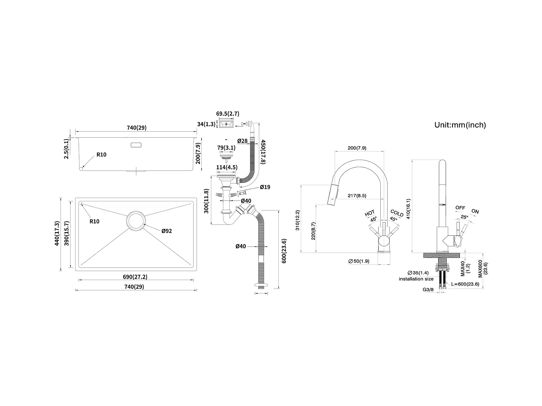 Einzelbecken-Küchenspüle 74*44*20CM 304 Edelstahl gebürstet Spüle mit Siphon und Überlauf + Küchenarmatur ausziehbare Brause Dunkelgrau 360° drehbar
