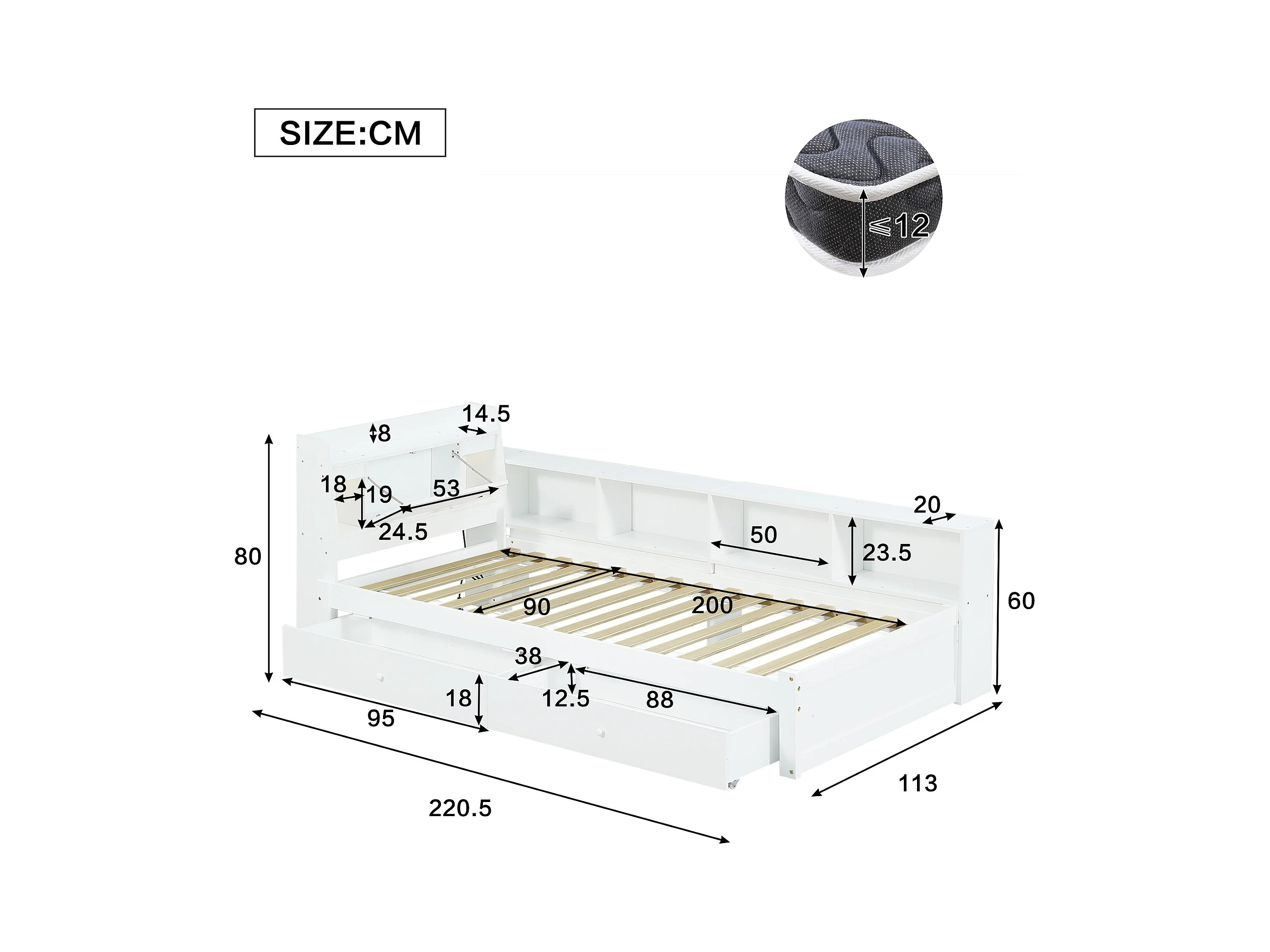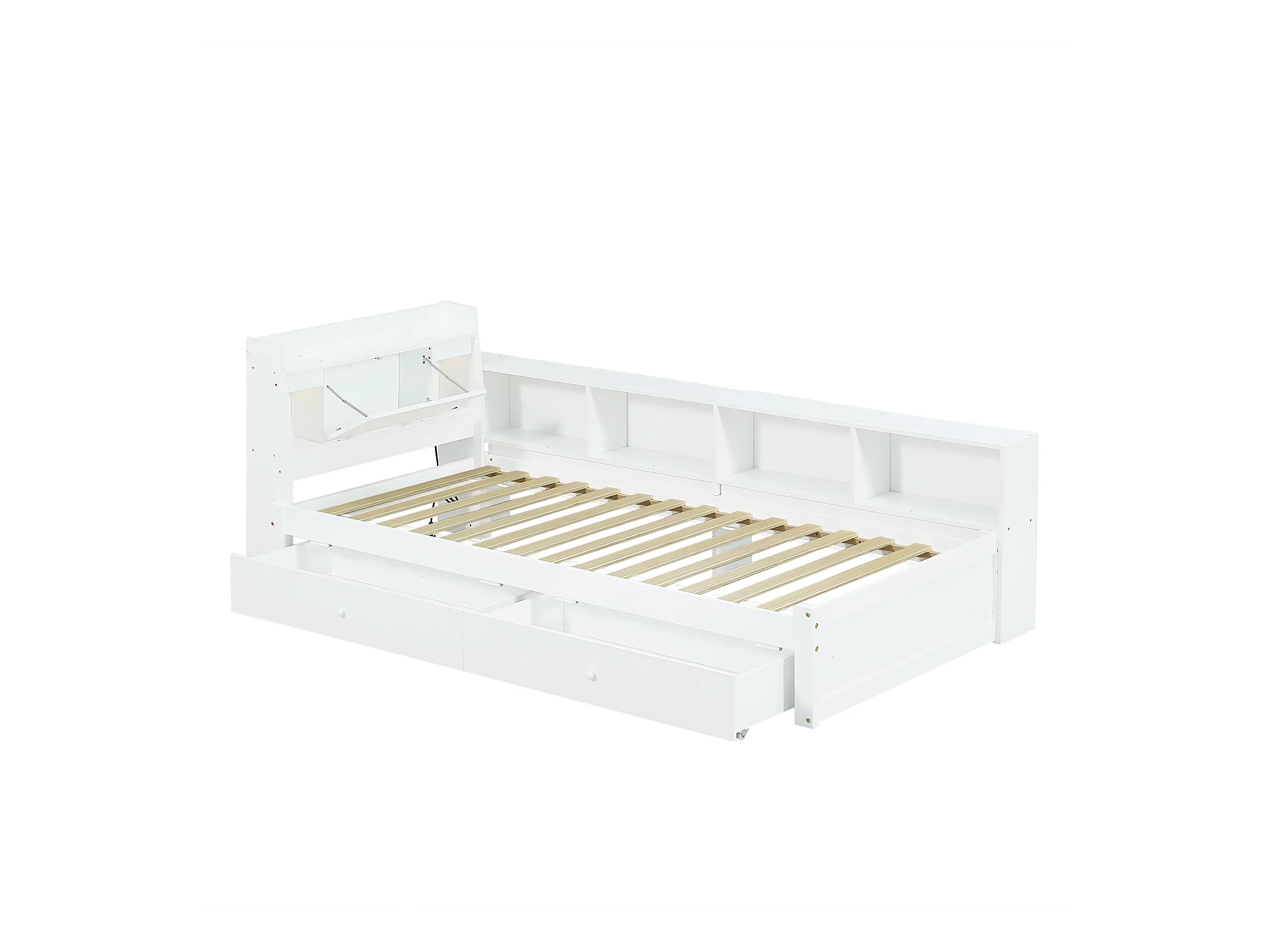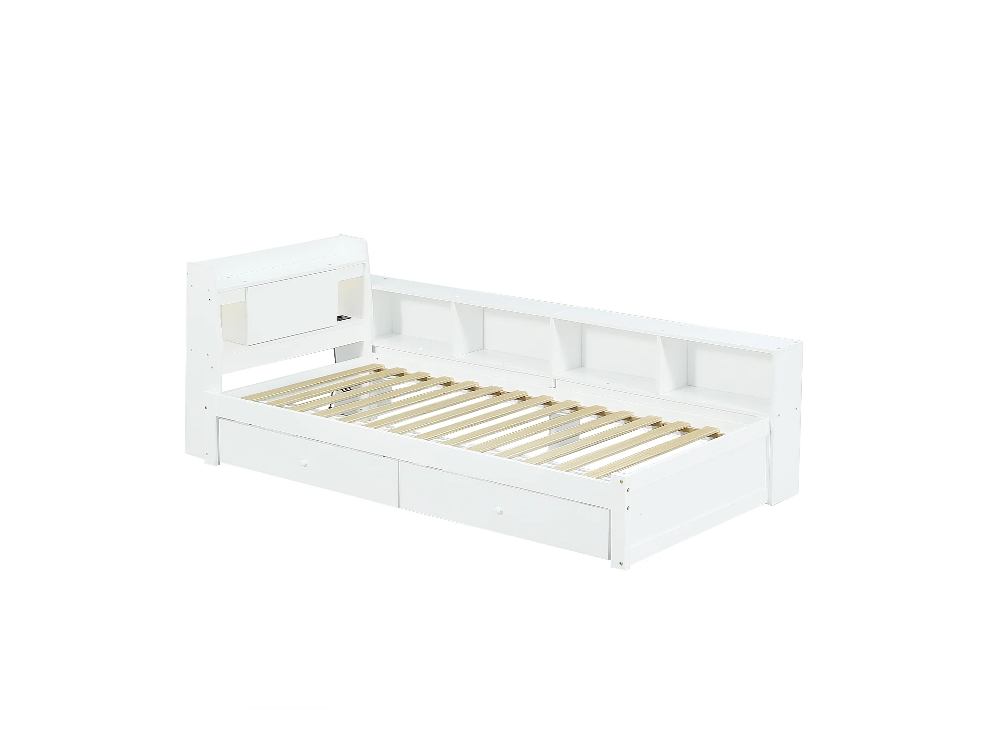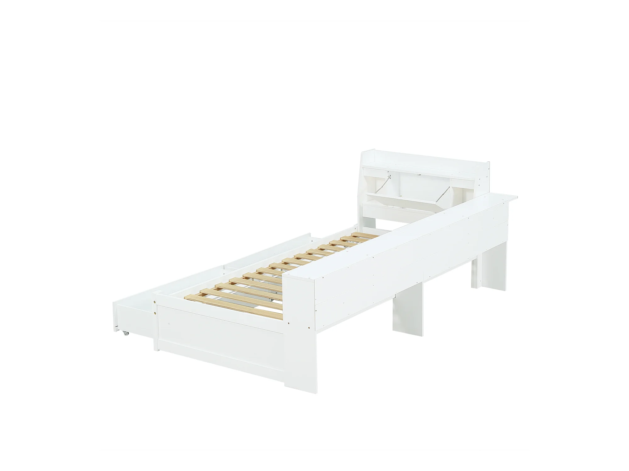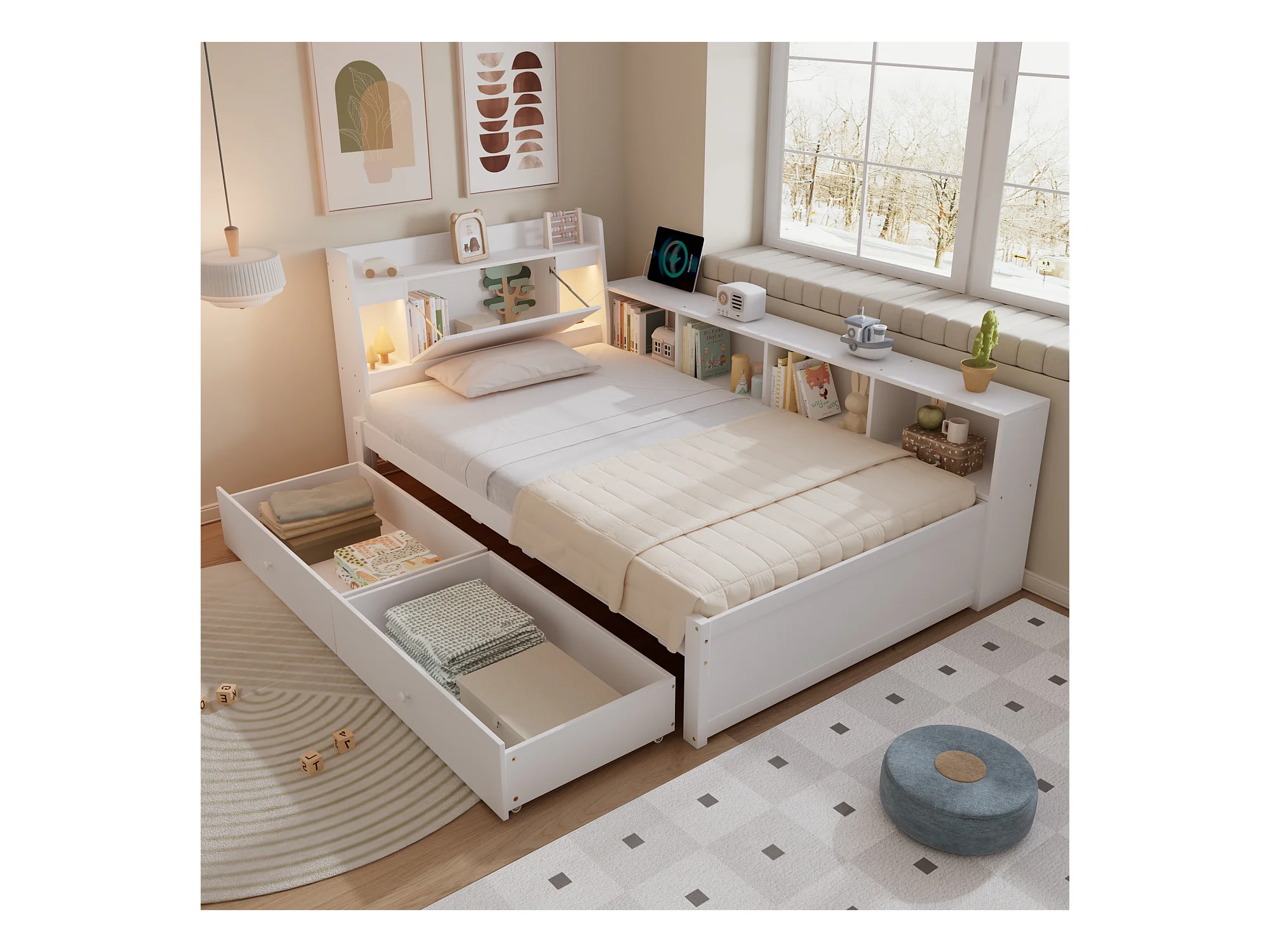 Einzelbett, Paneel, Kopfteil (Stauraum + 2 Leuchten), Ladesteckdose, Schränke, Schubladen, Kiefer + Spanplatte + MDF, weiß, 90x200cm