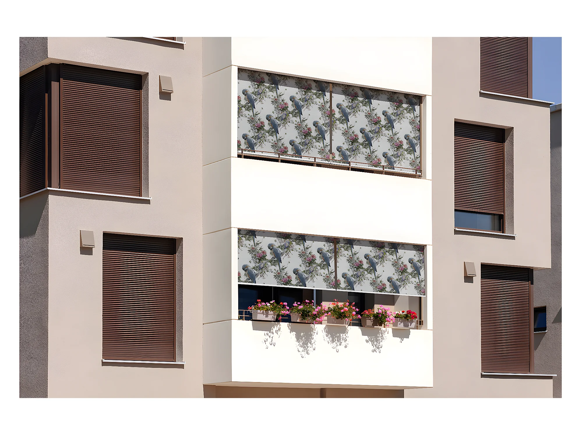 Einzigartiges Rollo für den Außenbereich – 140 x 290 cm – Papageien unter Blumen. Balkonvorhang, Balkonrollos, Sonnenschutzvorhang