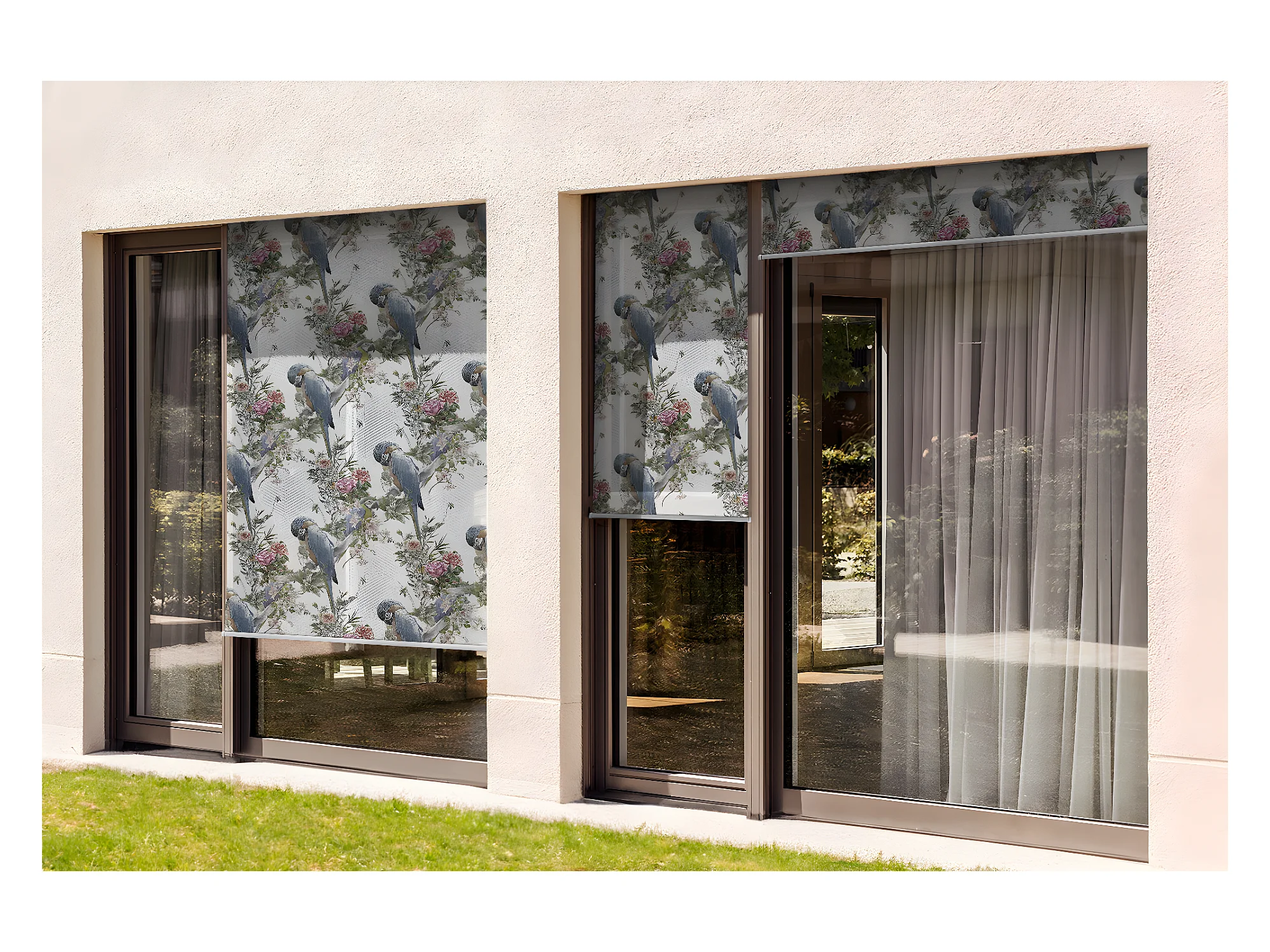 Einzigartiges Rollo für den Außenbereich – 40 x 180 cm – Papageien unter Blumen. Balkonvorhang, Balkonrollos, Sonnenschutzvorhang