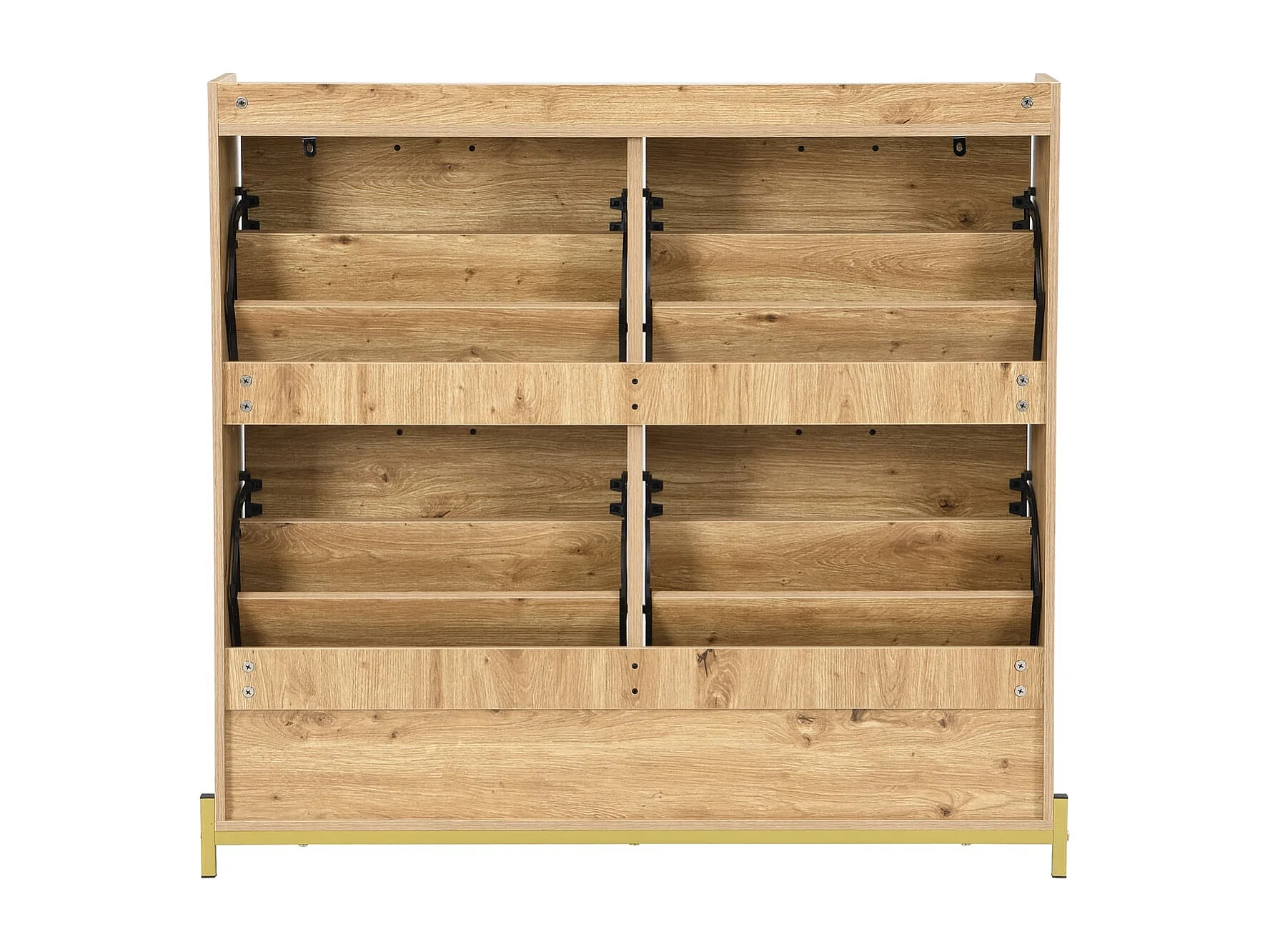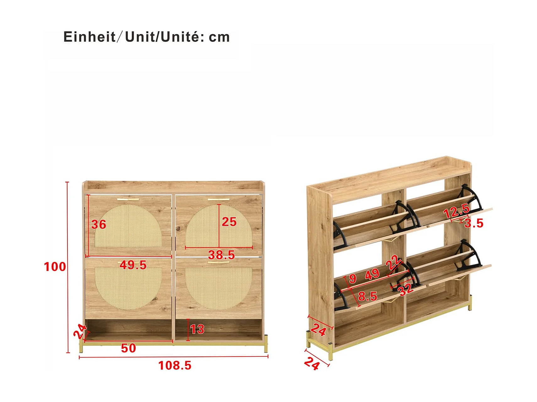 Eleganter Schuhschrank aus Holz mit Rattantüren – 4 Türen, Metallrahmen und oberes Regal für stilvolle und übersichtliche Aufbewahrung.