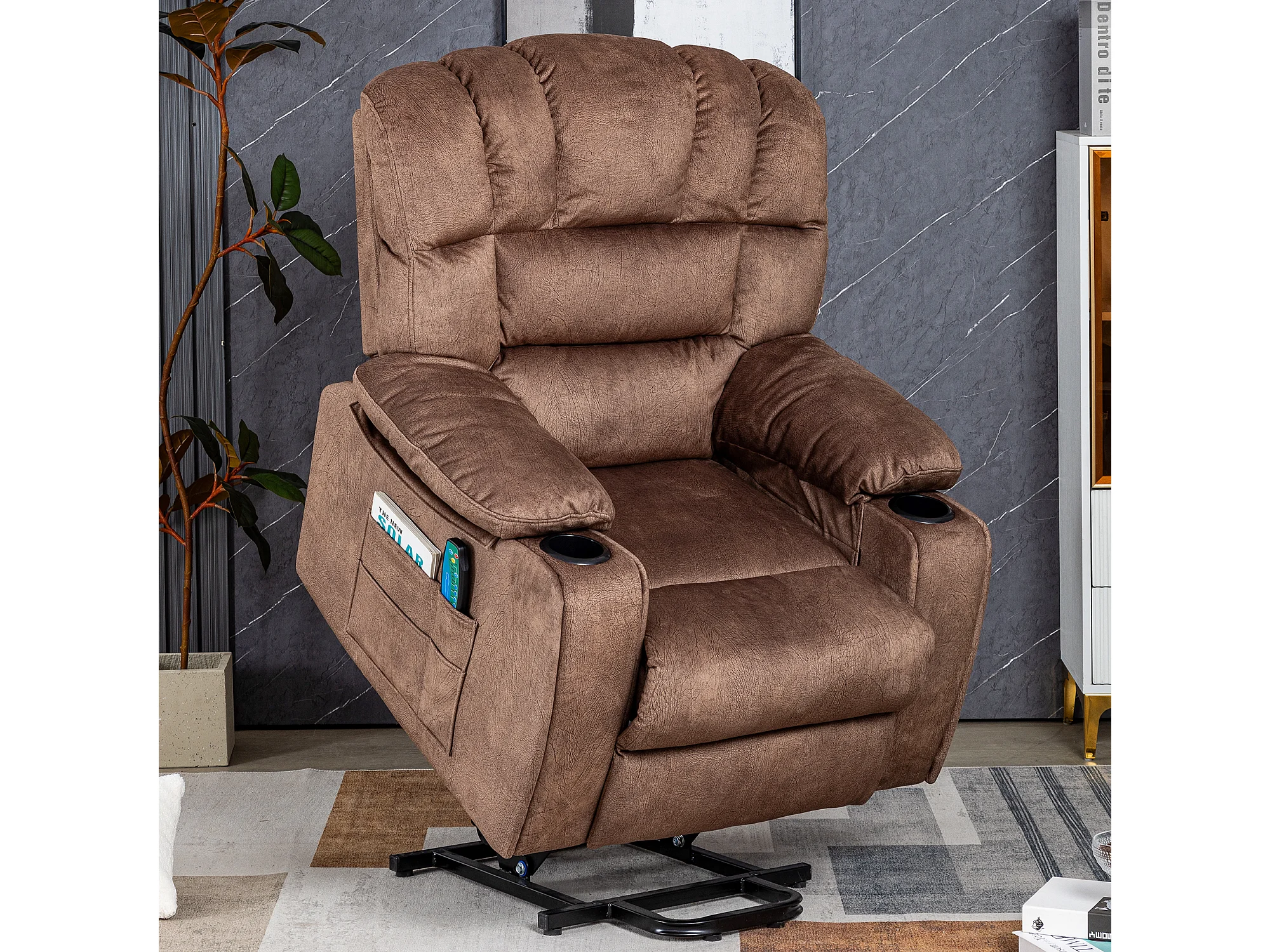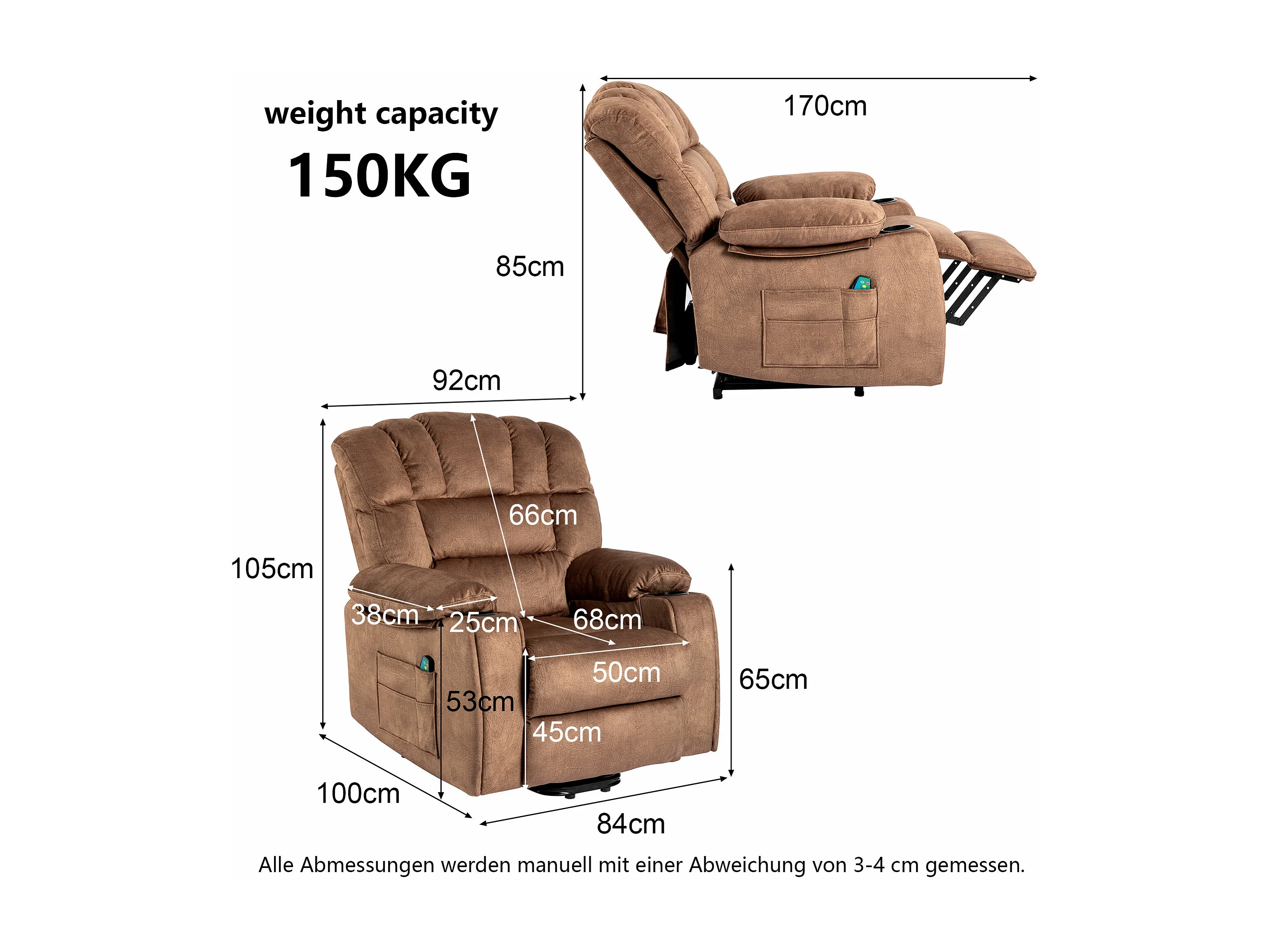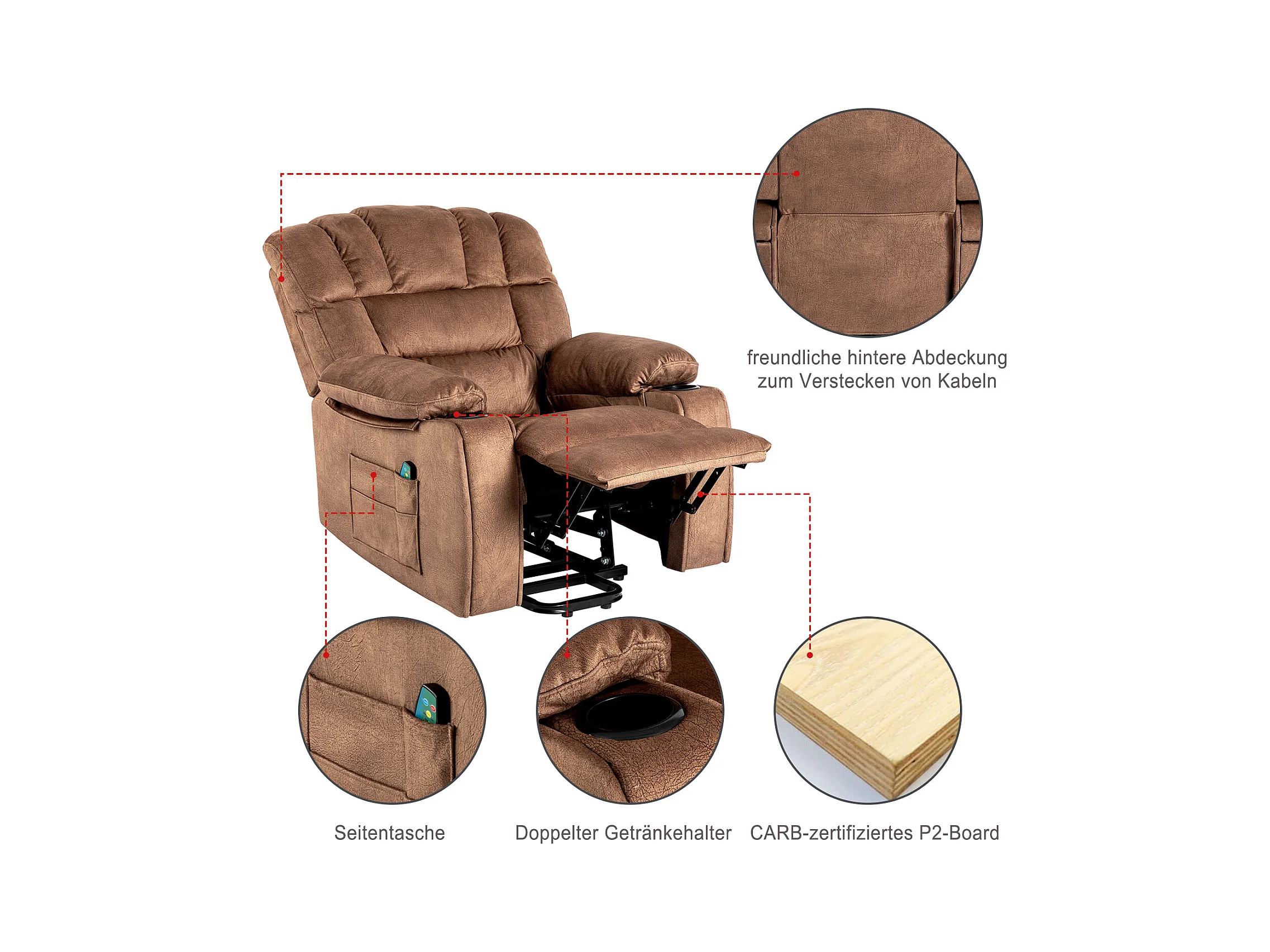Elektrisch verstellbarer Massagesessel, Liegestuhl aus Stoff mit 2 Getränkehaltern, Seitentaschen und Fernbedienung für das Wohnzimmer, Braun