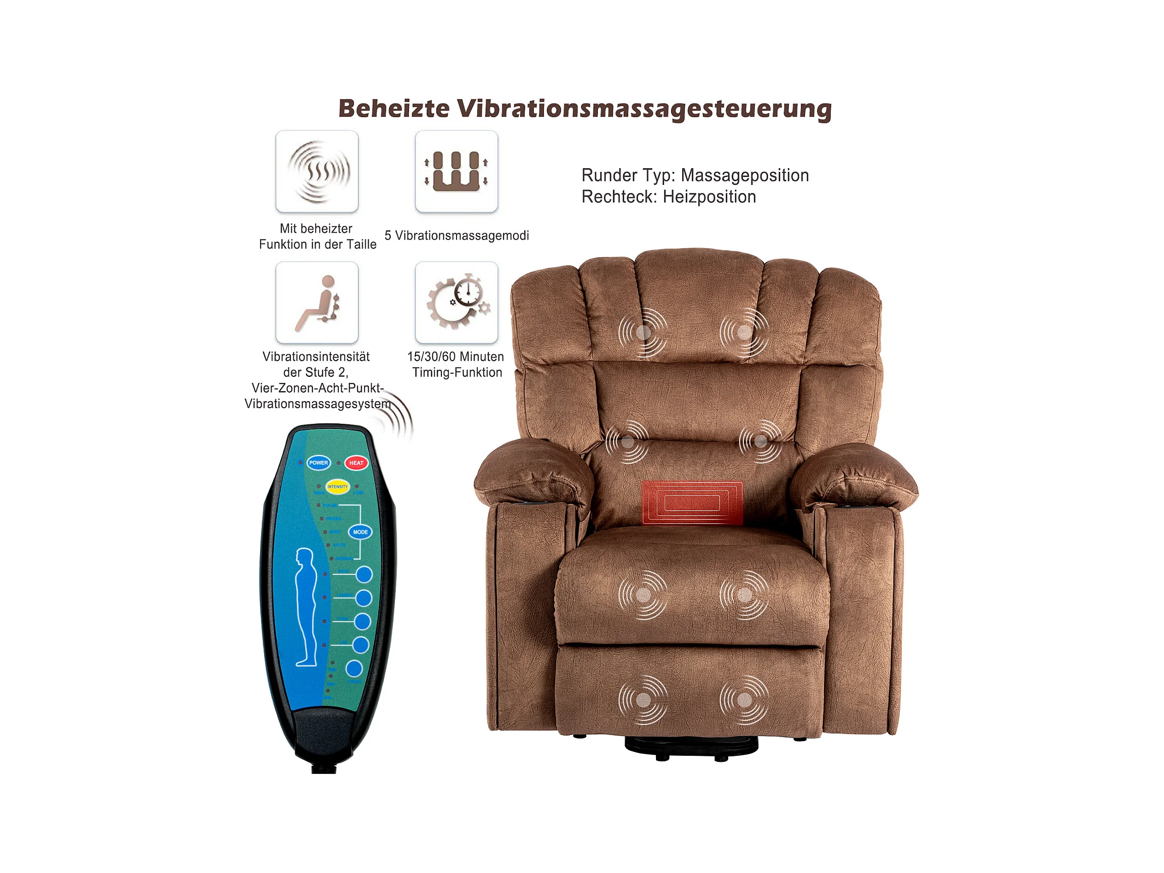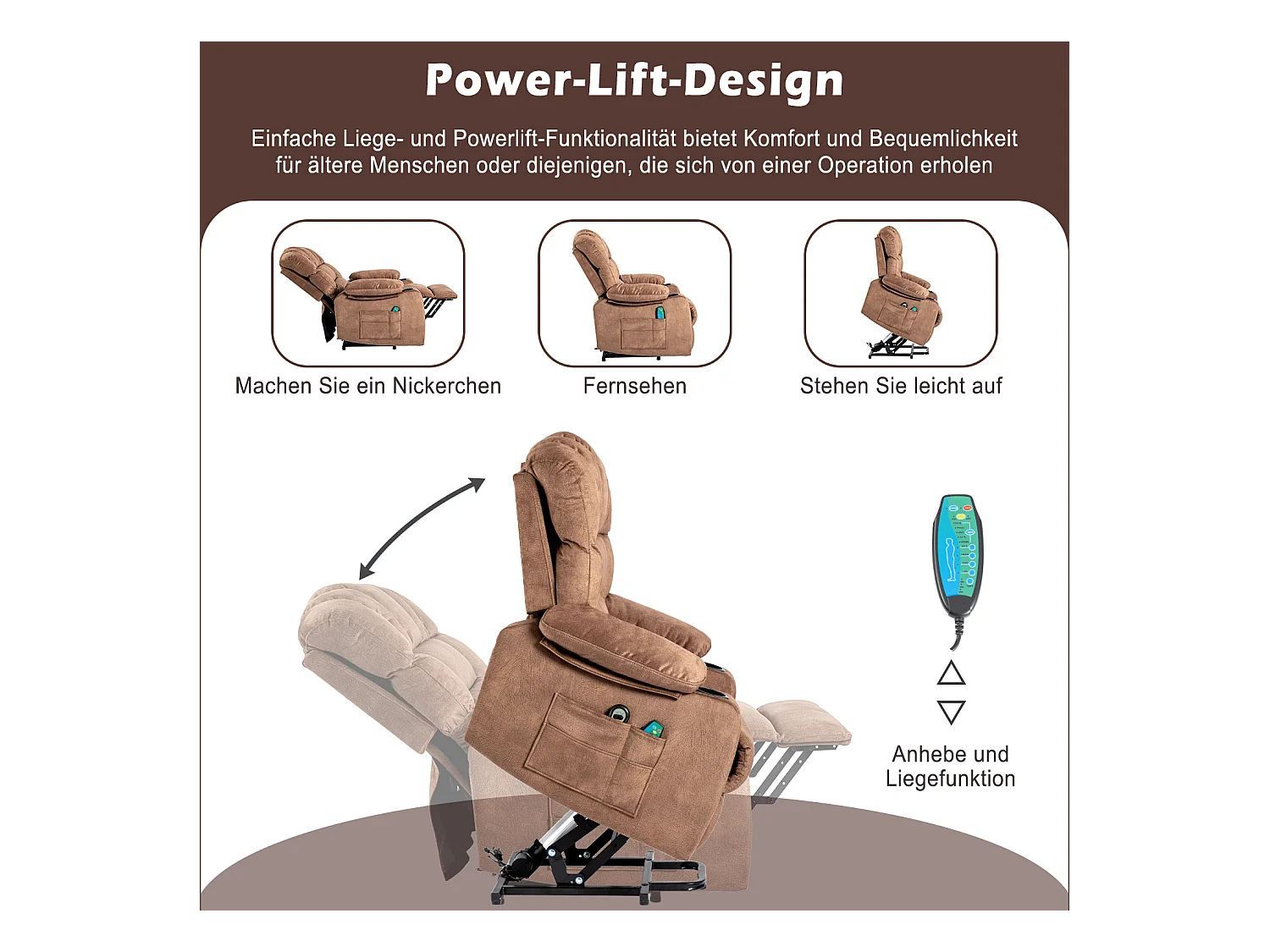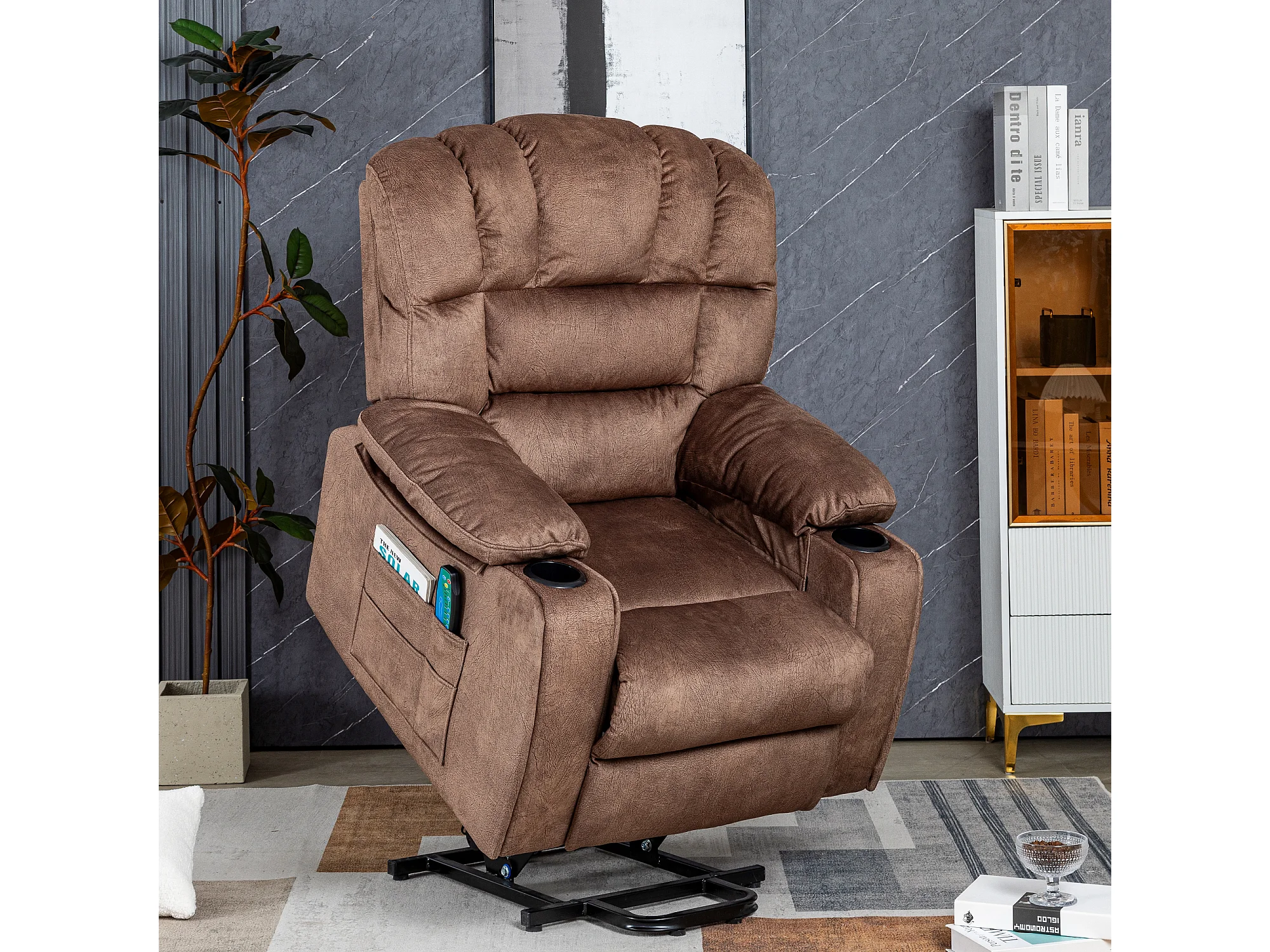 Elektrisch verstellbarer Massagesessel, Liegestuhl aus Stoff mit 2 Getränkehaltern, Seitentaschen und Fernbedienung für das Wohnzimmer, Braun
