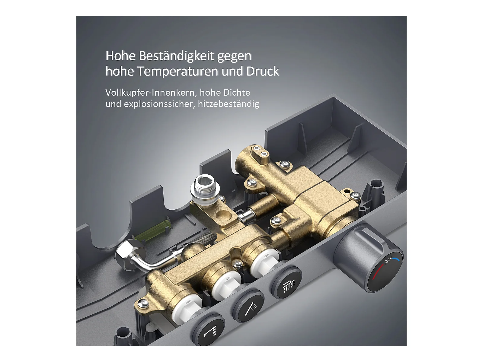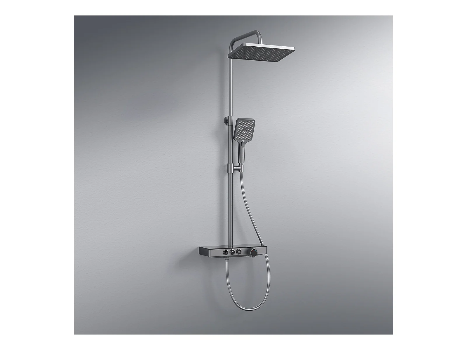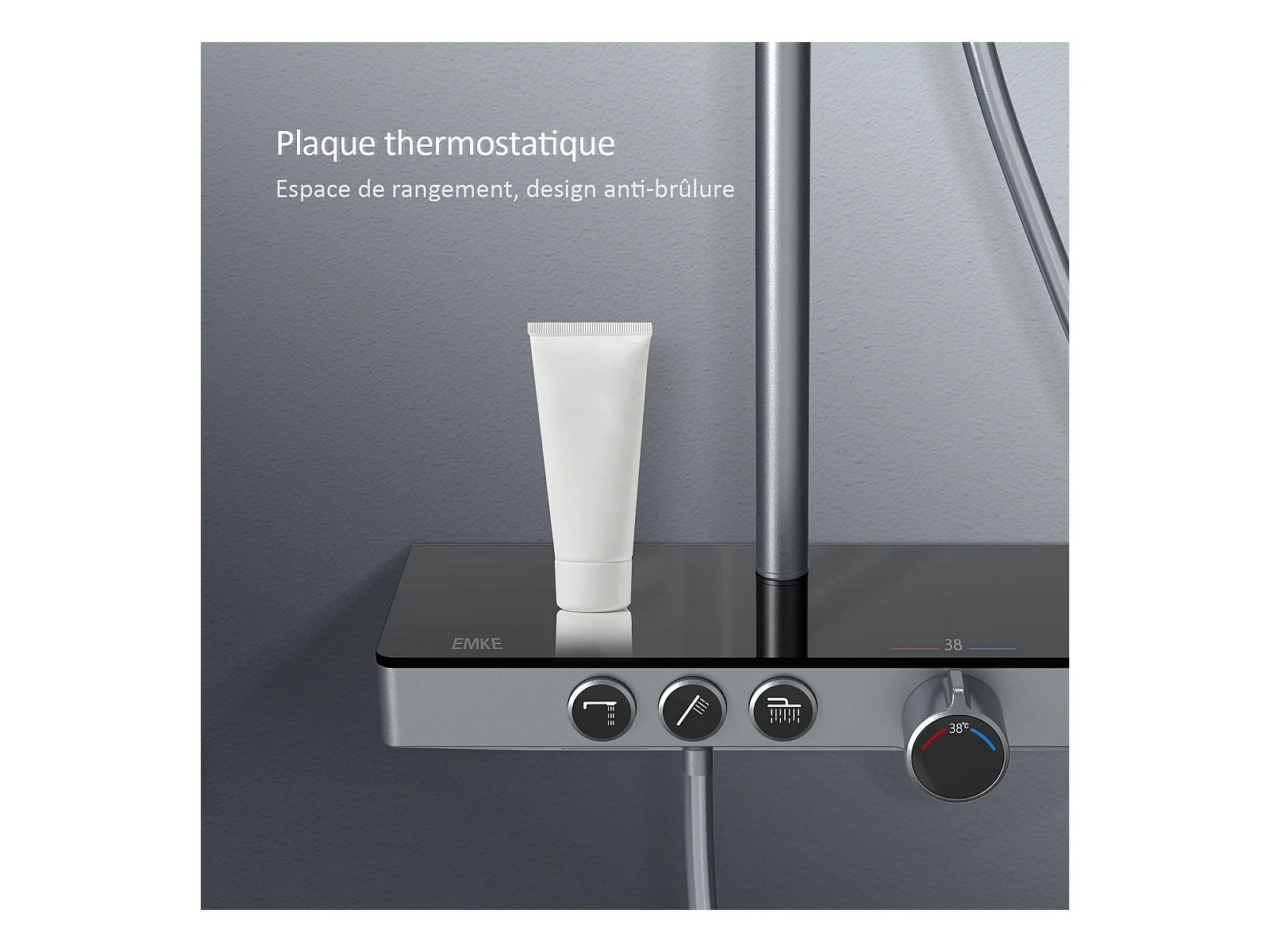 EMKE Thermostat-Duschsäule, 36 x 14 cm Glasregale, 3 Strahlarten, Regenbrause, KTW-Zertifizierung, Metallgrau