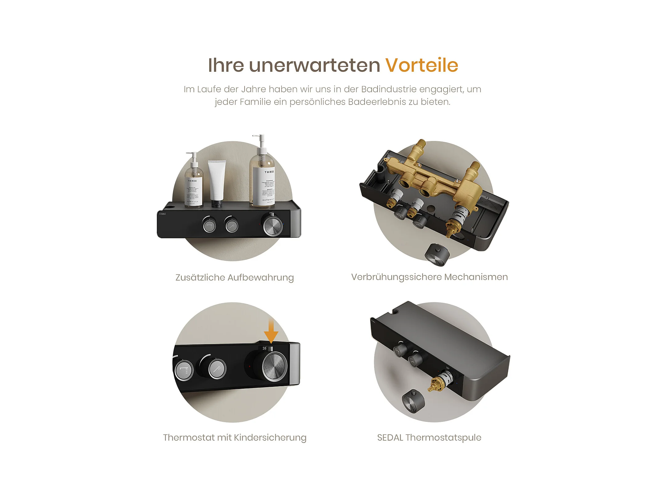 EMKE Thermostat-Duschsäule – Matt Anthrazit, einstellbarer Wasserfluss, separates minimalistisches Design, 3-funktionale Handbrause, Duschset