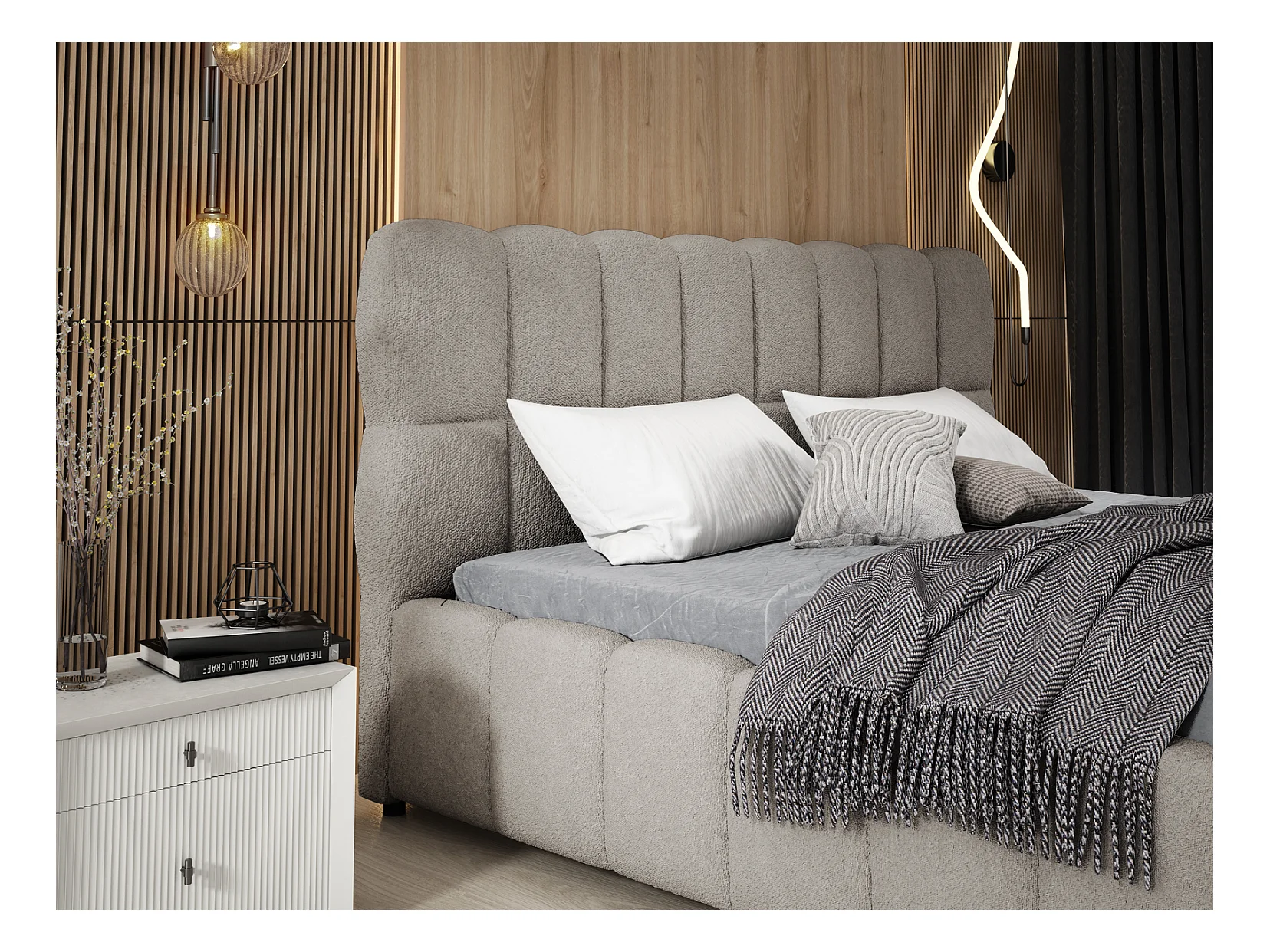 Emporius Avilla Polsterbett 140x200 - Doppelbett mit Bettkasten, Lattenrost, Kopfteil - Bett Bouclé Hellgrau (Anthology 15)