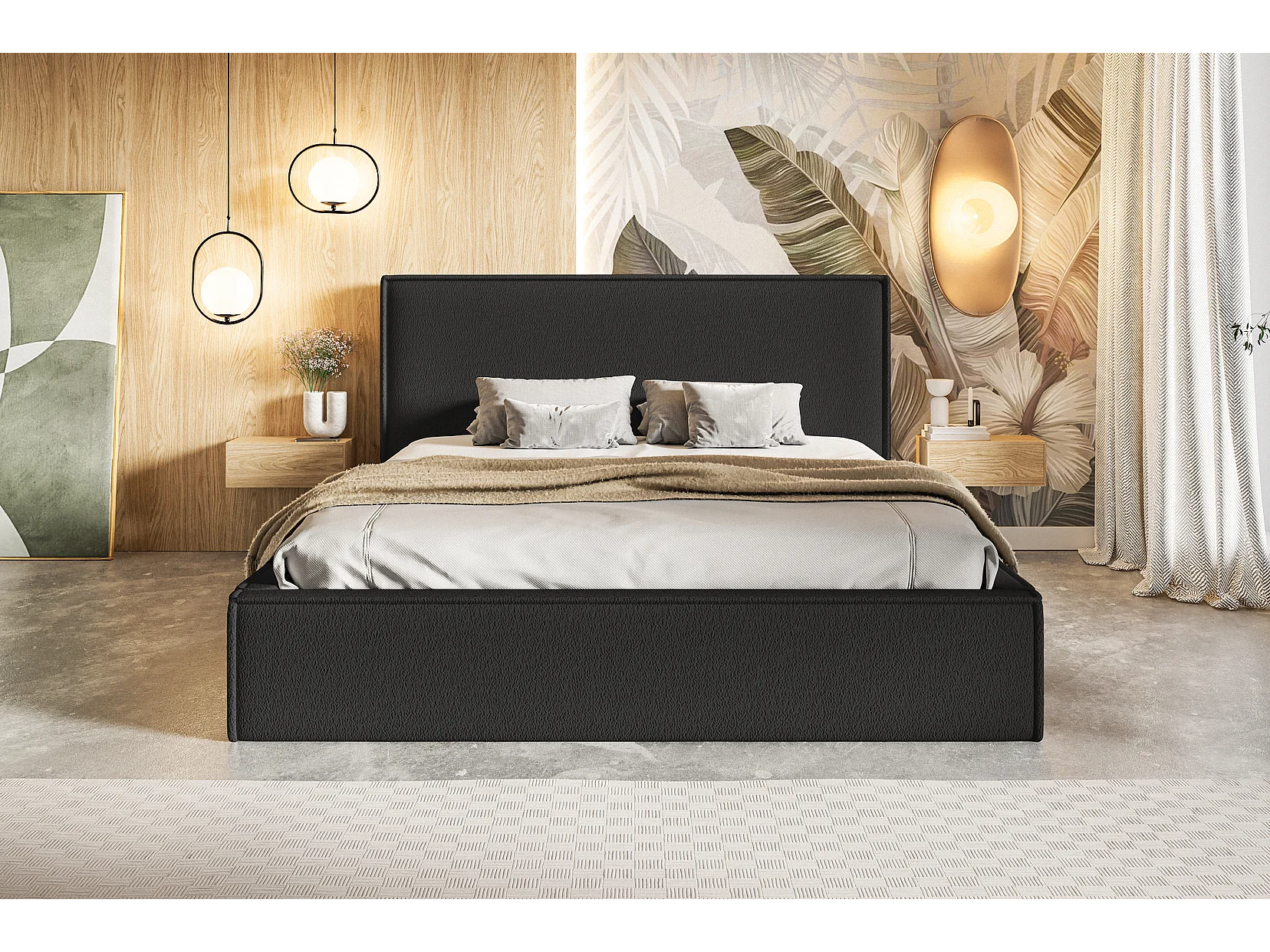 Emporius Polsterbett 160x200 Kyoto - Doppelbett vom Hersteller, Samtstoff, Bettkasten, Lattenrost - bett Bouclé Schwarz (Anthology 19)