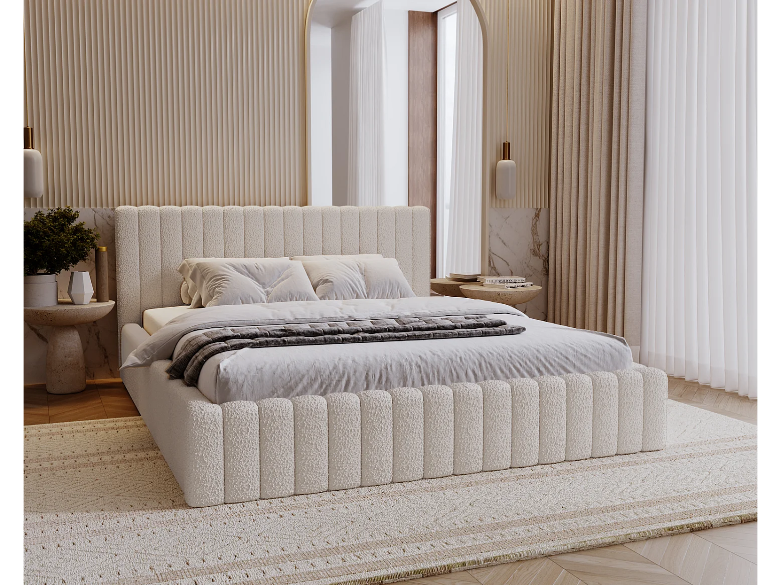 Emporius Polsterbett 200x200 cm Billo - Doppelbett mit Lattenrost und Kopfteil - Stauraum, Bettzeugkasten, Bettkasten - Boucle Creme (Anthology 1)
