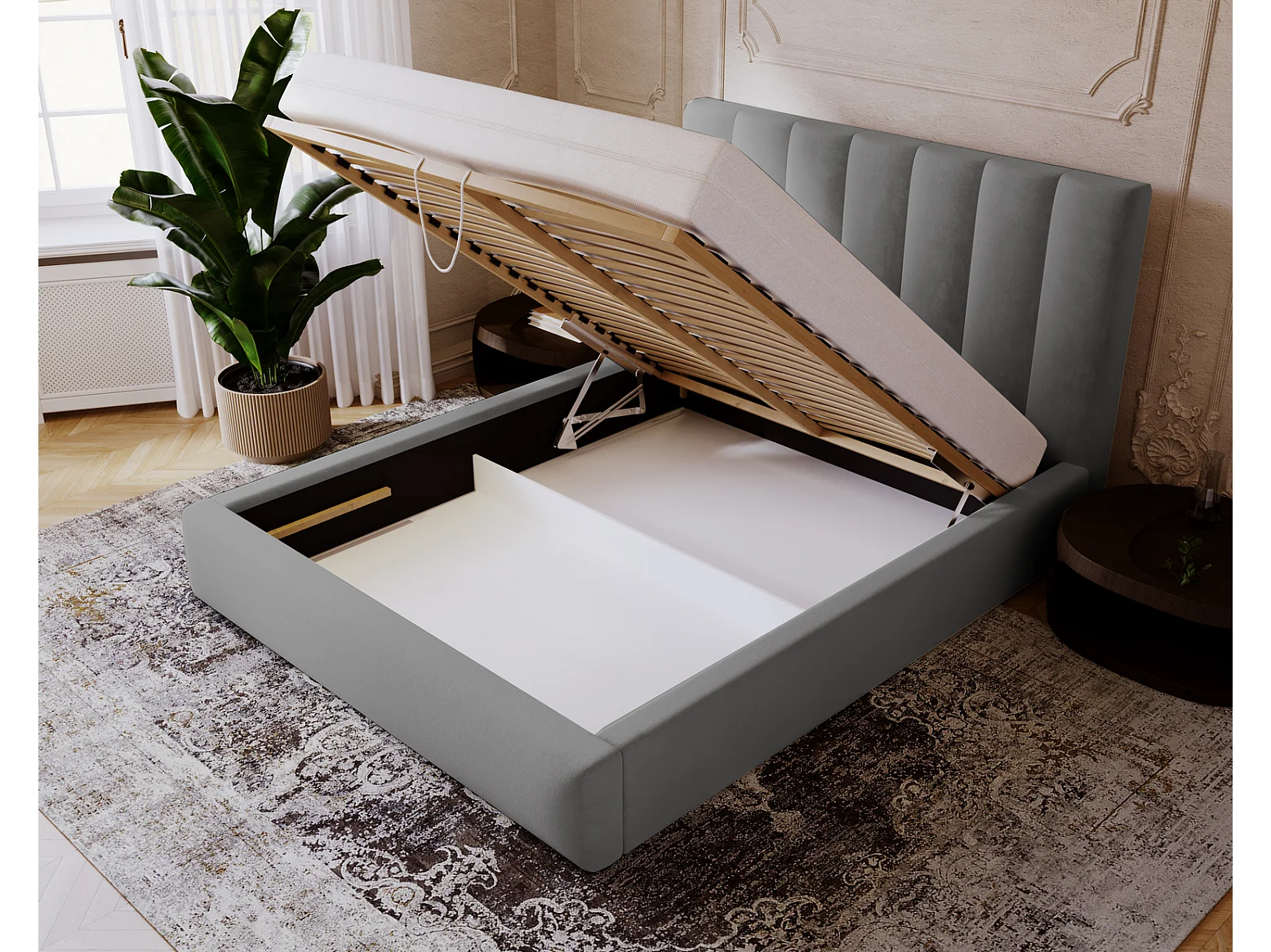 Emporius Velor Polsterbett 160x200 mit Bettkasten, Doppelbett, Kopfteil, Samtstoff, Bett Grau (Magic Velvet 2217)