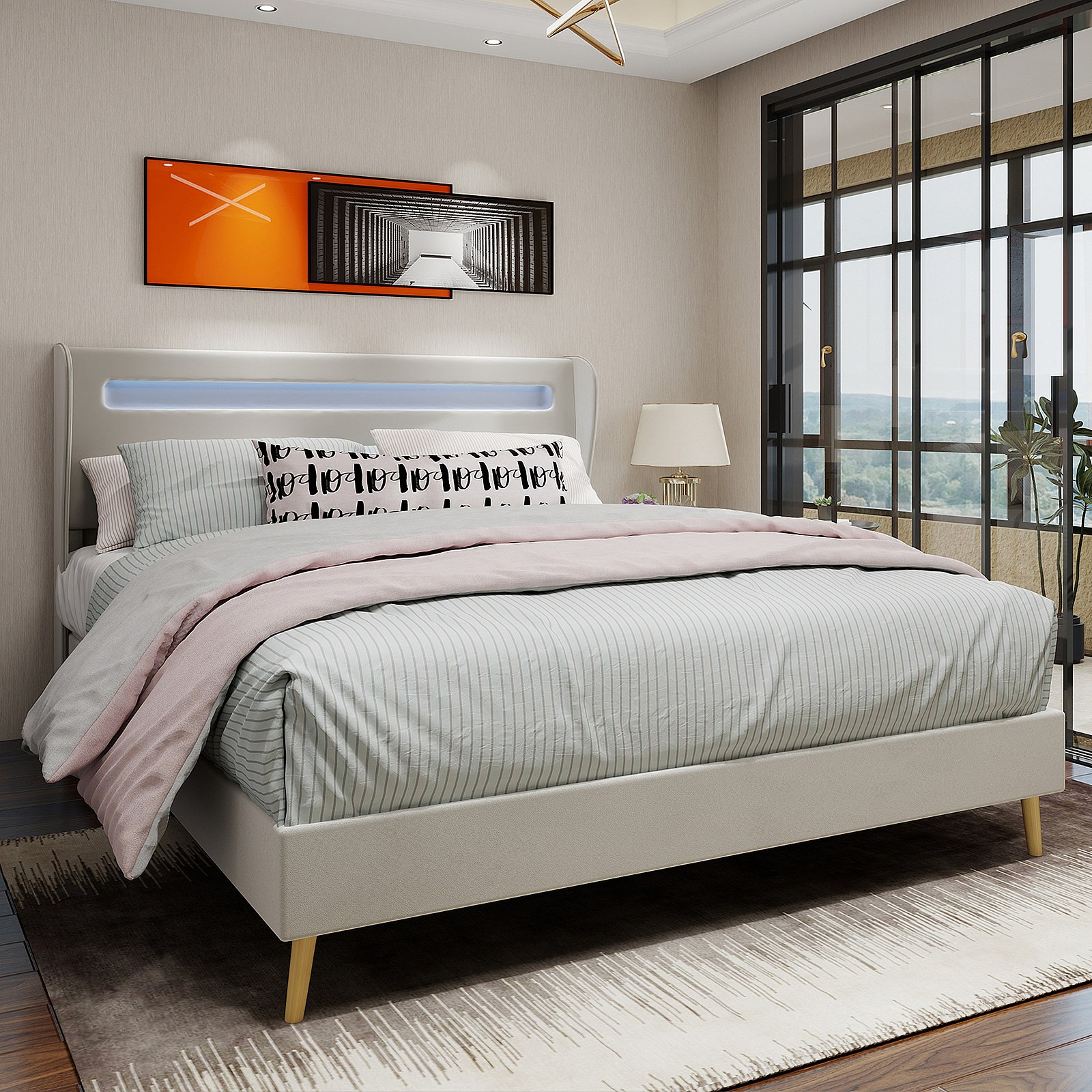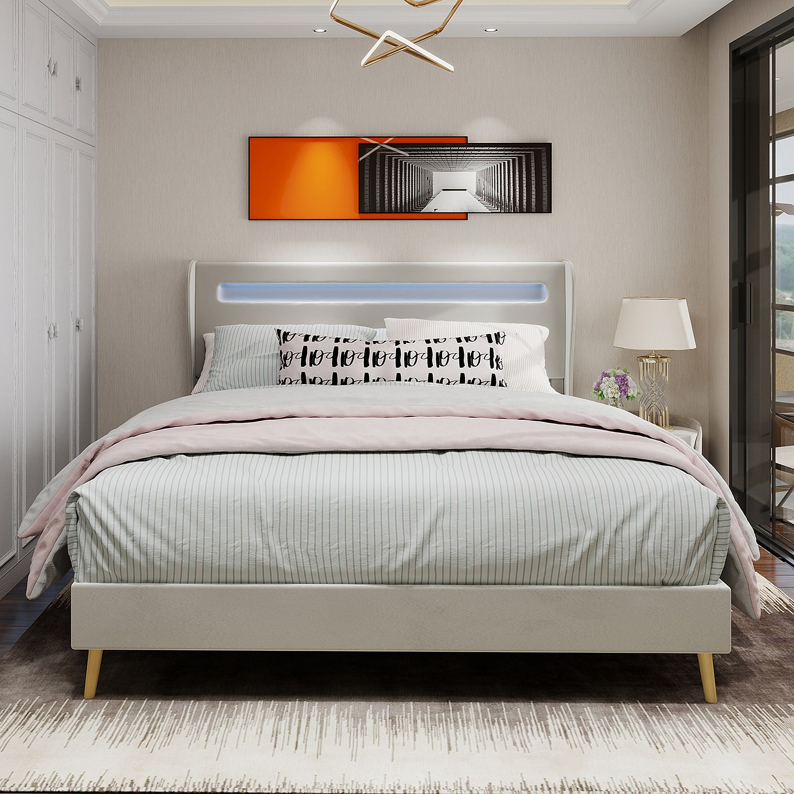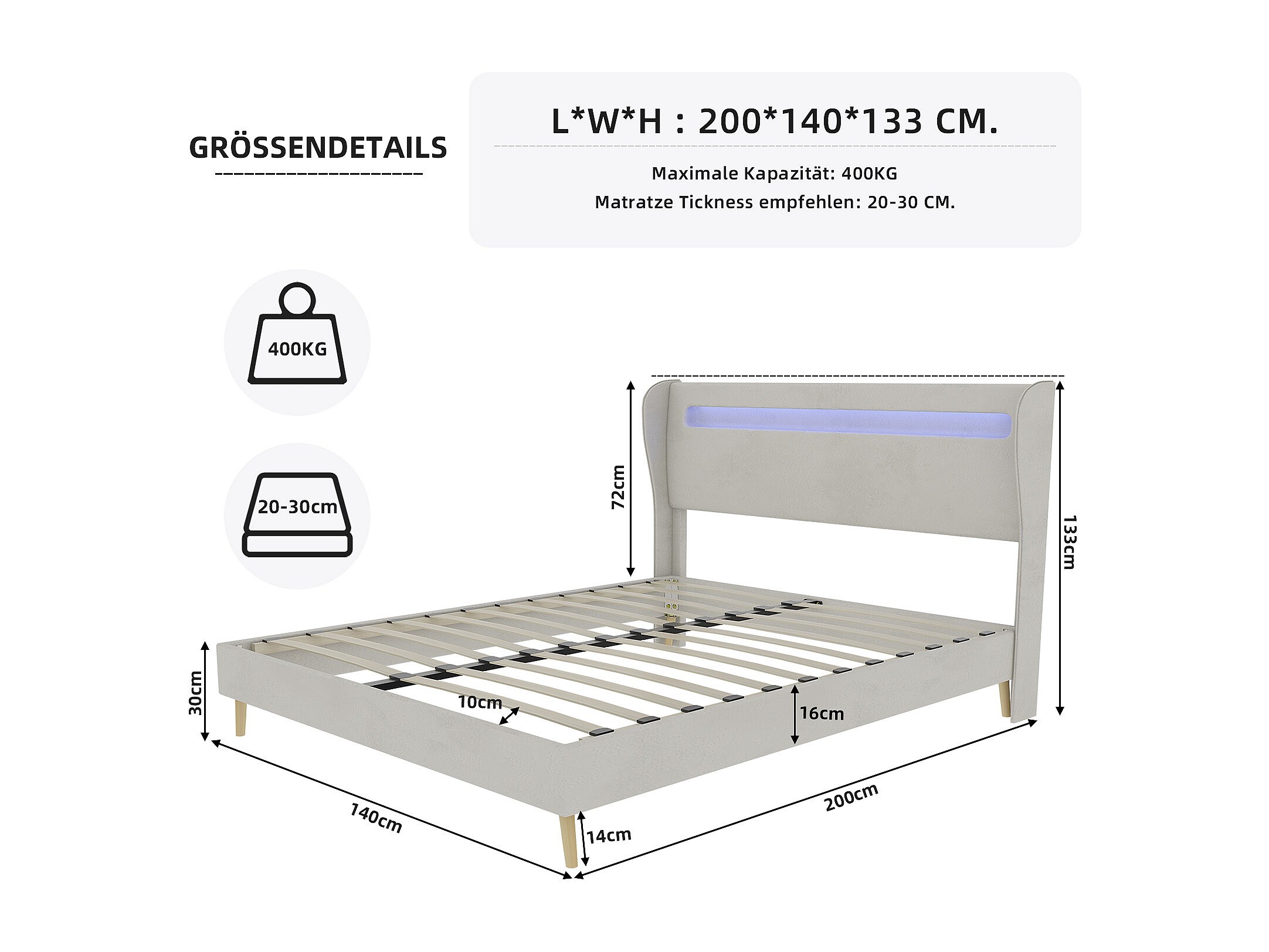 Erwachsenenbett 140 x 200 cm – Doppelbett mit LED-Beleuchtung und weichem Kopfteil – beiger Samt – Matratze nicht enthalten