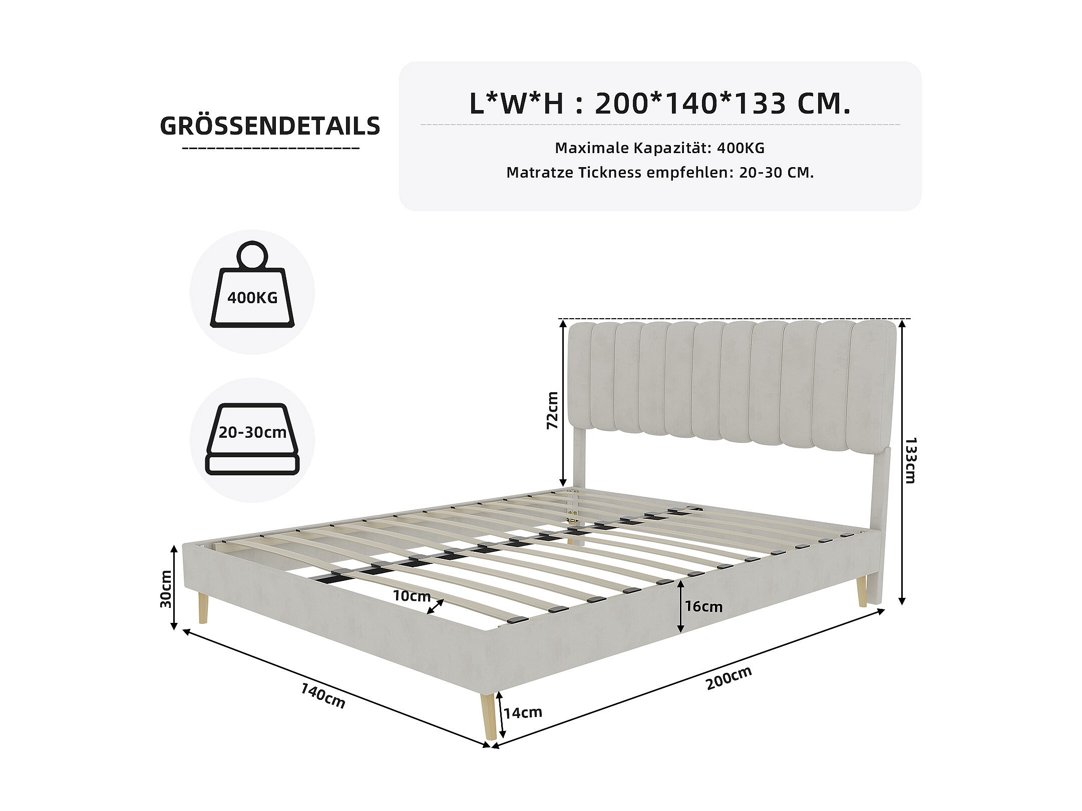 Erwachsenenbett 140 x 200 cm – Doppelbett mit weichem Kopfteil und Holzbeinen – beiger Samt – Matratze nicht enthalten