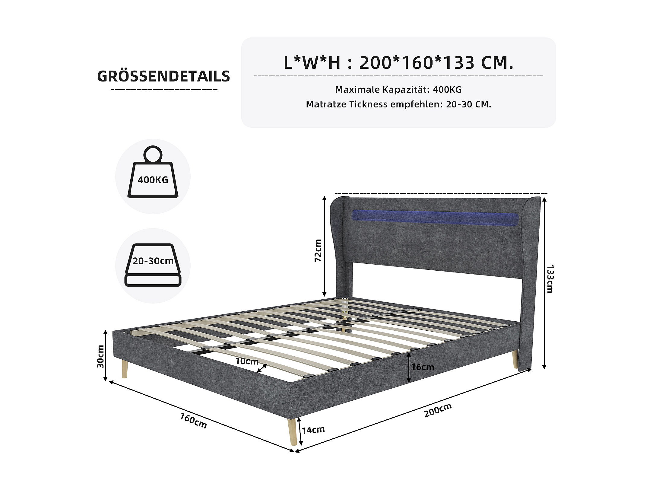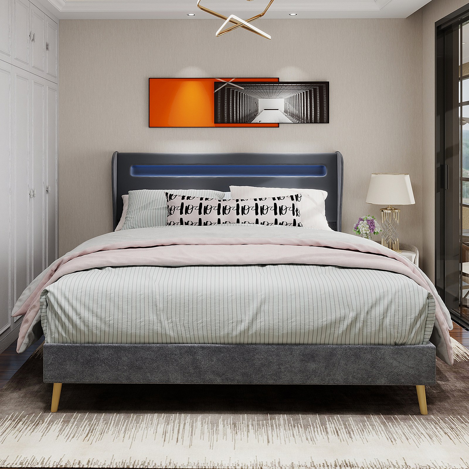 Erwachsenenbett 160 x 200 cm – Doppelbett mit LED-Beleuchtung und weichem Kopfteil – grauer Samt – Matratze nicht enthalten