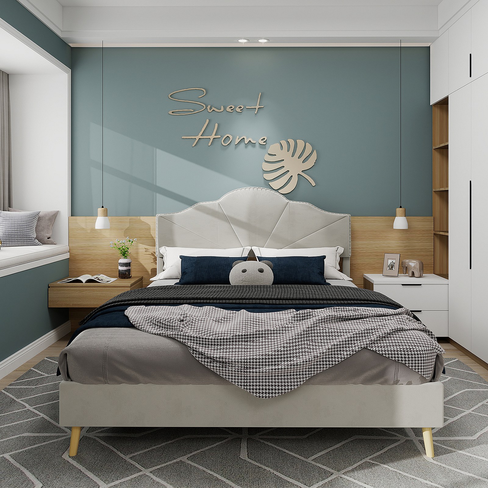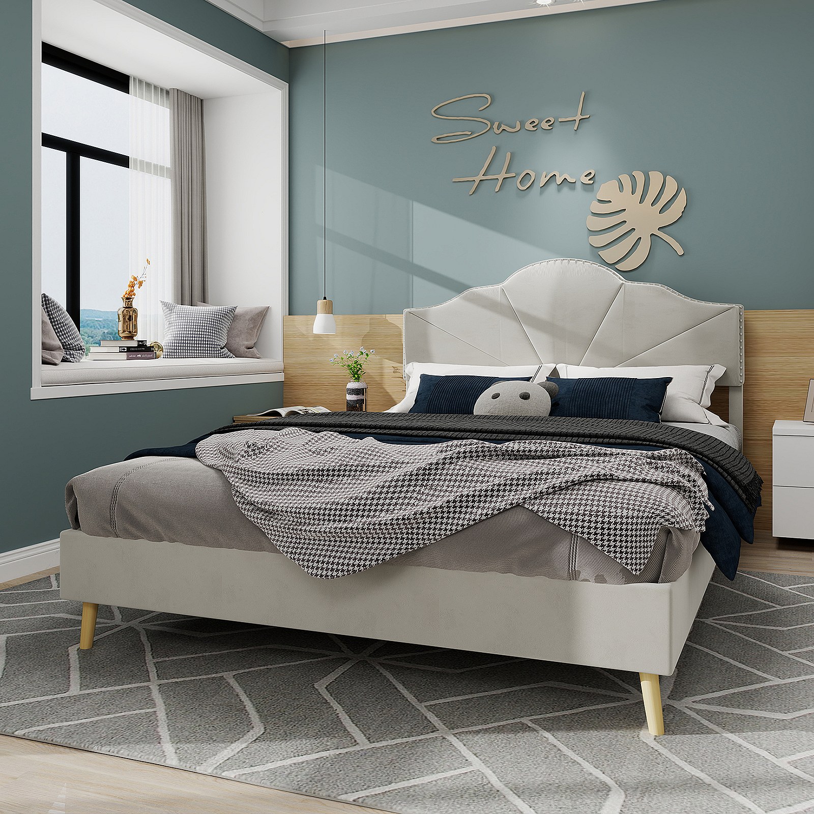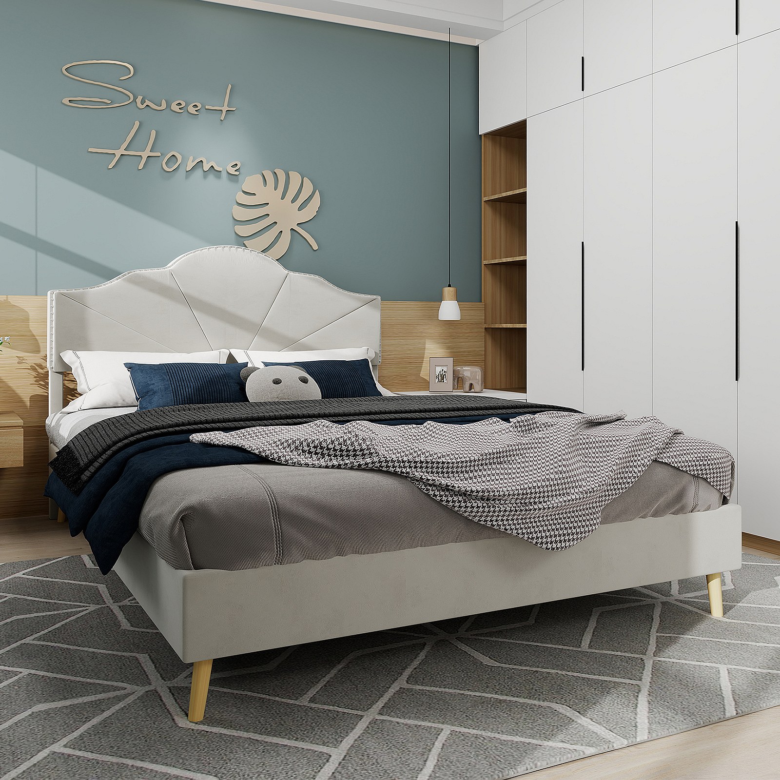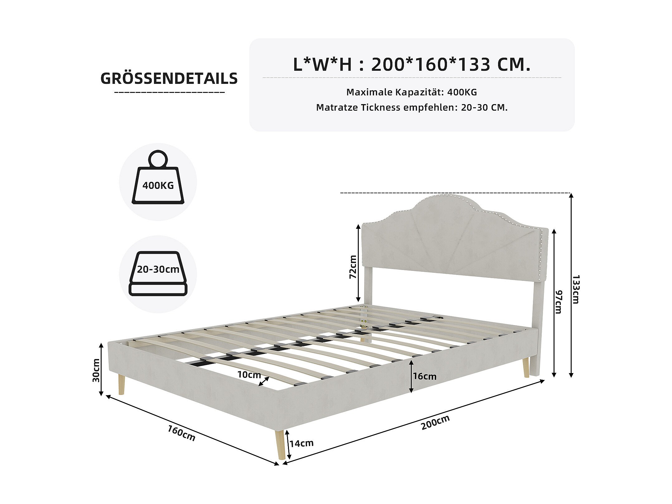 Erwachsenenbett 160 x 200 cm - Doppelbett mit weichem Kopfteil und Holzbeinen - beiger holländischer Samt