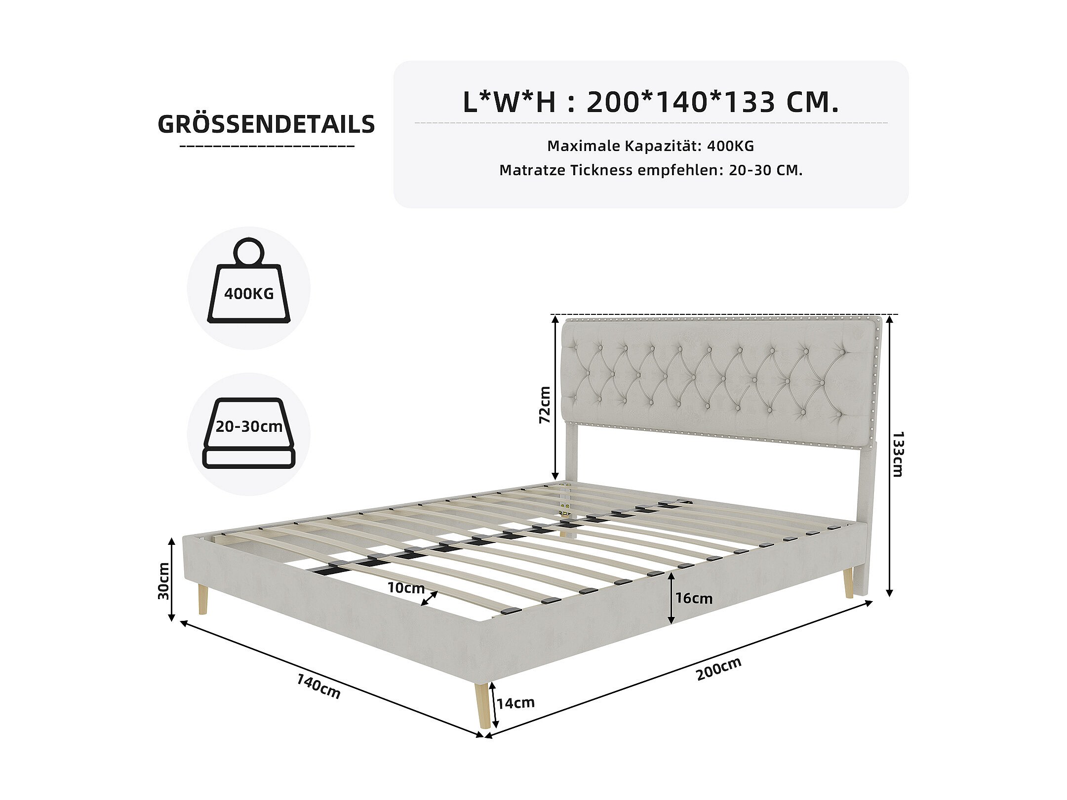 Erwachsenenbett 160 x 200 cm - Doppelbett mit weichem Kopfteil und Holzbeinen - beiger Samt - ohne Matratze