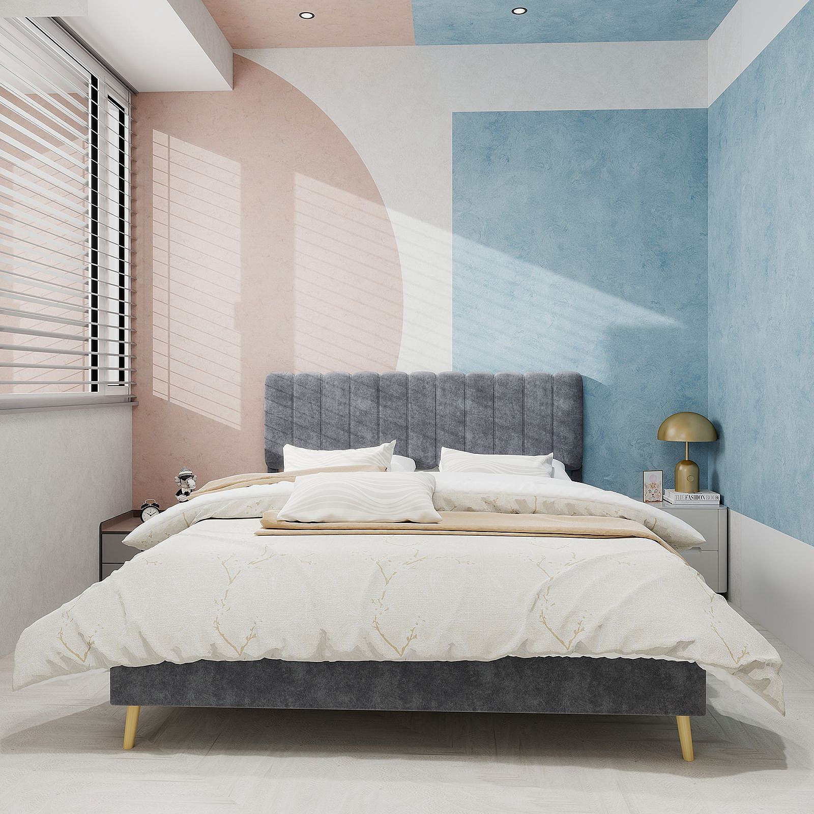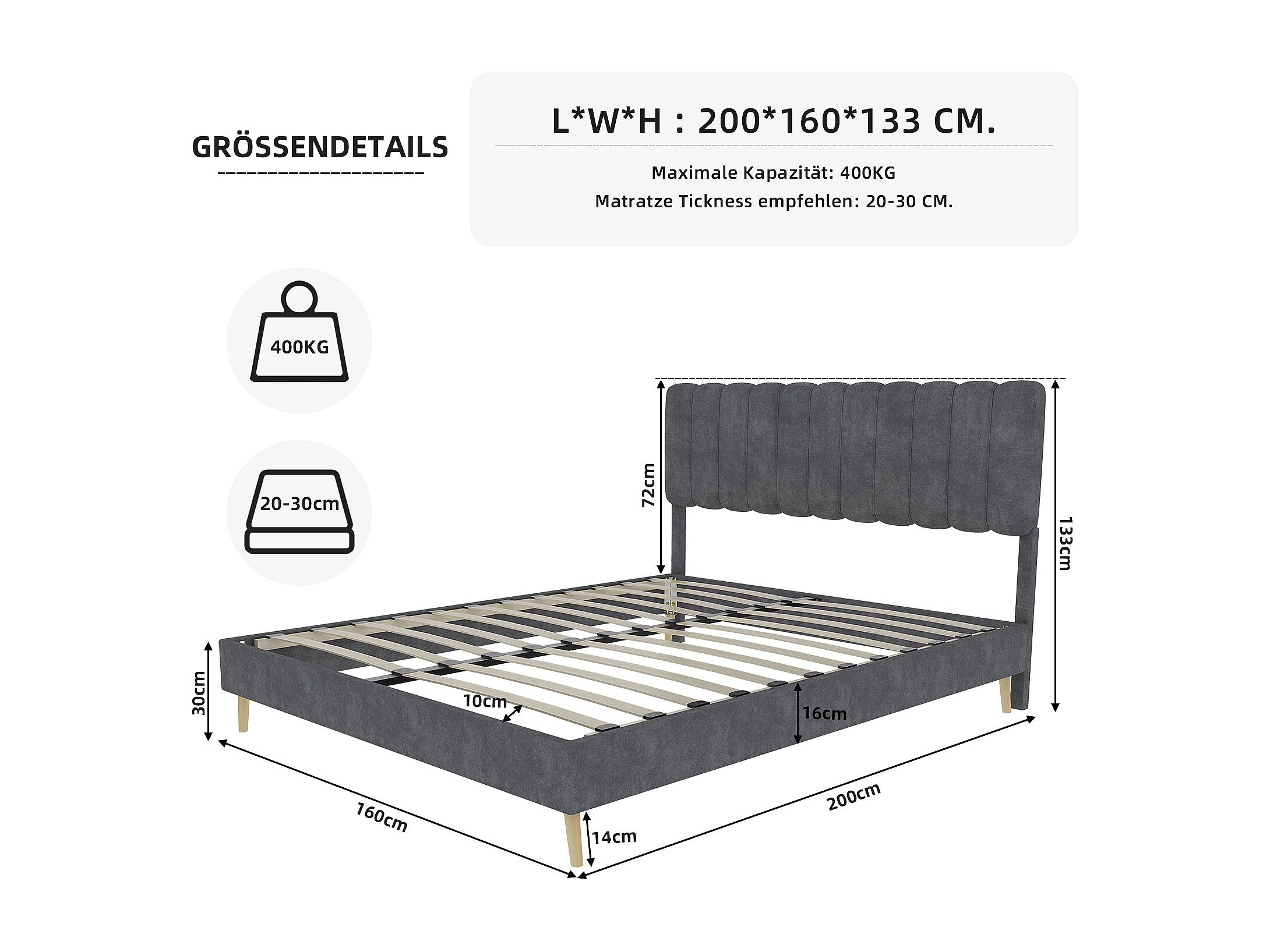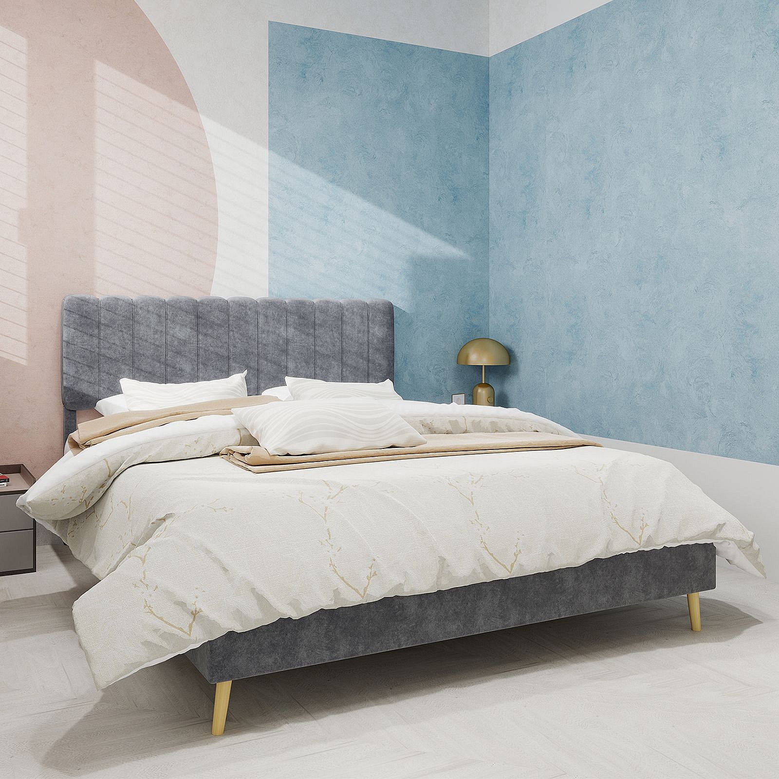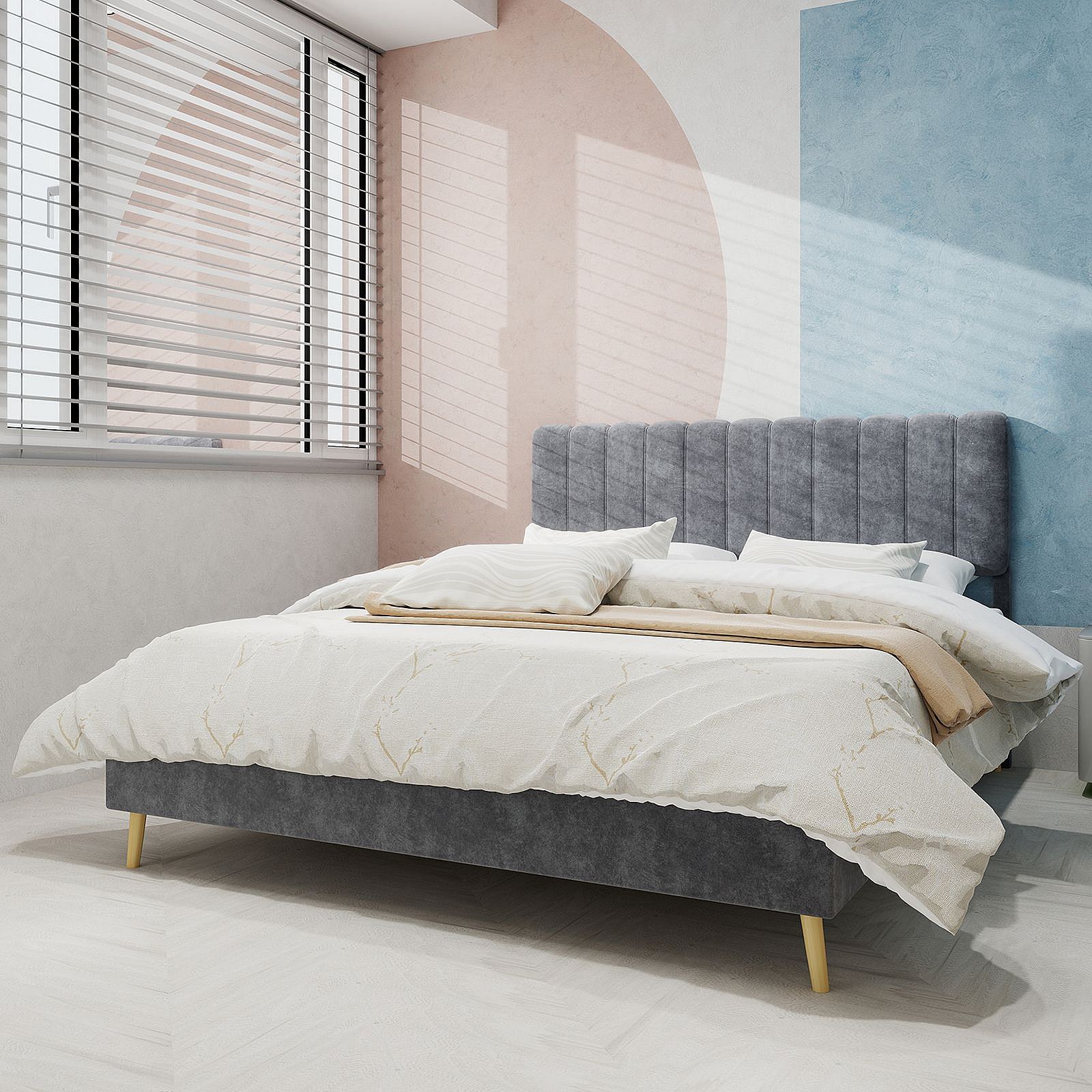 Erwachsenenbett 160 x 200 cm - Doppelbett mit weichem Kopfteil und Holzbeinen - grauer Samt - Matratze nicht enthalten