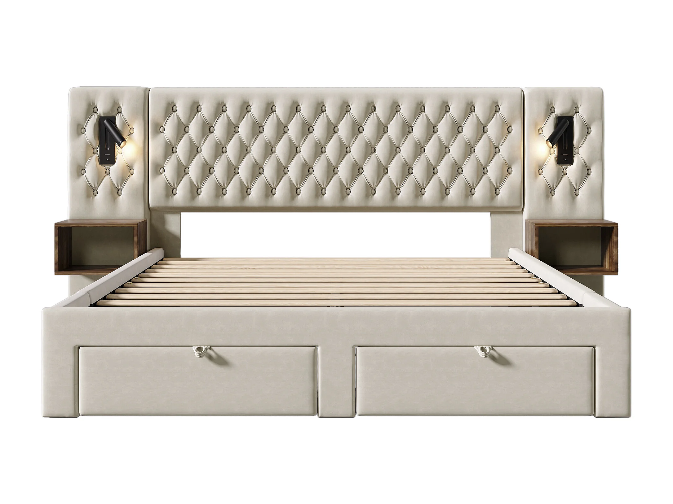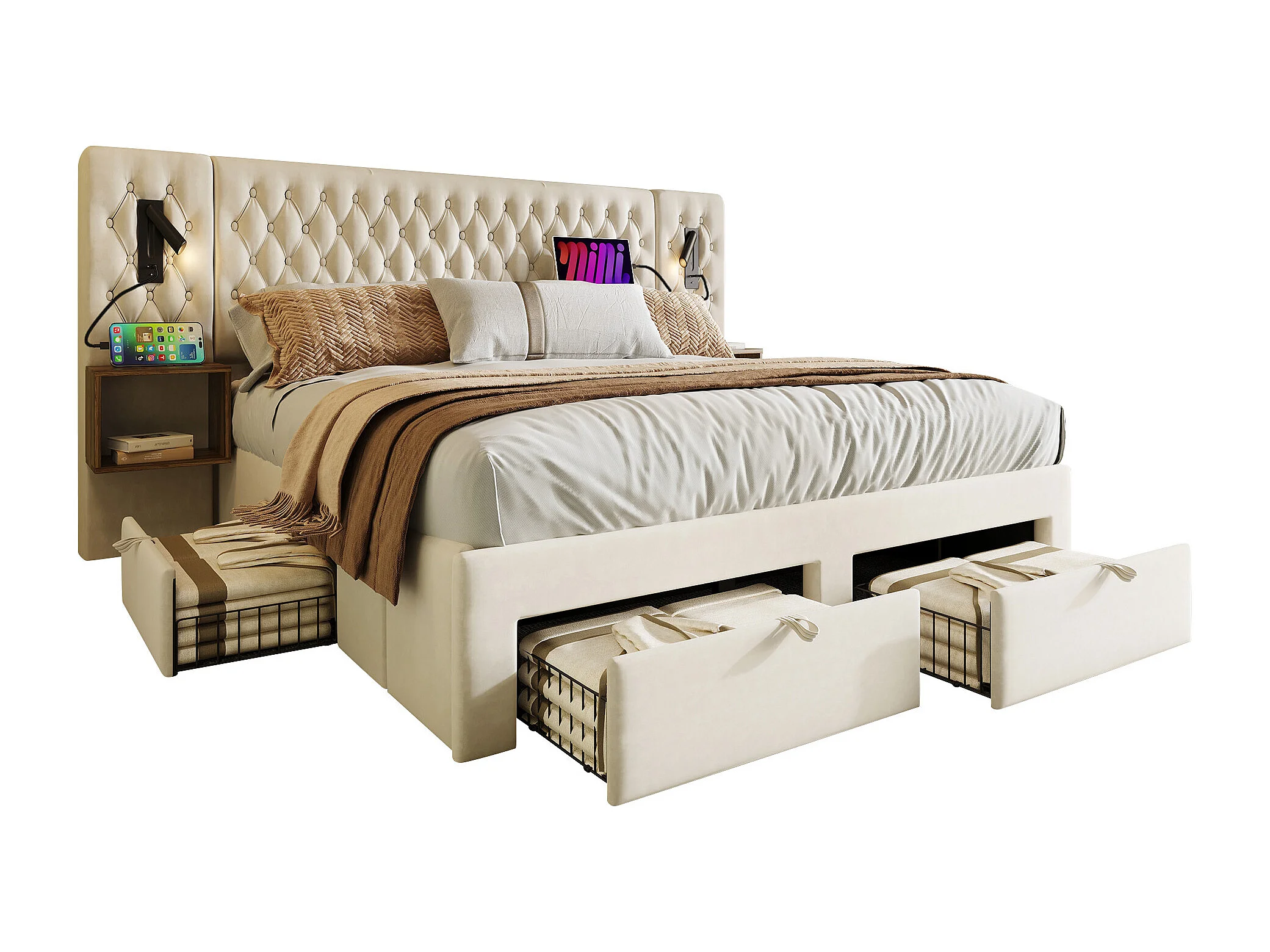 Erwachsenenbett 160 x 200 cm – mit LED- und USB-Beleuchtung, 4 Schubladen – beiger Samt – ohne Matratze