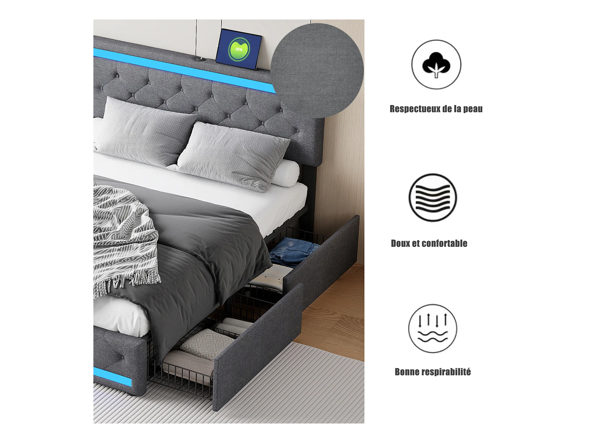 Erwachsenenbett 160x200 cm, LED, USB- und Typ-C-Anschlüsse, 4 Schubladen, Leinenstoff, Bettrahmen, Grau