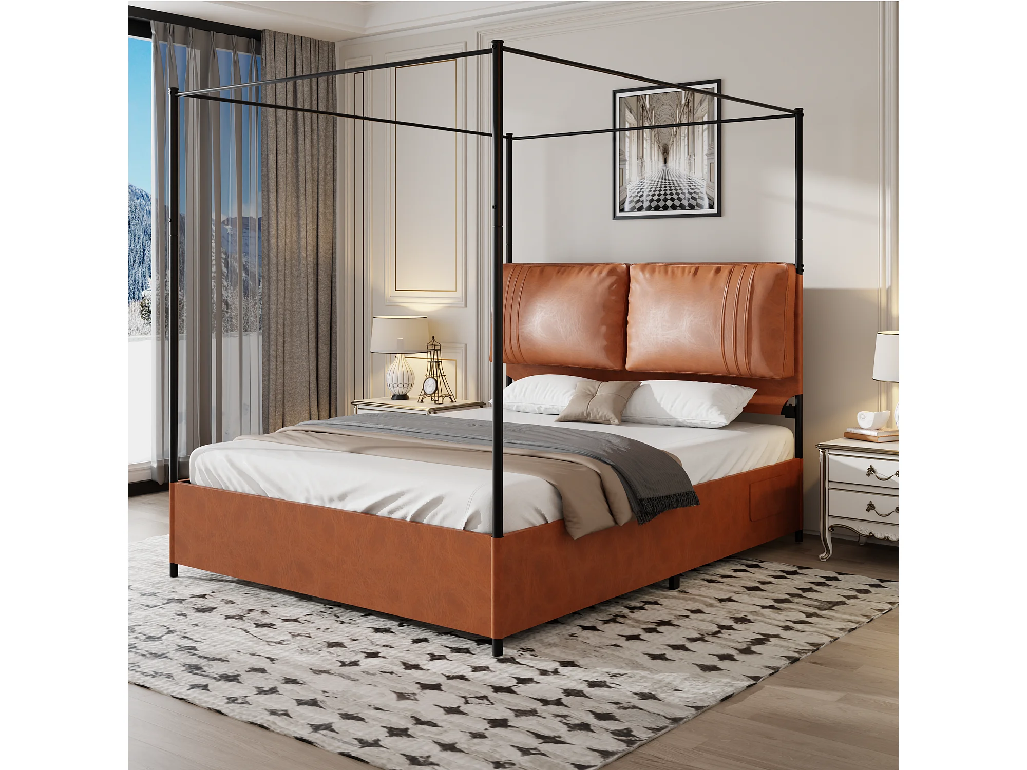 Erwachsenenbett 160x200 cm – mit 2 Kissen, PU-Leder, Lattenrost aus Metall – Braun – Matratze nicht enthalten