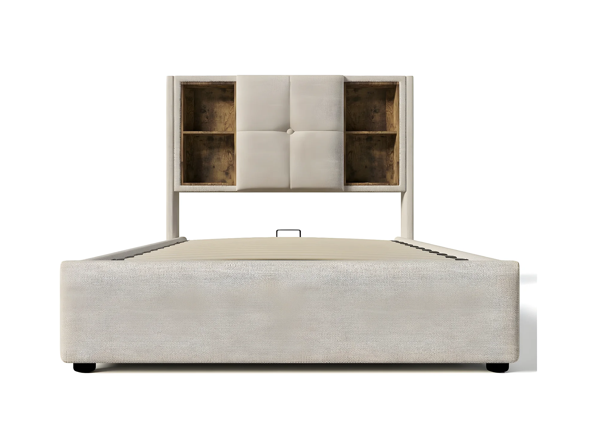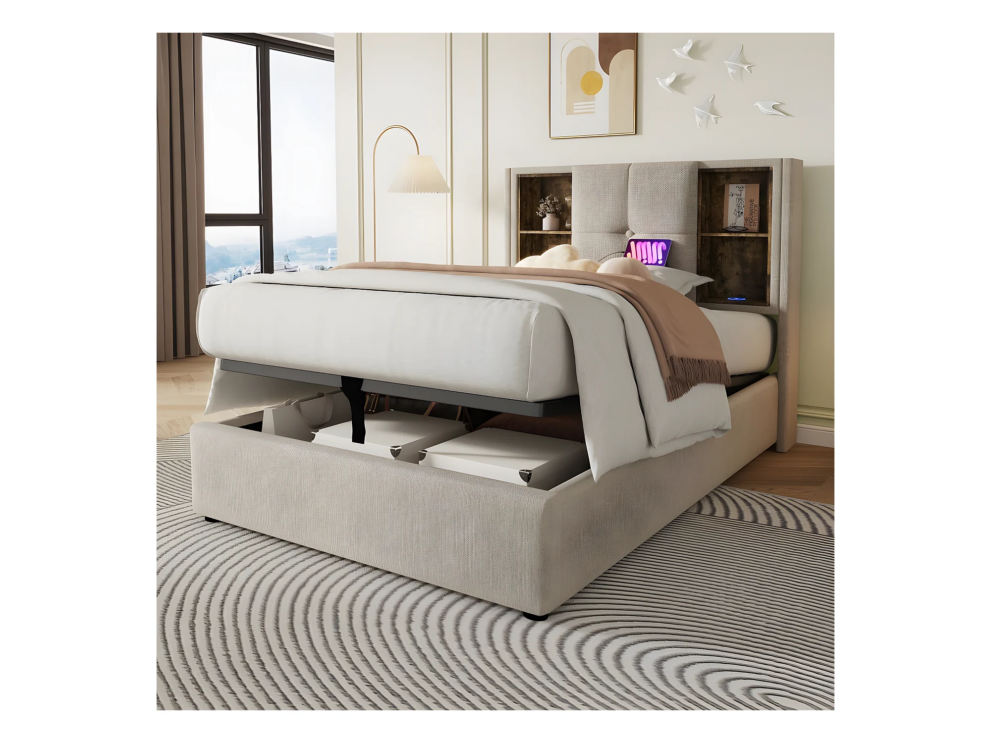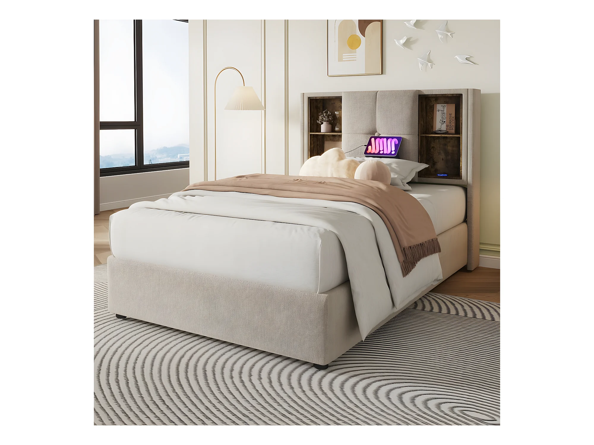 Erwachsenenbett, Einzelbettrahmen 90x200 cm, mit Stauraum, mit kabelloser Ladefunktion USB C, Holz und natürliches Leinen (Matratze nicht enthalten).