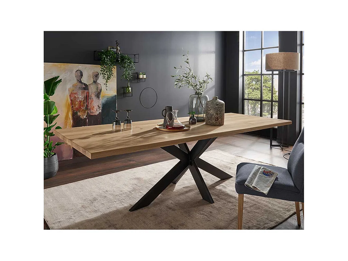 Esstisch aus Wildeiche Massivholz und Stahl Spider Gestell