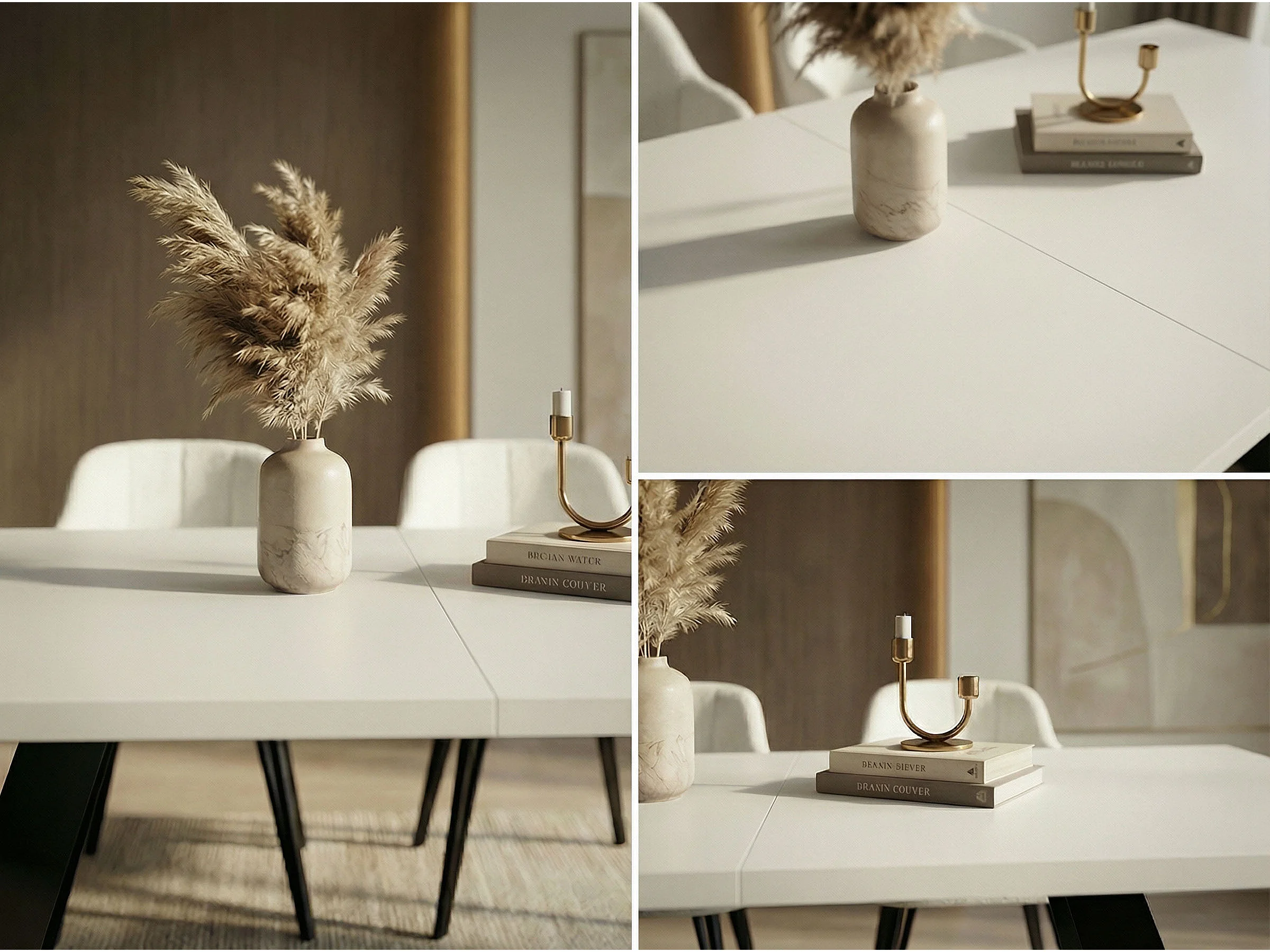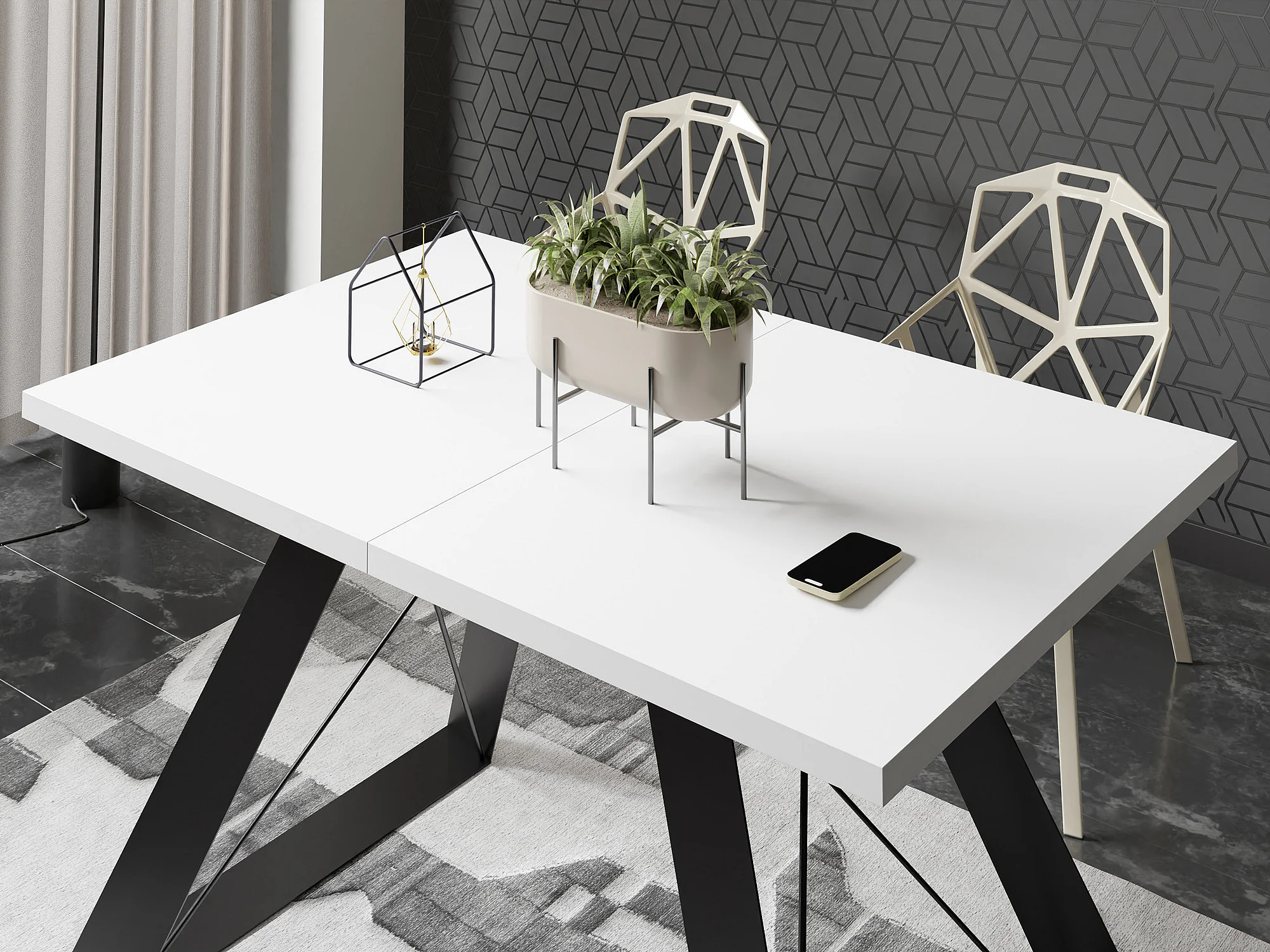 Esstisch Colter Schwarz im Modern Still, Rechteckig Tisch - Ausziehbar von 160 cm bis 260 cm, Pulverbeschichtete Weiße Metallbeine - 160 x 80 cm - Weiß