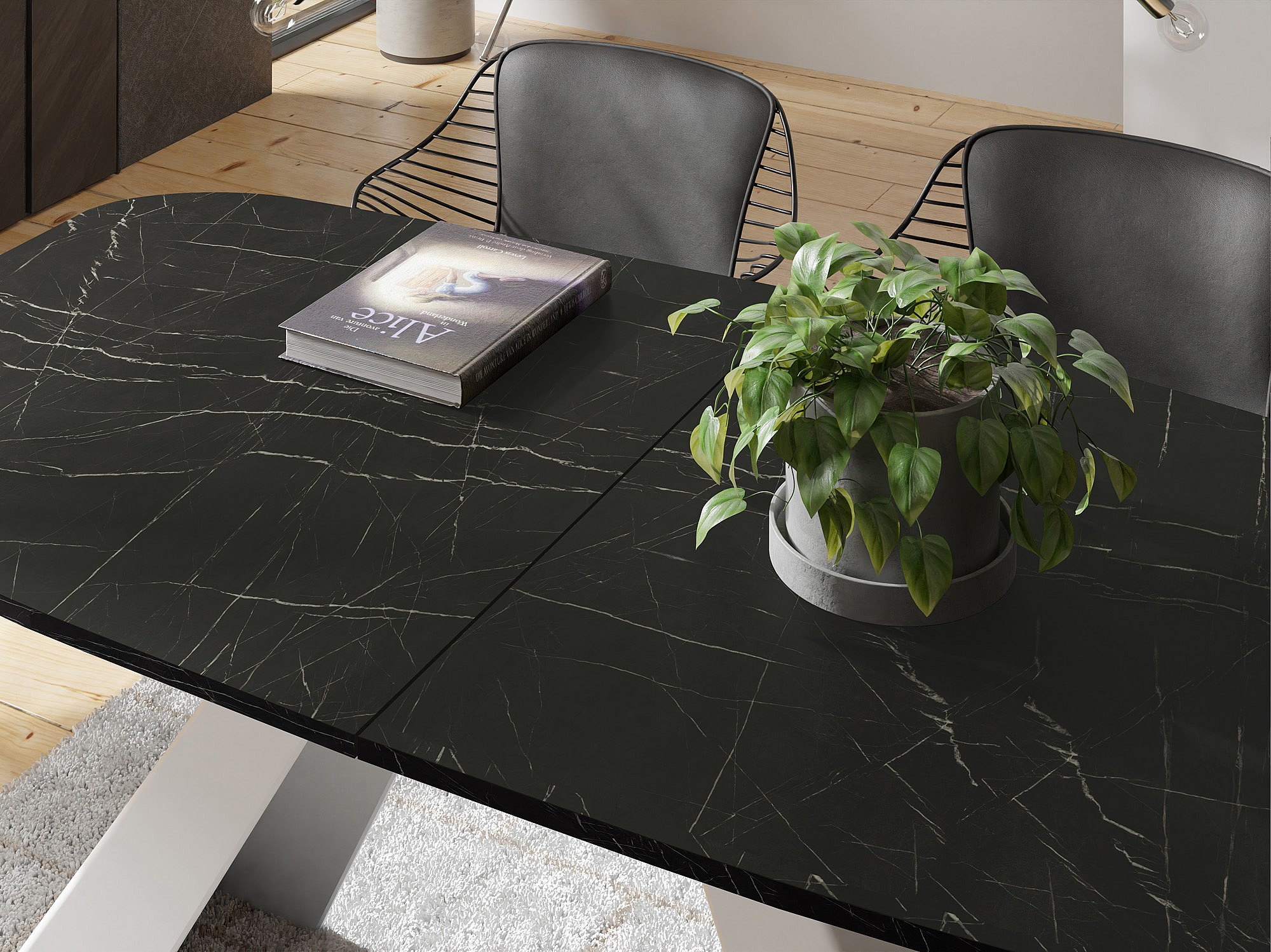 Esstisch Monte Weiß im Modern Stil, Rechteckiger Tisch - Ausziehbar von 180 cm bis 220 cm, Pulverbeschichtete Weiße Metallbeine - 180 x 90 cm - Marmor Schwarz