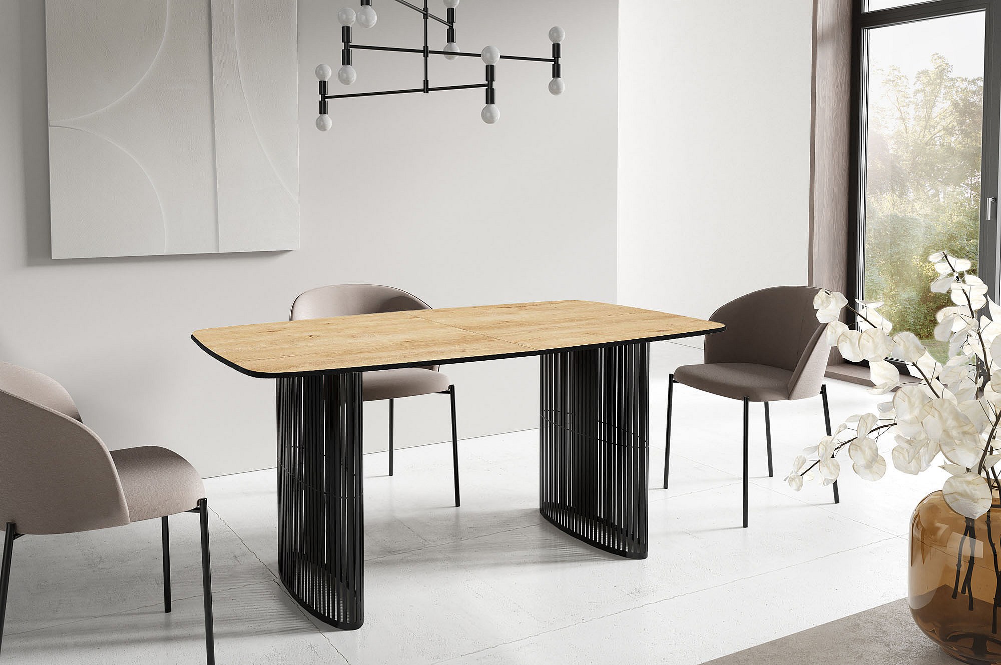Esstisch Rechteckig Ausziehbar mit Lamellen im Loft-Stil – 200 bis 280 cm – Schwarzen Metallbeinen, Abgerundeten Ecken – für 12-16 Personen – Wohnzimmer – Braun