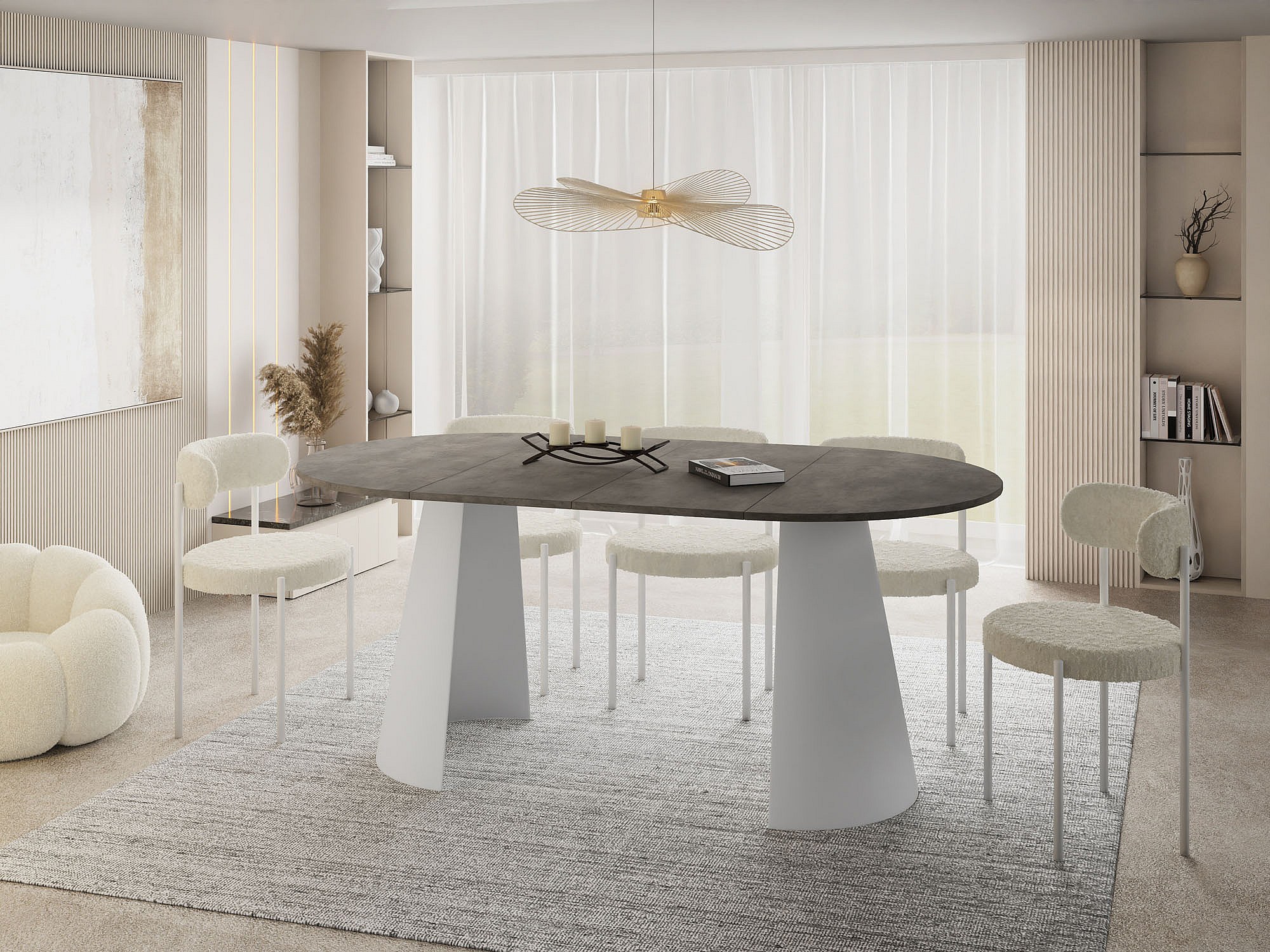 Esstisch Rund Ausziehbar im Loft-Stil – 100 cm – Industrieller Tisch mit Weißen Konischem Metallbeinen für 5-8 Personen, Wohnzimmer – Beton-Optik Dunkelgrau